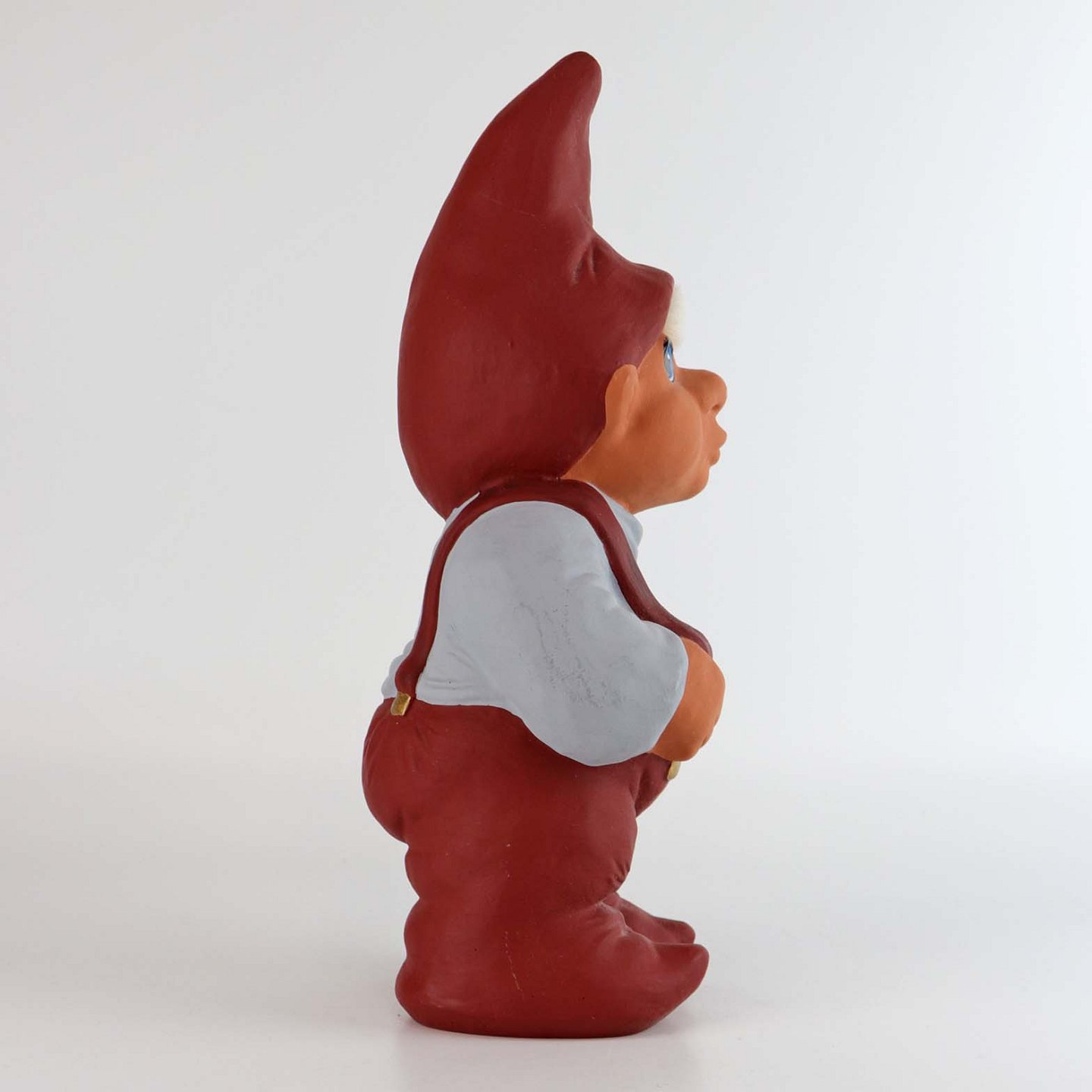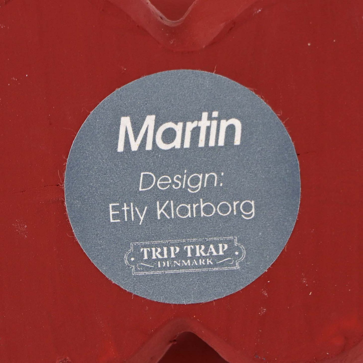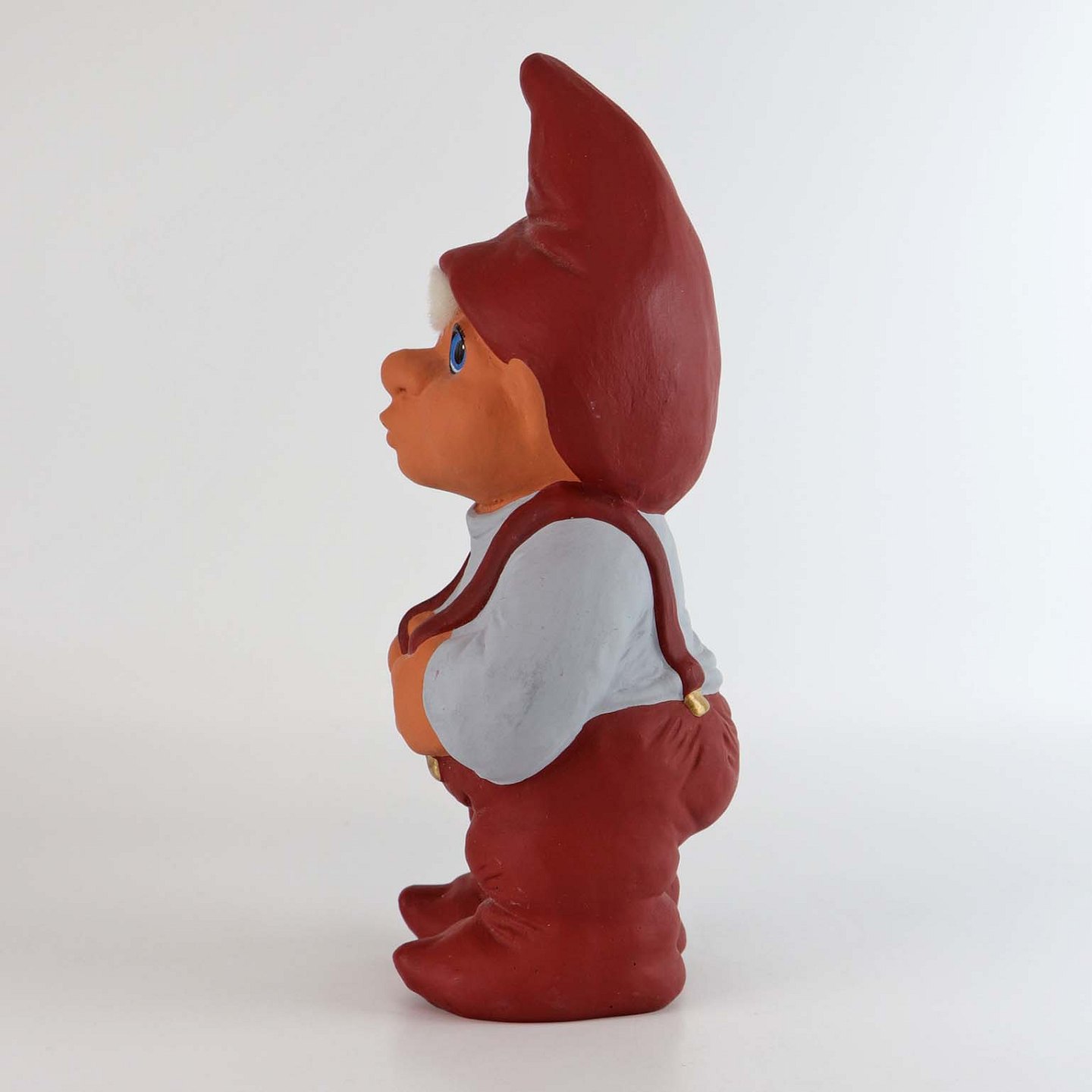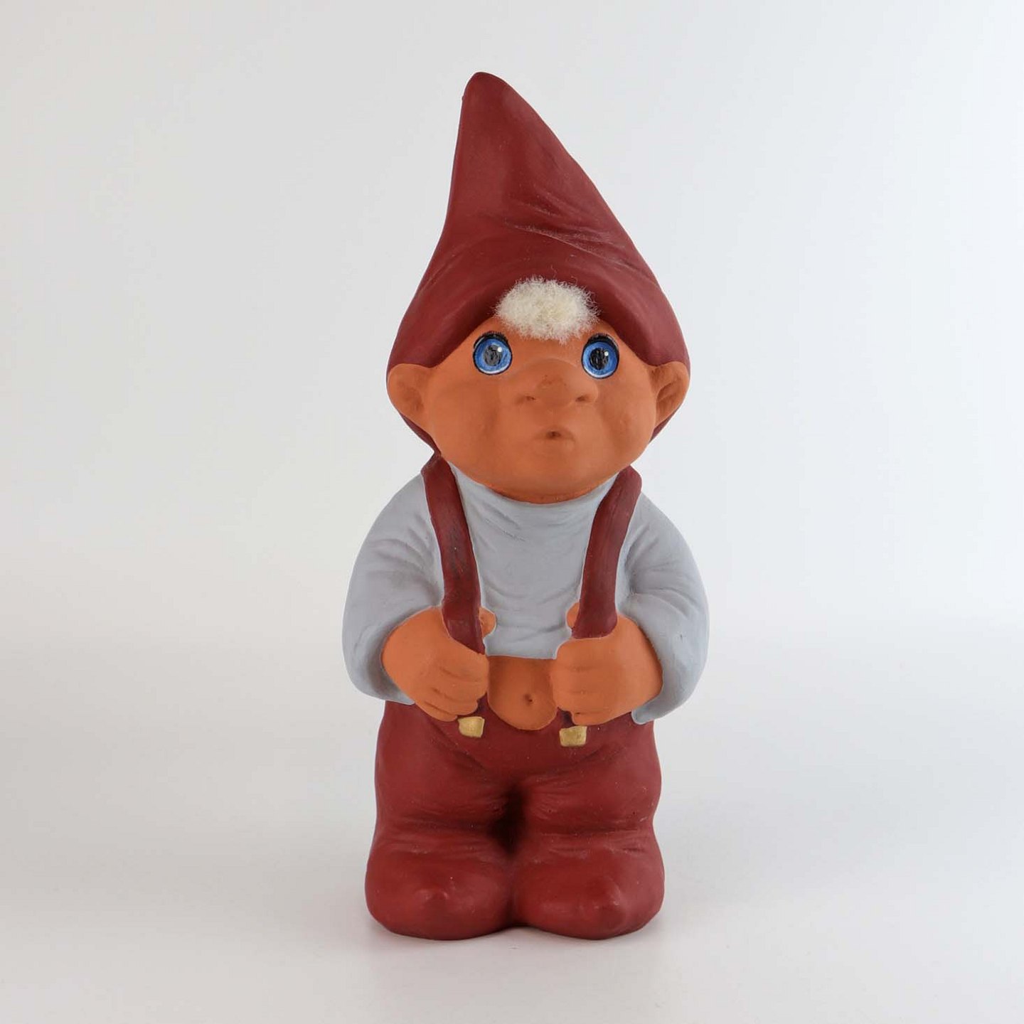 Figur af Nissen Martin, som har hænderne omkring selerne der holder hans røde bukser oppe og er iført rød nissehue. Figuren kommer med tilhørende boks.