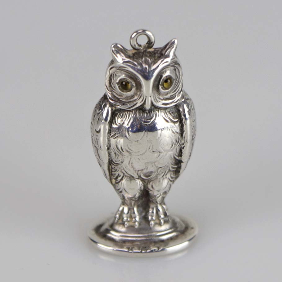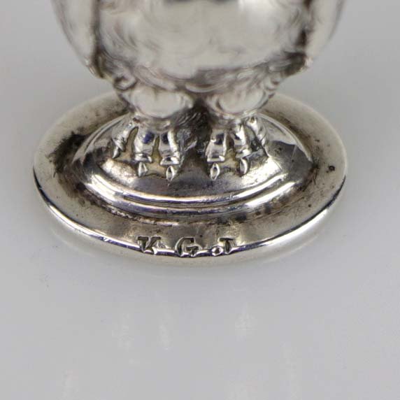 Signatur stempel i 830 sølv udformet som en ugle, der også kan bruges som halskæde vedhæng. Stempel har et gotisk mongram og ved foden er indgraveret K.G.J