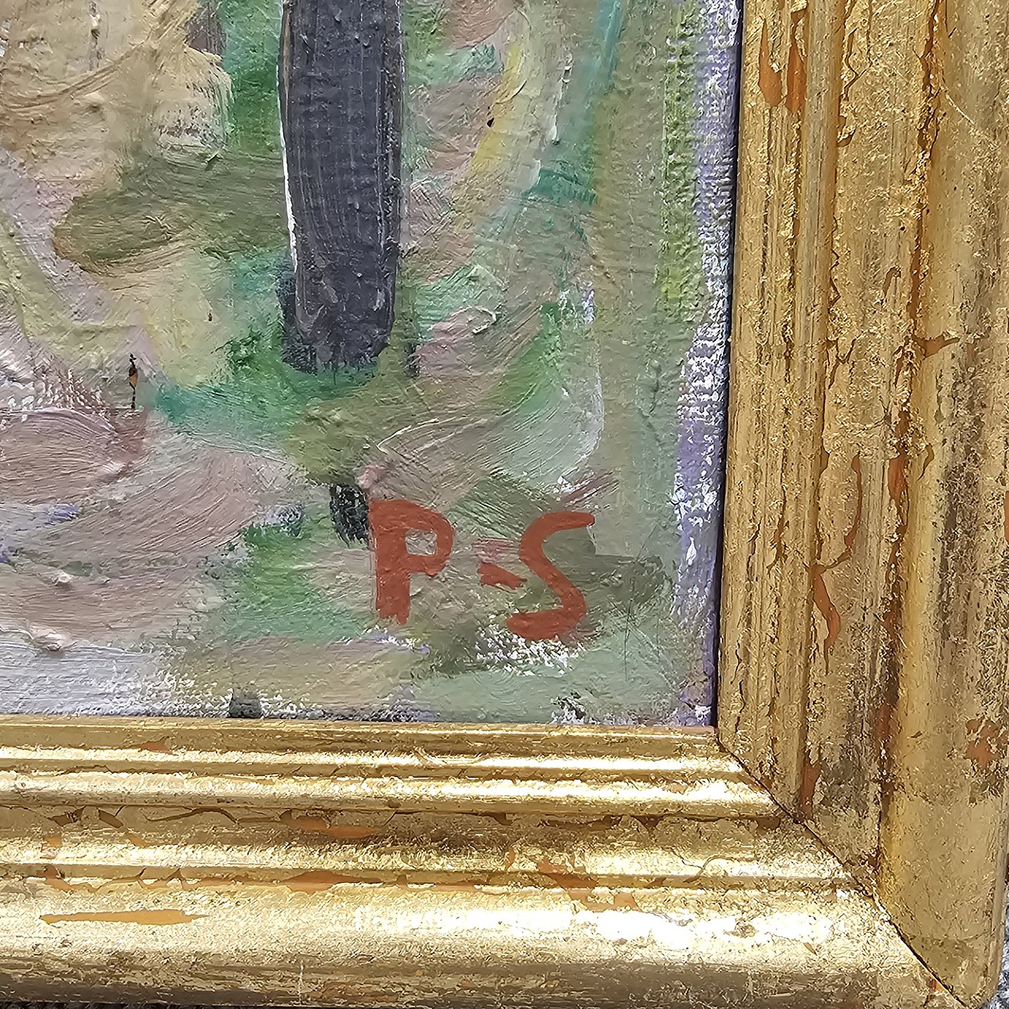 Maleri af olie på lærred. Motiv af hvide hus, gult hus og et rødt hegn