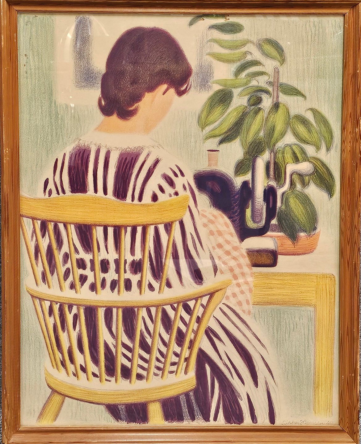 Tryk på papir med motiv af en kvinde med ryggen til, siddende ved en symaskine