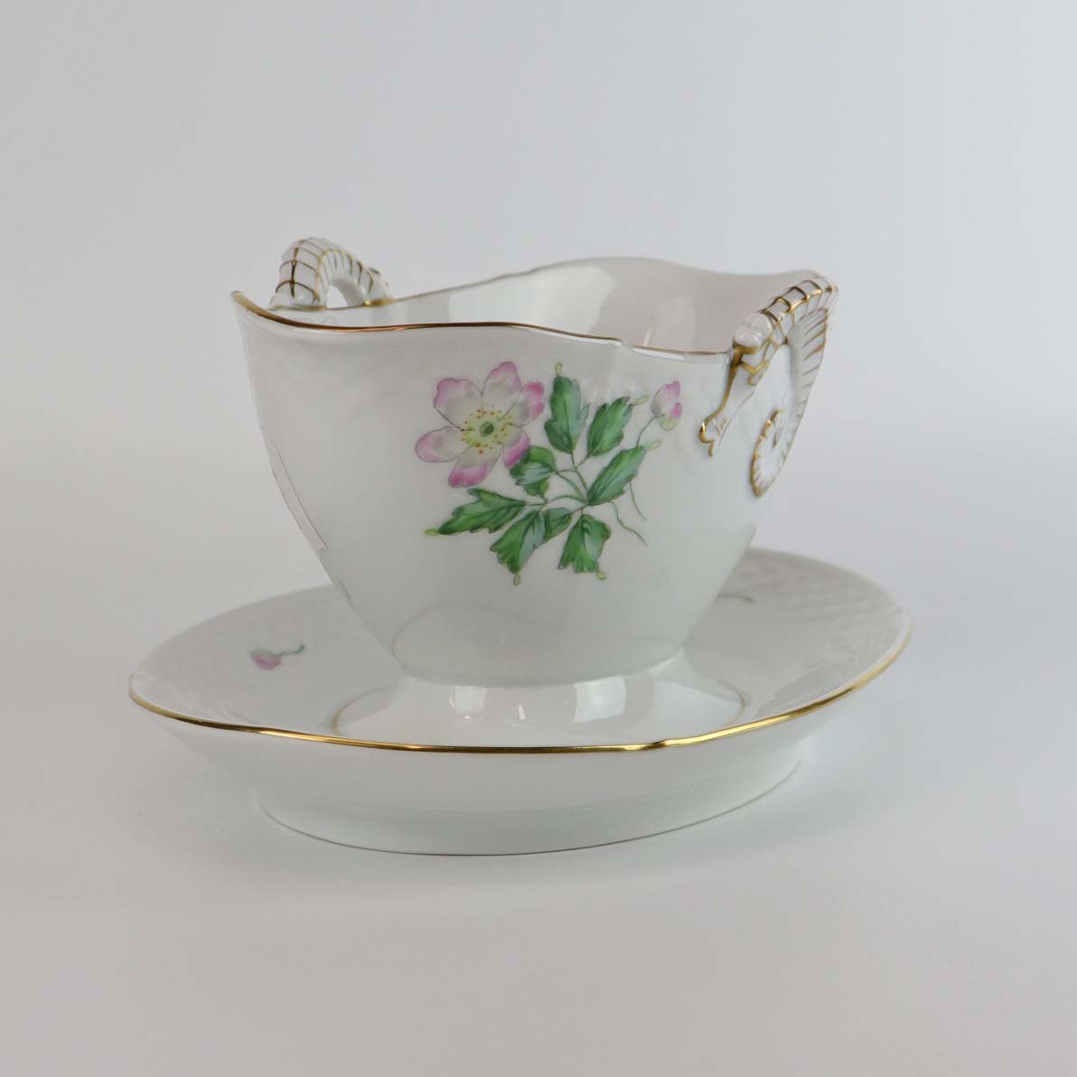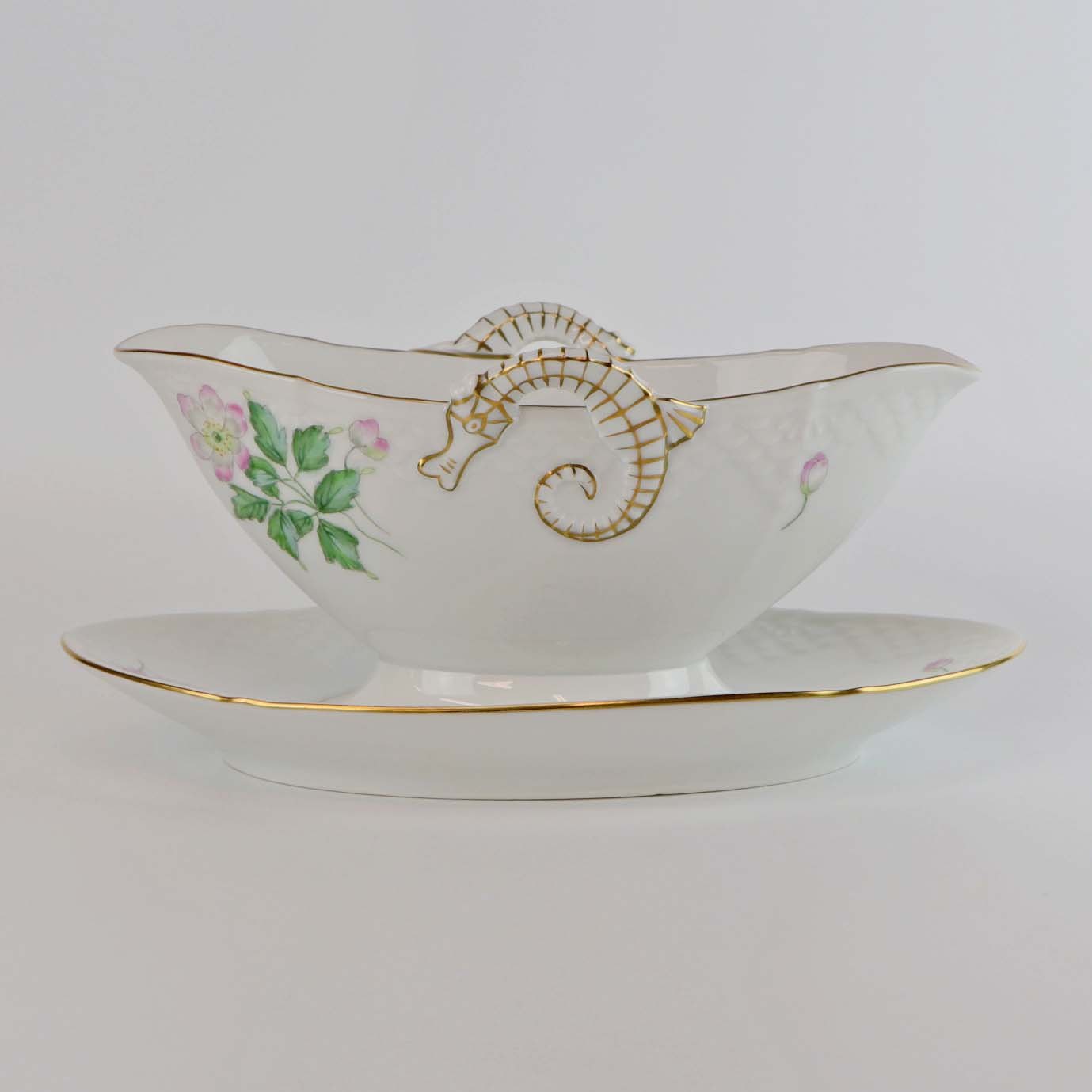 Anemone Macbeth er af hvidt glaseret porcelæn, dekoreret med håndmalede lyserøde anemoner og gylden kant