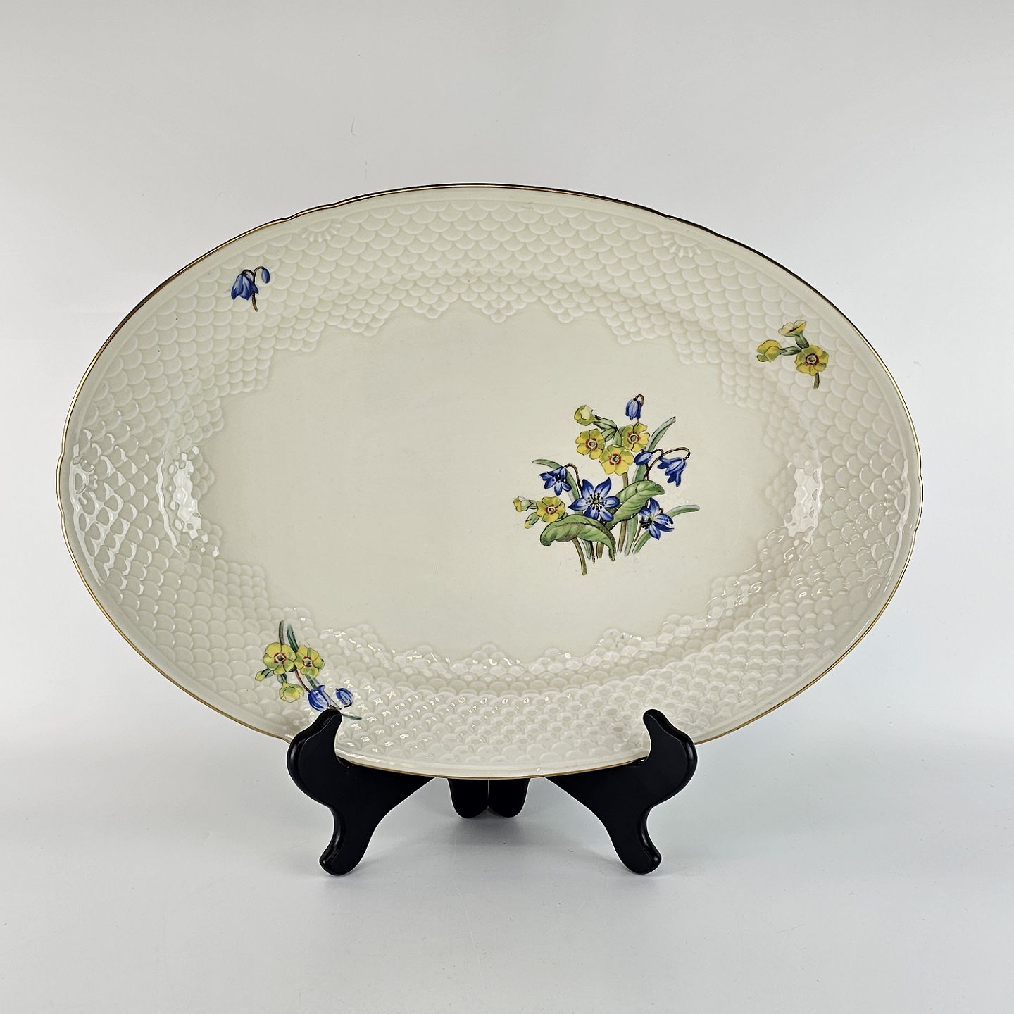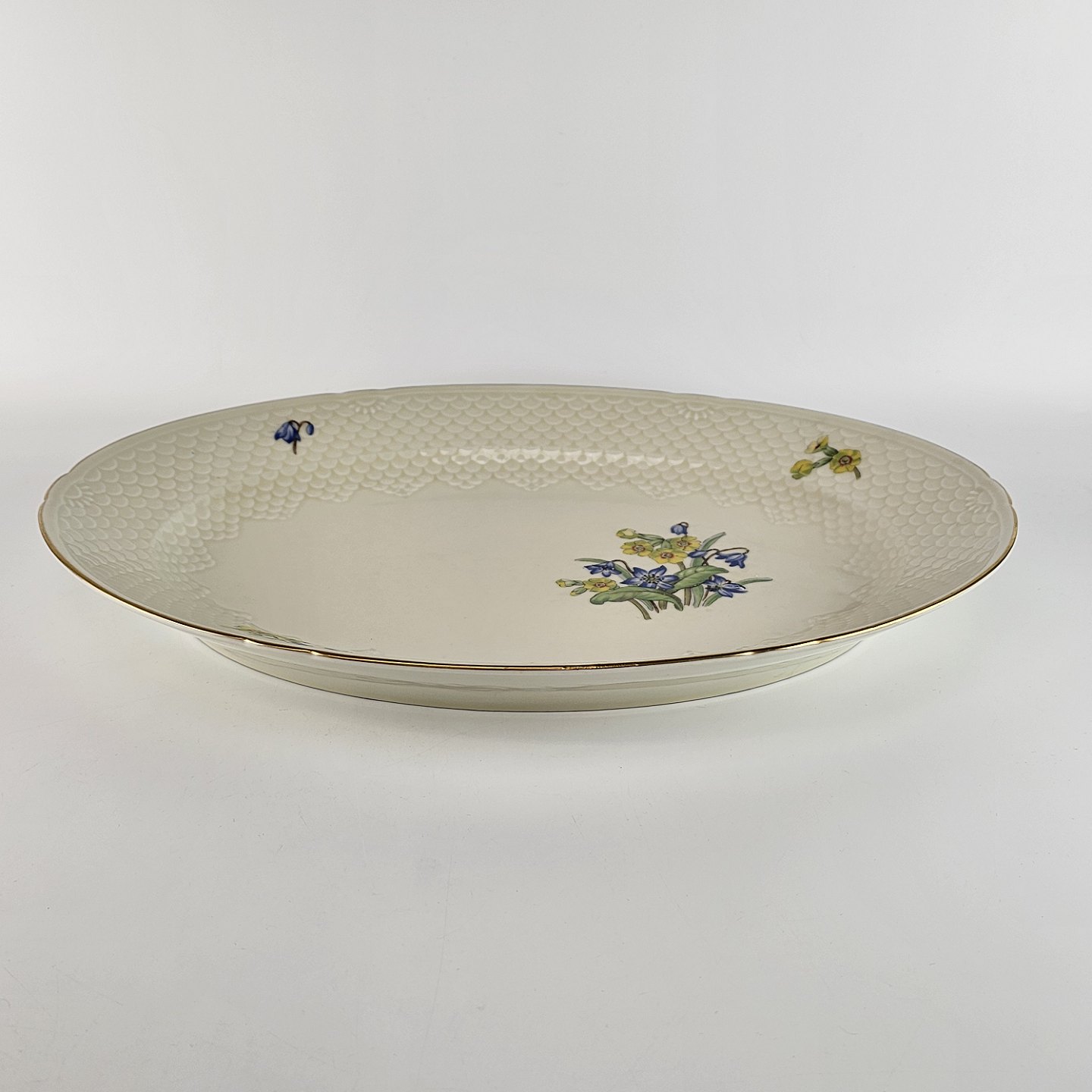 Njal er af creme farvet glaseret porcelæn, præget med skæl lignende mønster. Stellet er dekoreret med gul og blå blomster samt mønster af guld i kanten. Lettere brugsspor kan forekomme