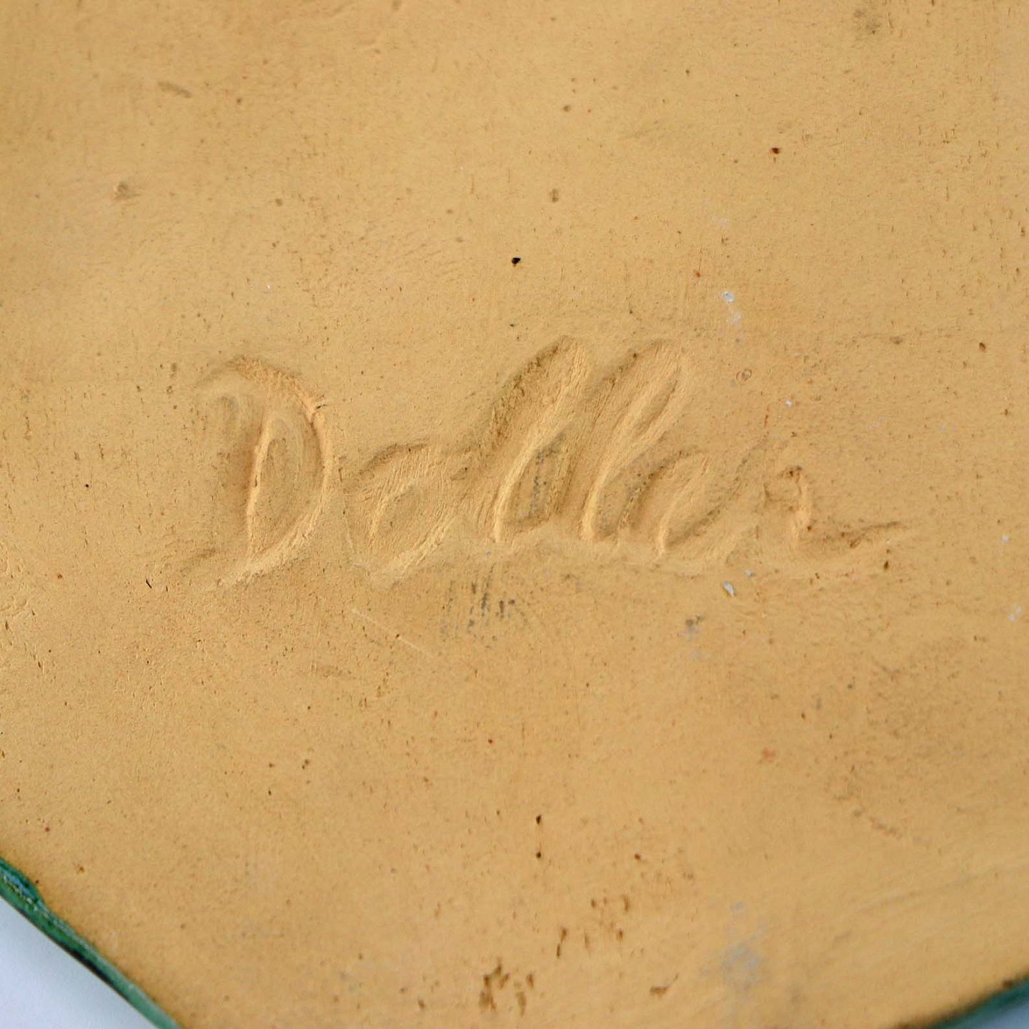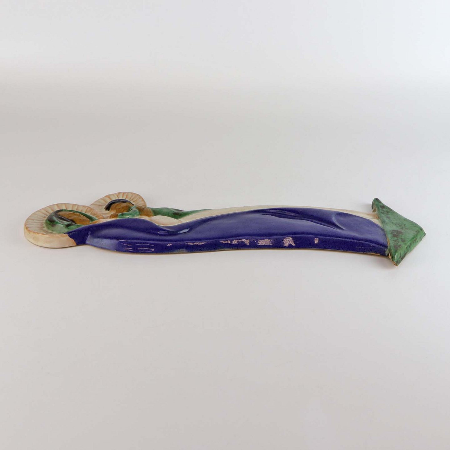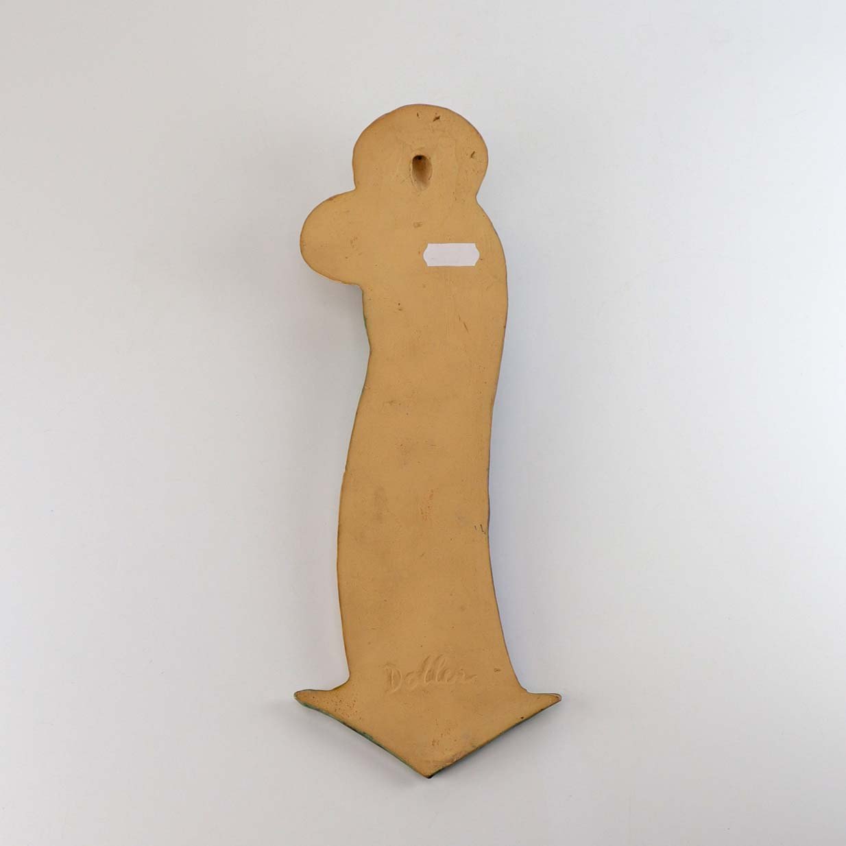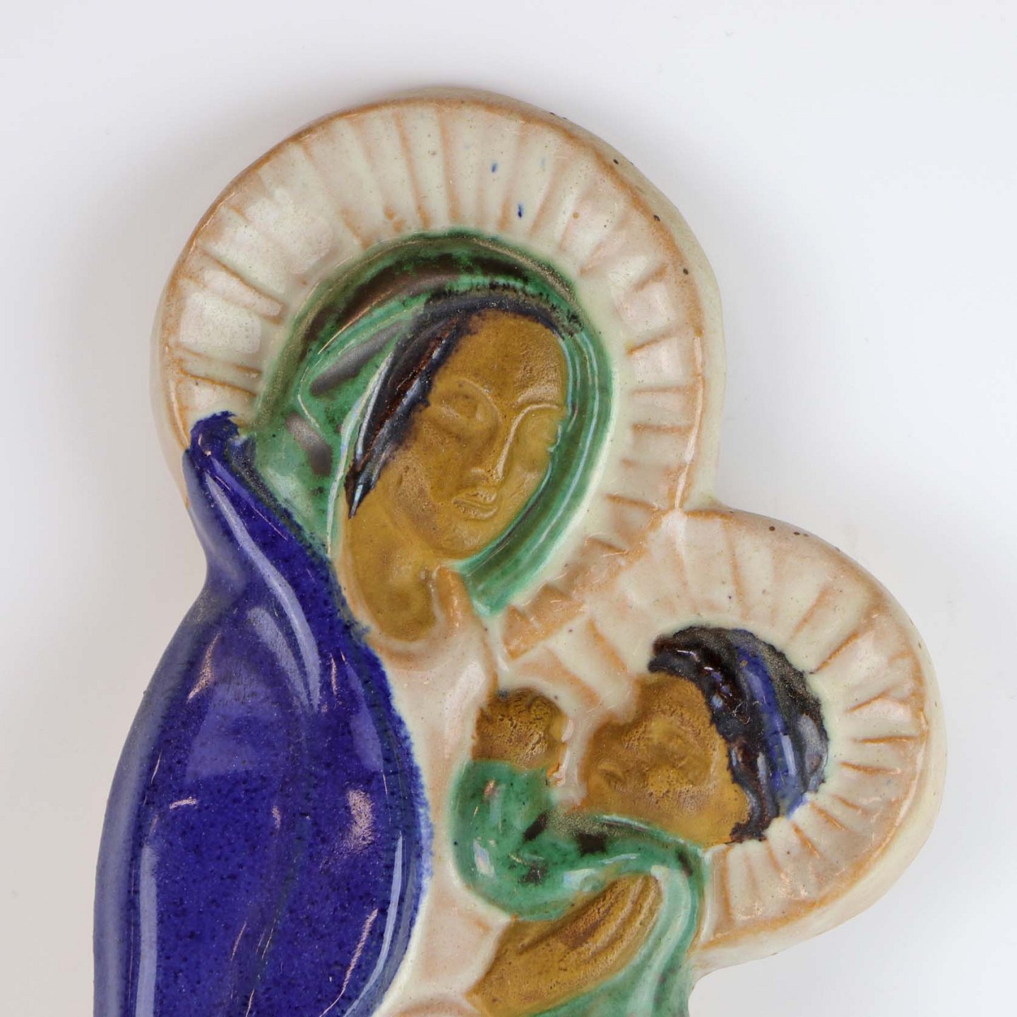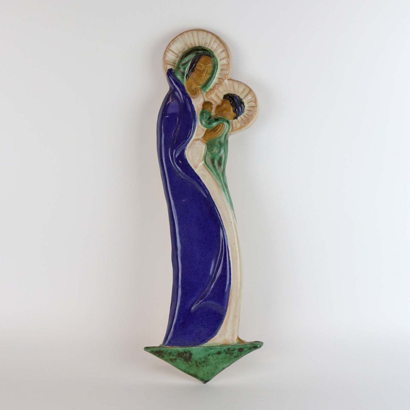 Relief i keramik med motiv af Jomfru Maria, som holder Jesus barnet