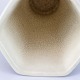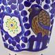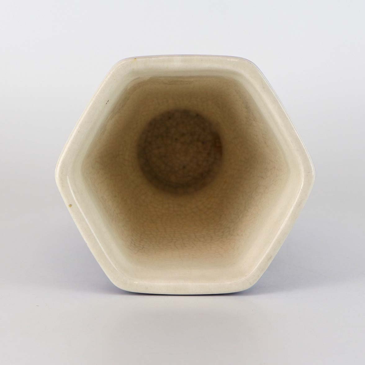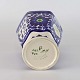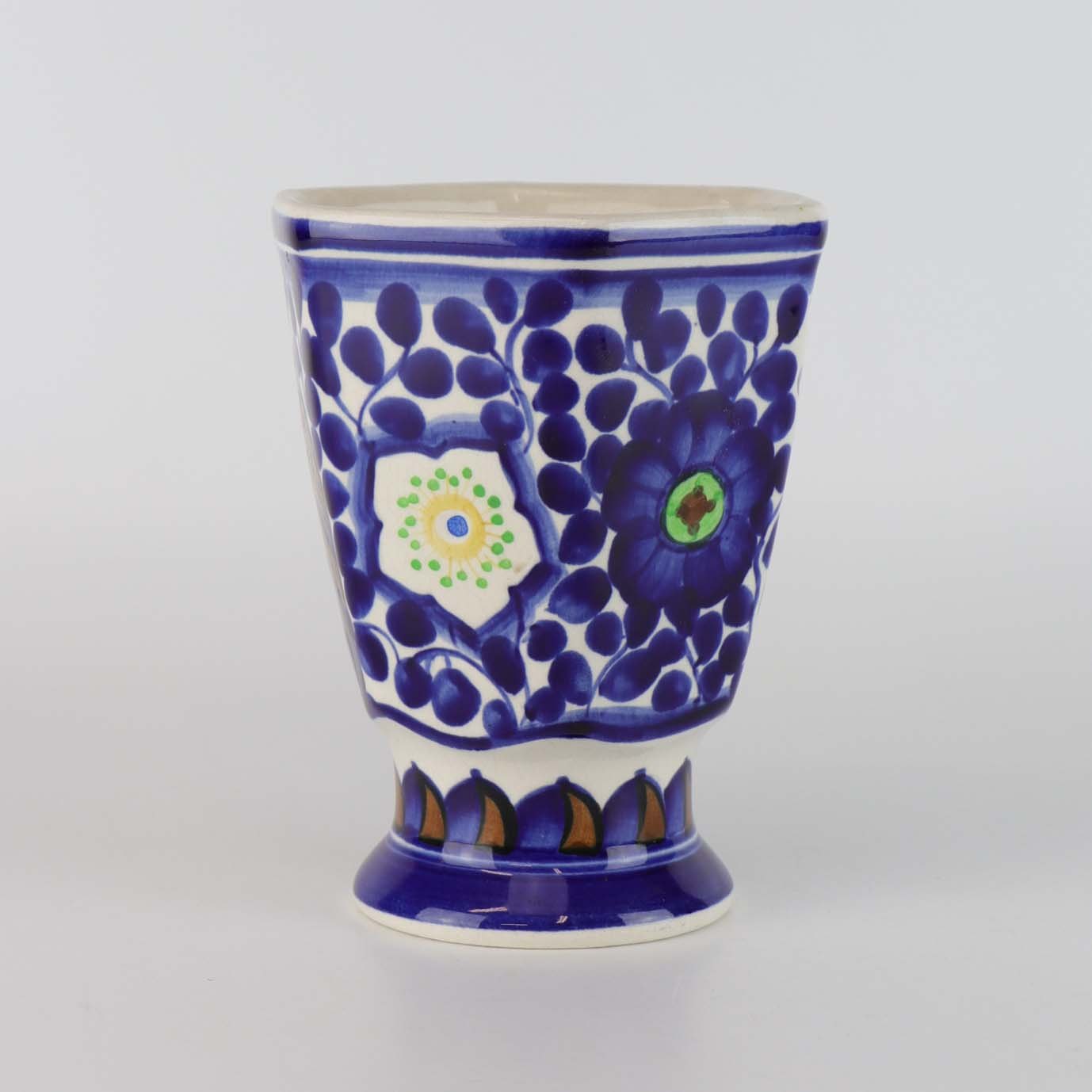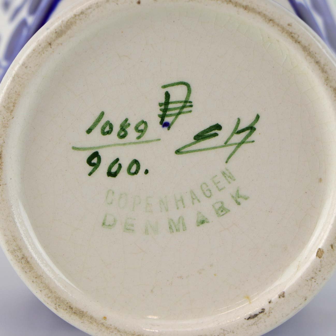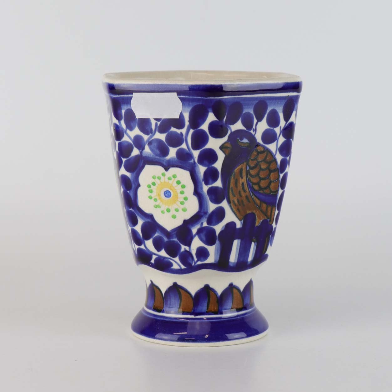 Sekskantet vase i fajance med teksten Jul 1915 og motiv af en fugl samt blomster blandt blå ranker på lys baggrund. Nr. 1089/900