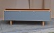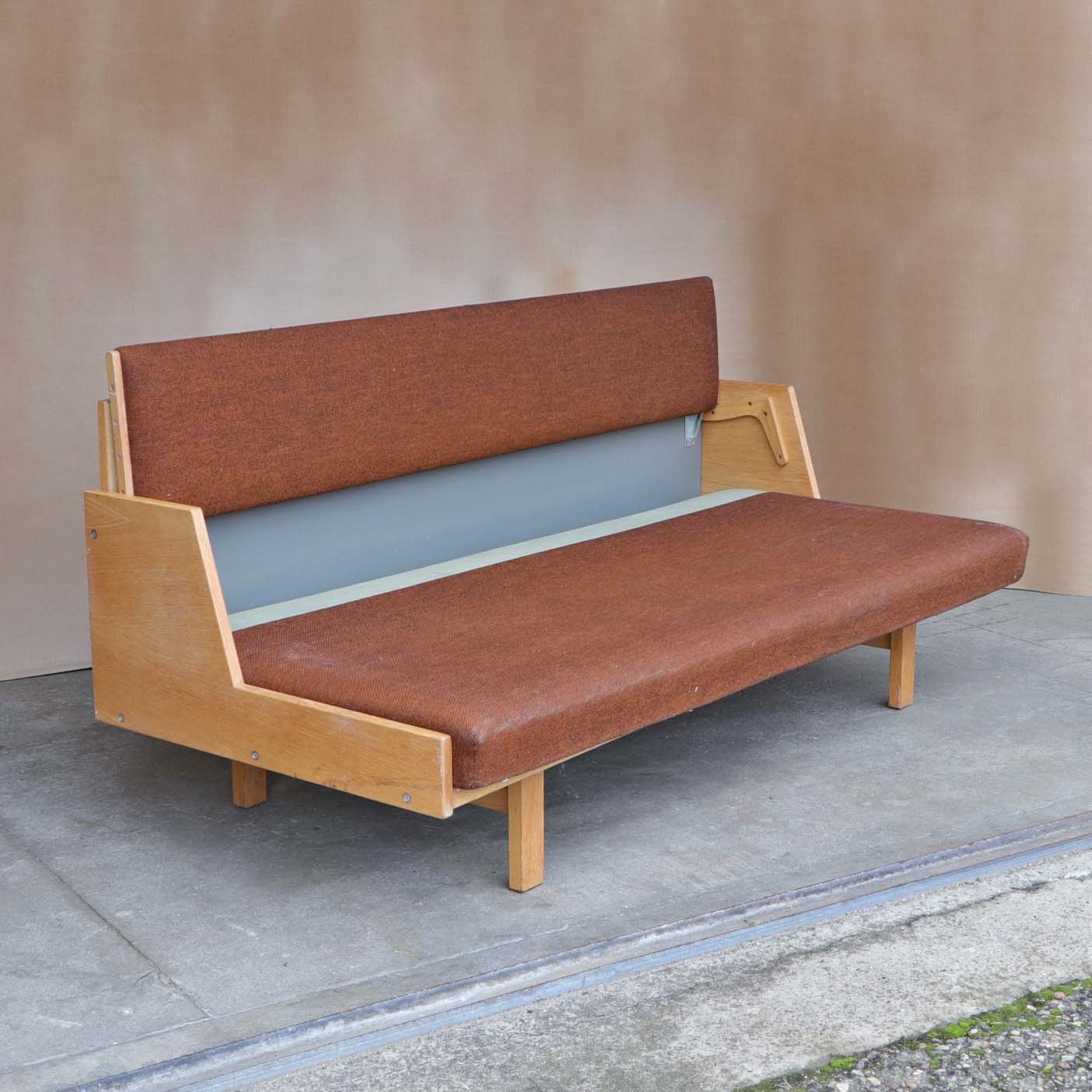 Tre personers sofa med stel i lakeret egetræ. Sæde og ryglæn er betrukket med meleret brunt uldstof. Model GE 258