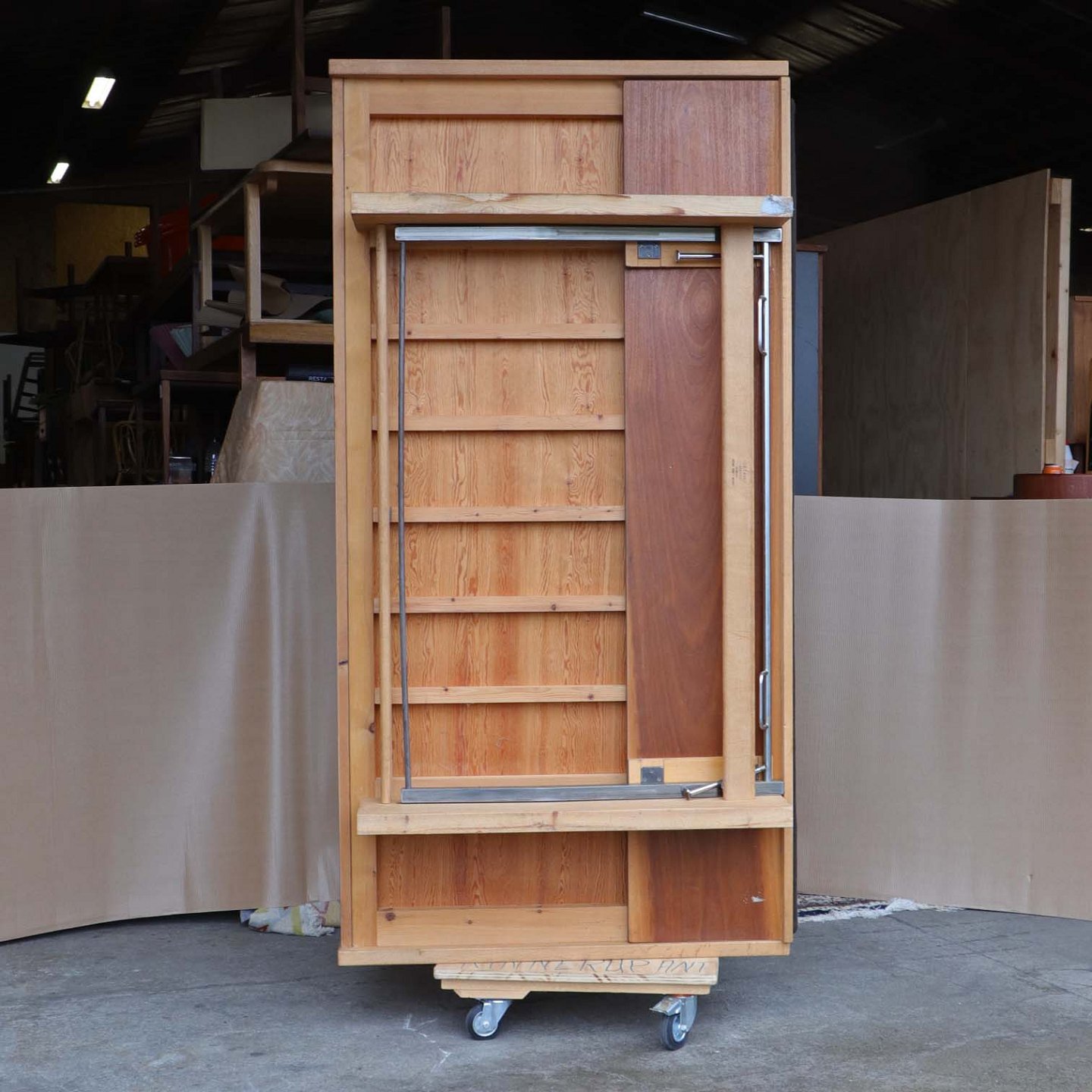 Tre personers sofa med sove-udtræk og stel i lakeret egetræ. Sæde og ryghynde er med springfjeder og betrukket med mørkebrunt uldstof . Møblet er en sovesofa, som udtrukket kan rumme to personer. Model GE-77