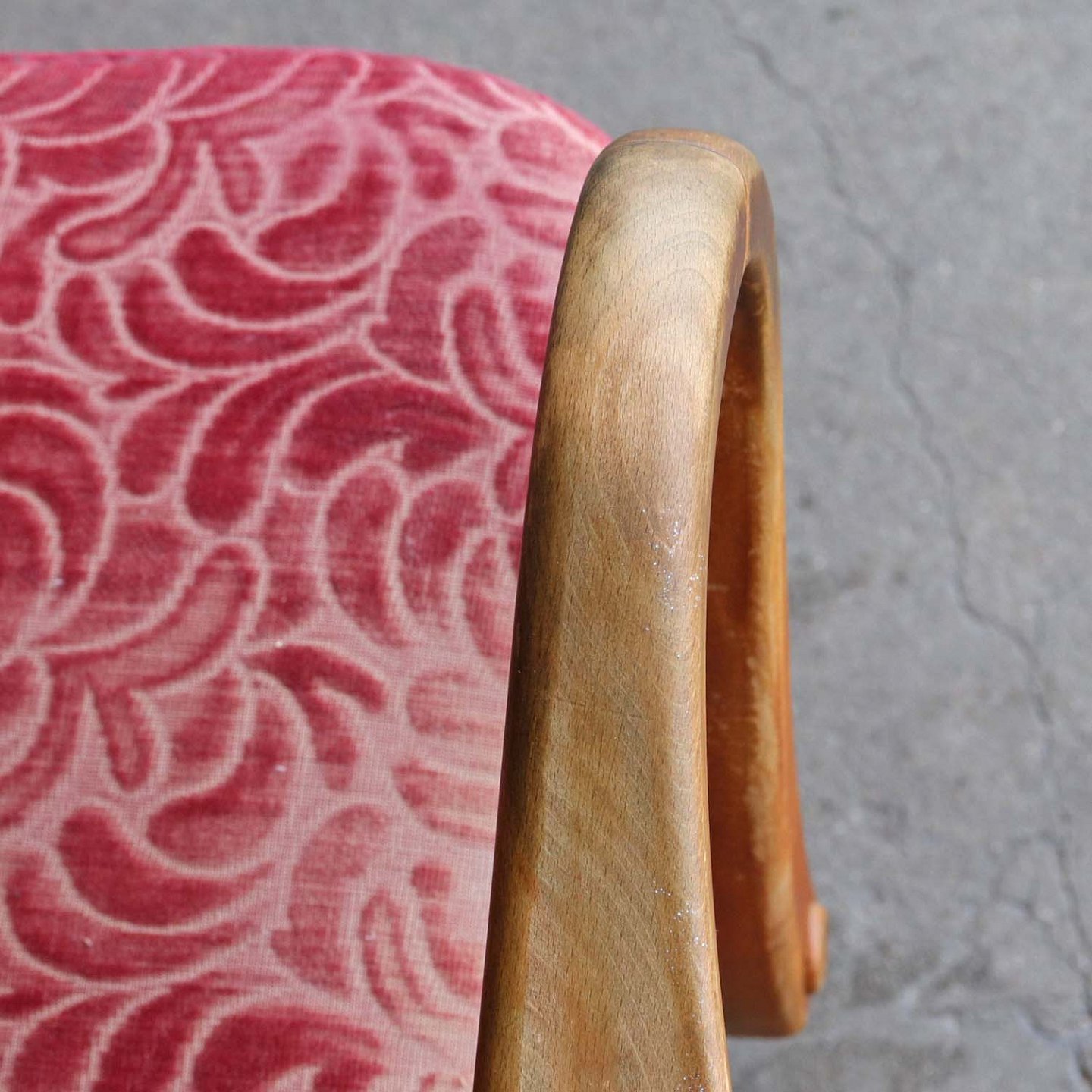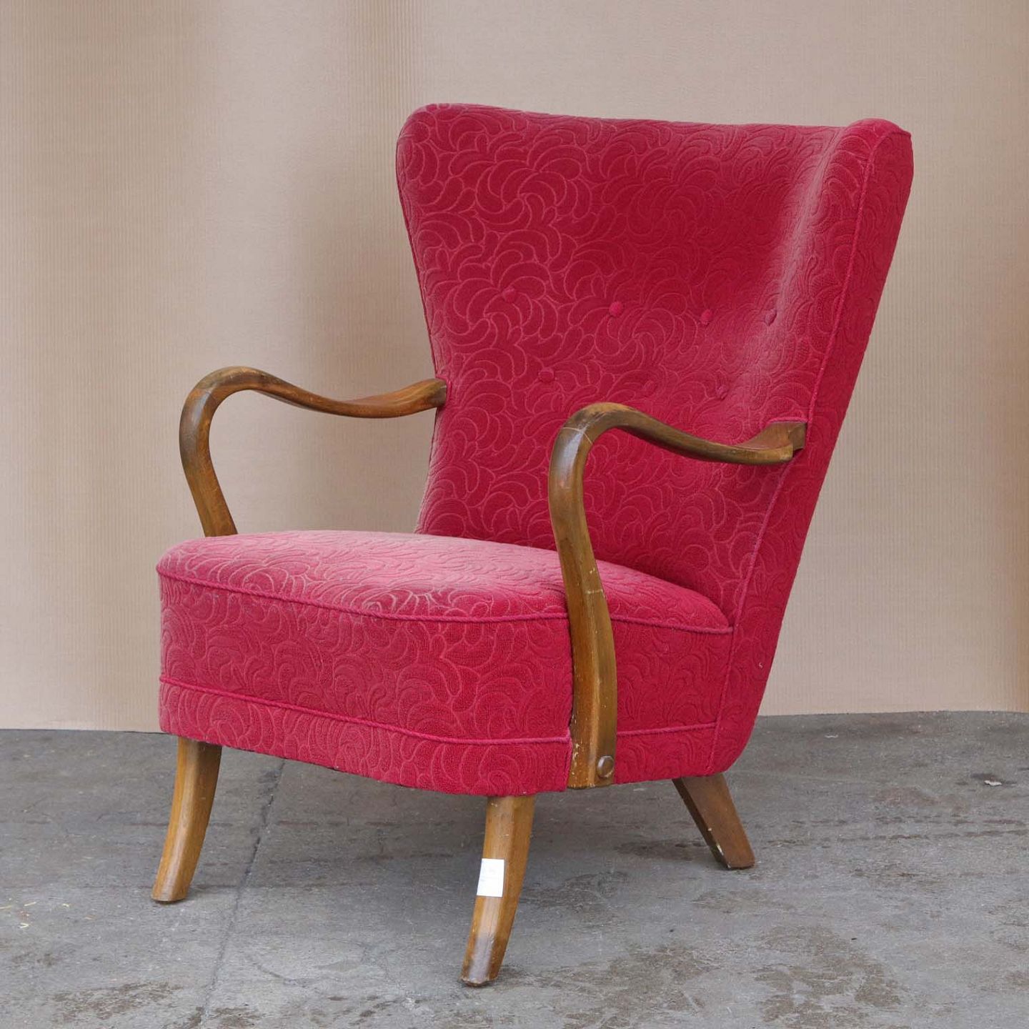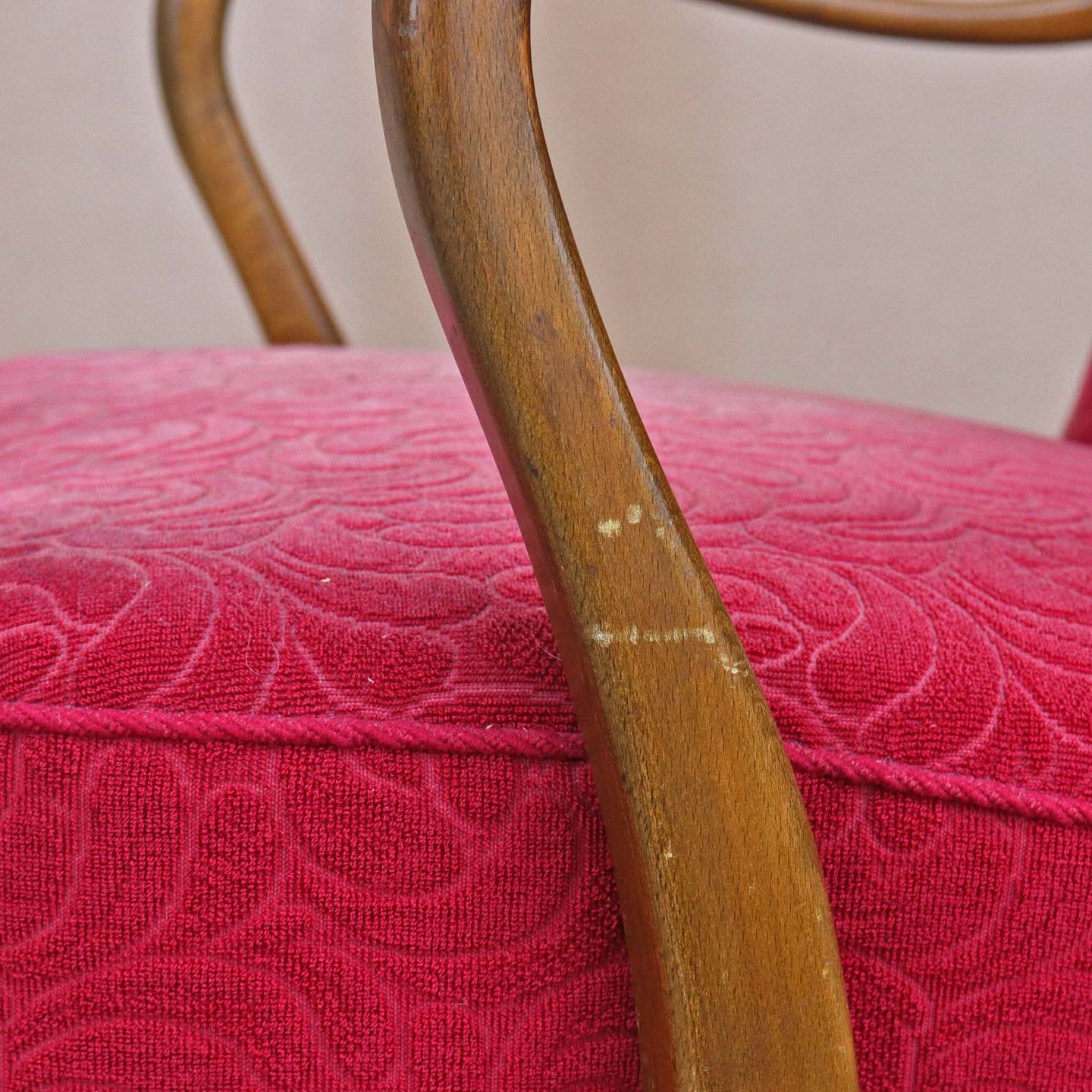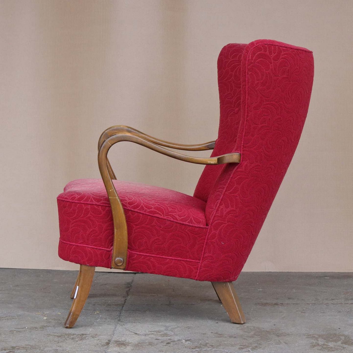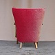 Ældre lænestol med stel i lakeret bøgetræ. Stolen har springfjeder sæde og er betrukket med struktureret rødt stof