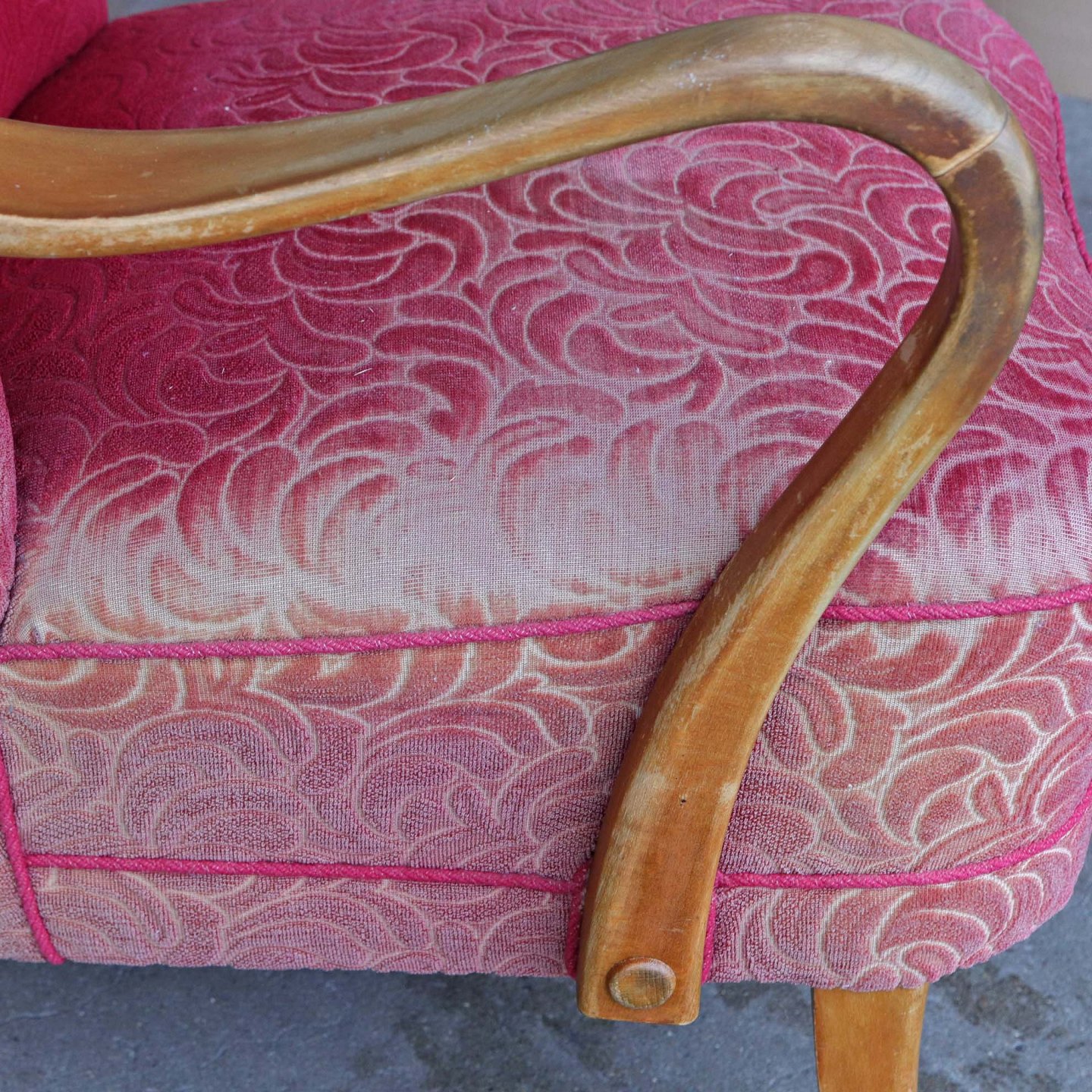Fremstår med brugsspor på stel samt slidt og solfalmet stof. Trænger til ompolstring