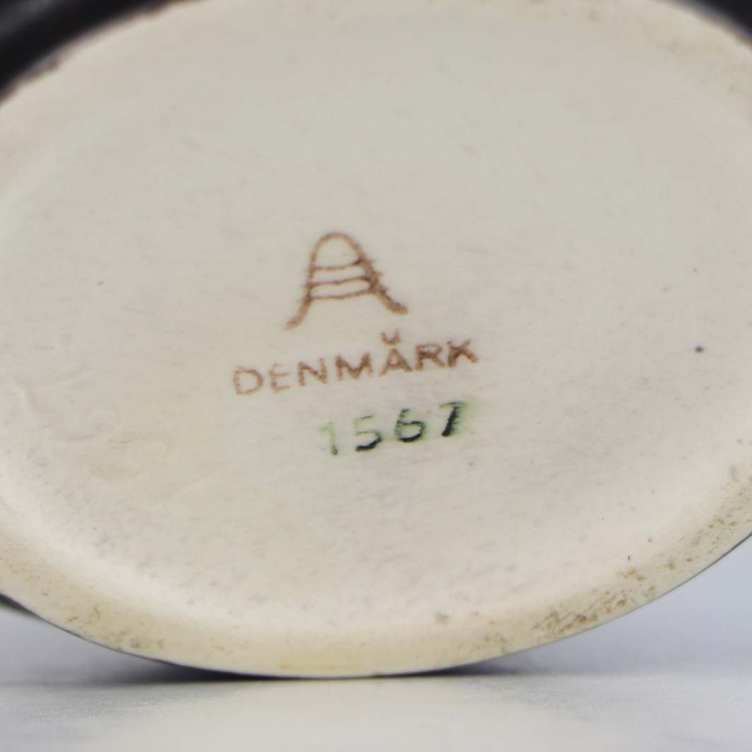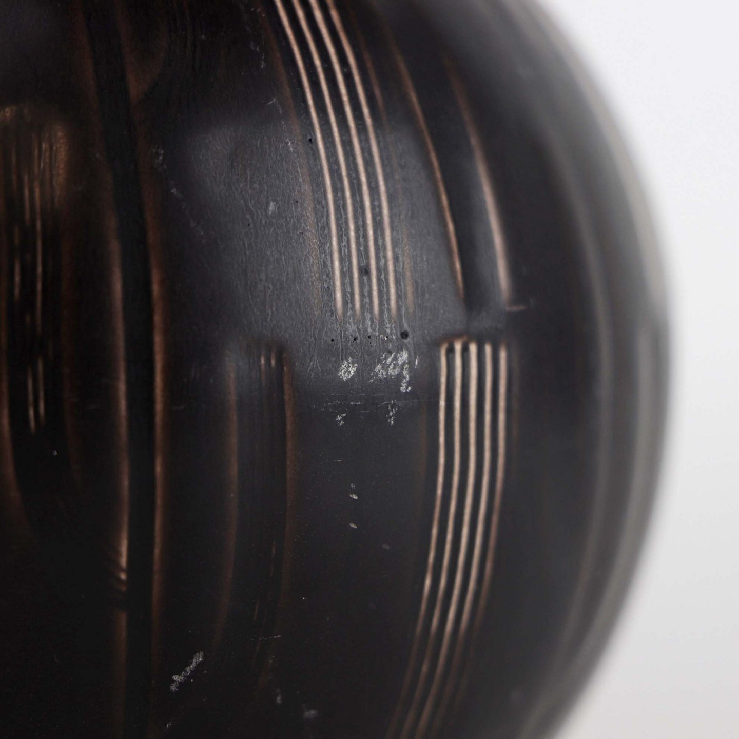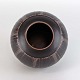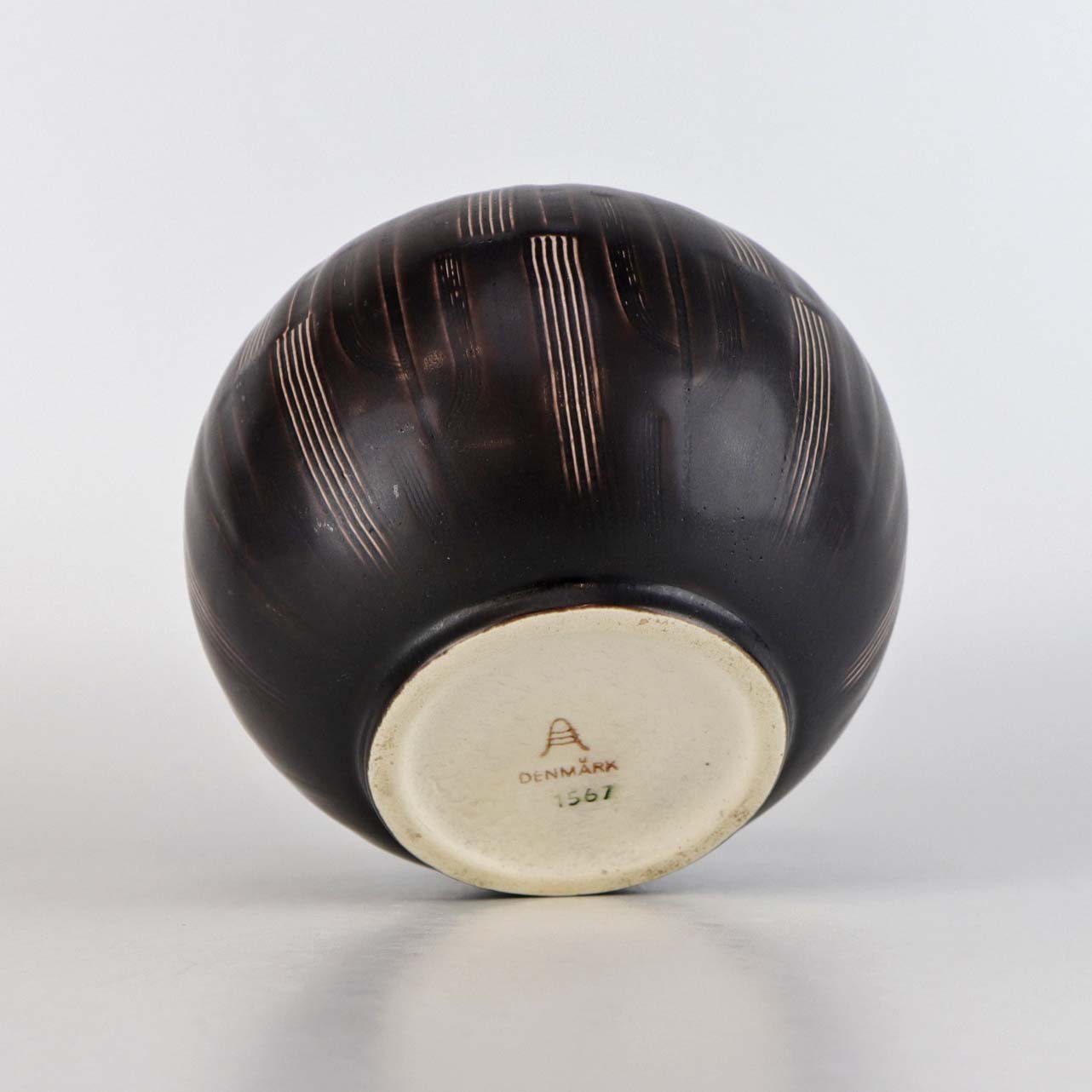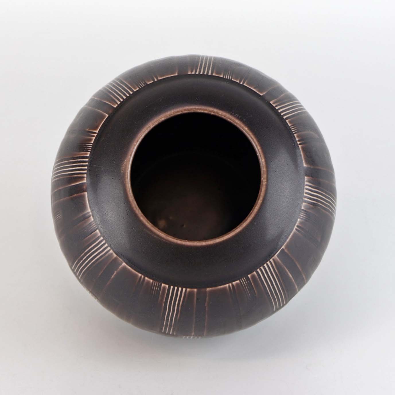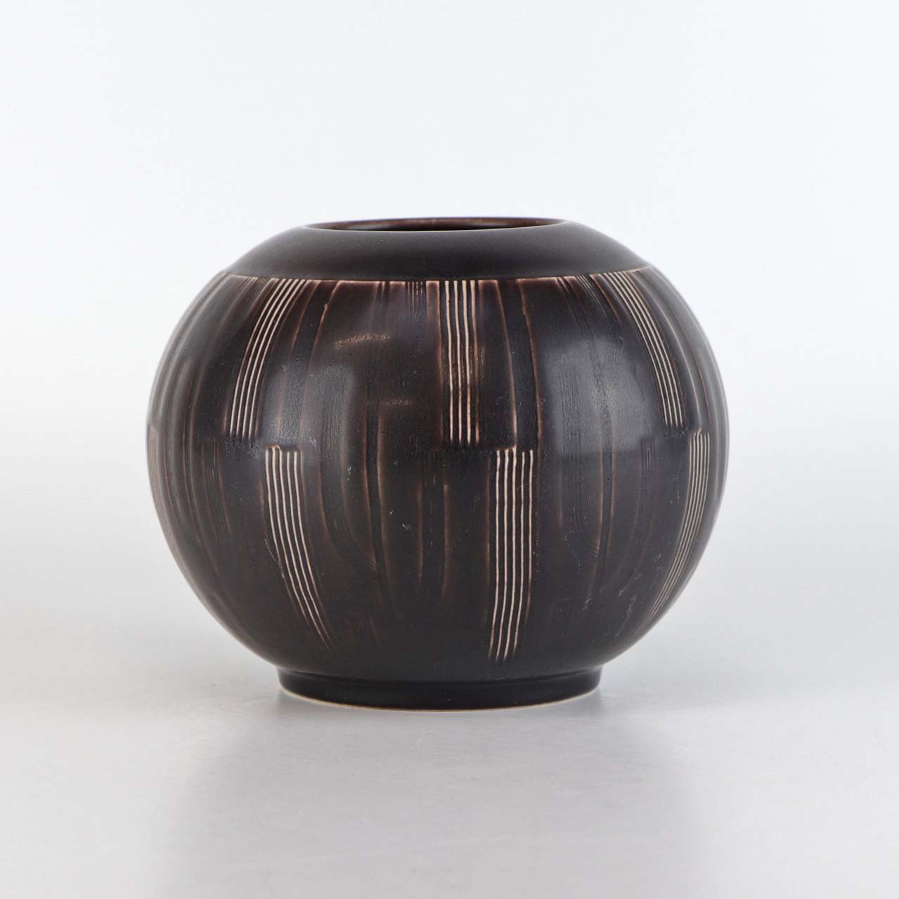 Rund kugleformet Solbjerg vase i mørkebrun fajance med stribet mønster. Nr. 1567