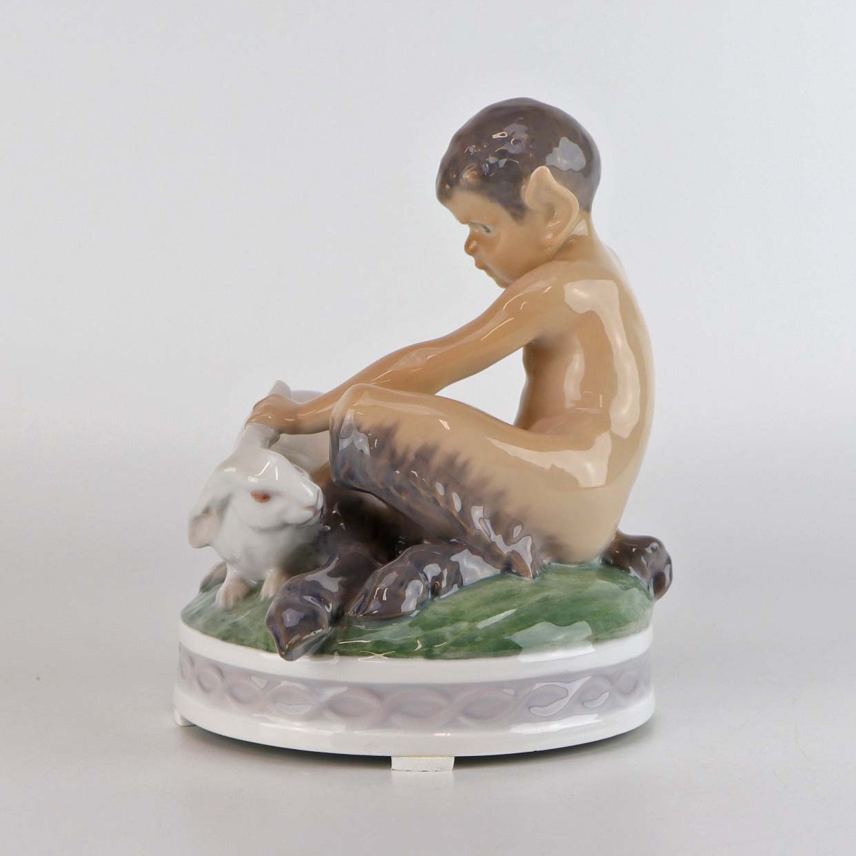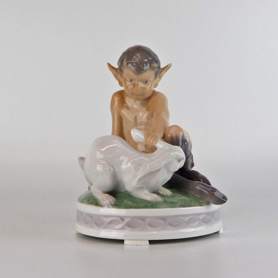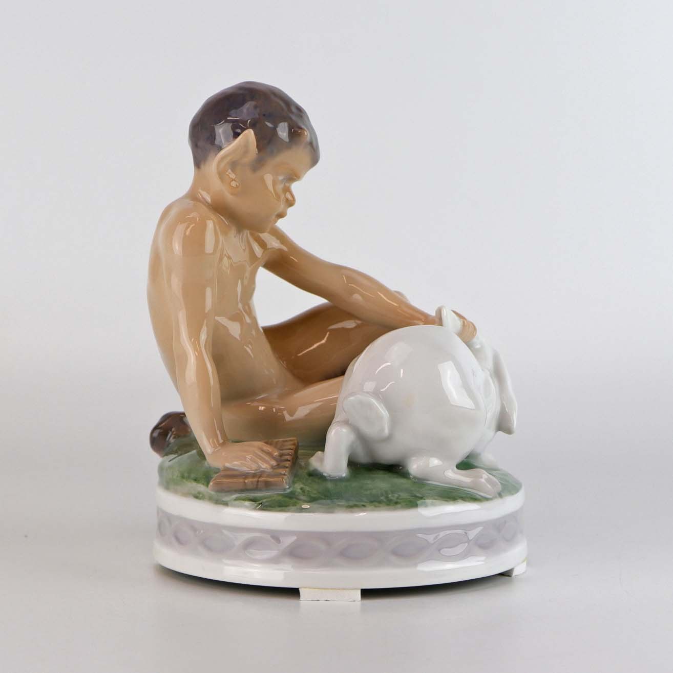 Kongelig figur i porcelæn med motiv af siddende faun med panfløjte og en hvid kanin. Nr. 439