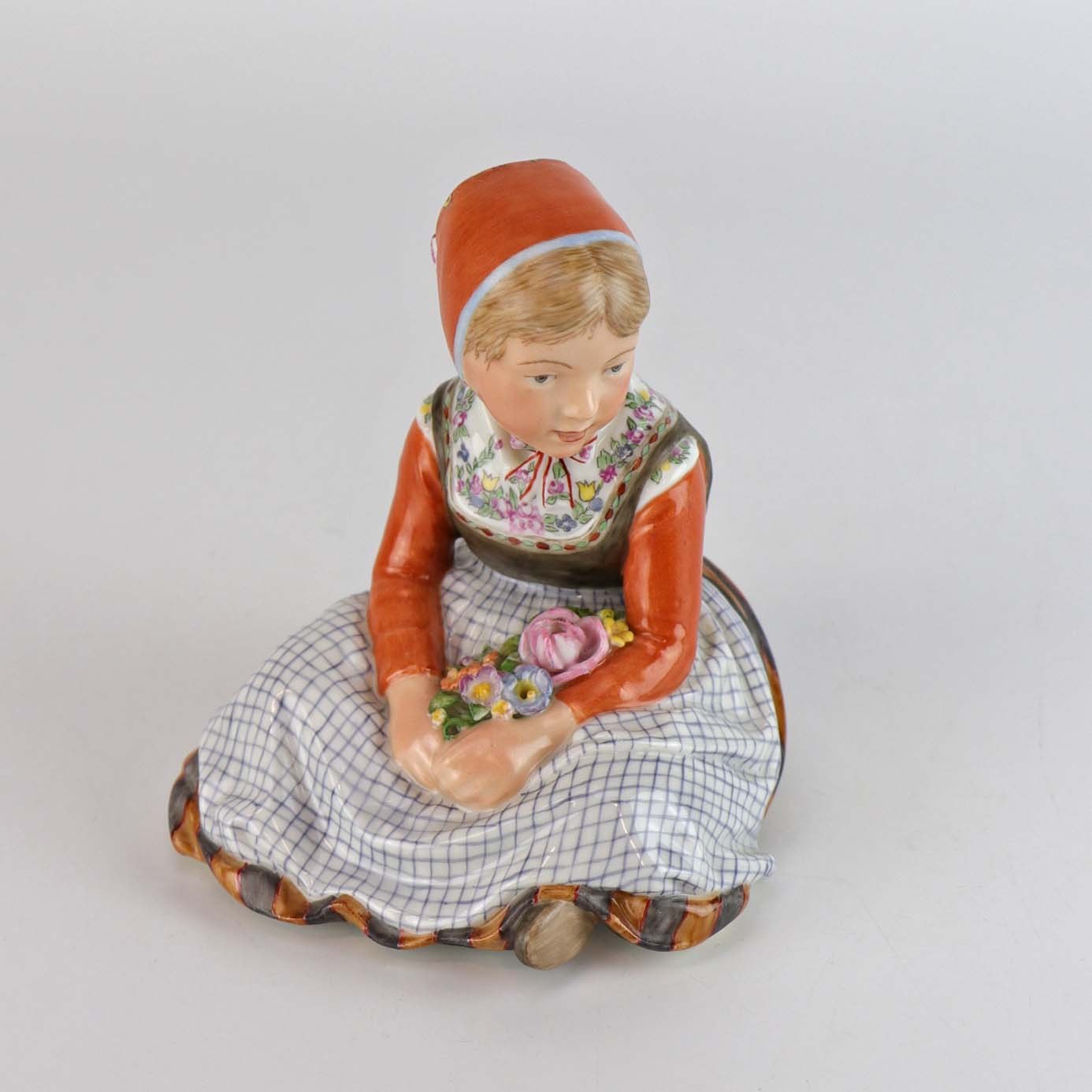 Kongelig figur i porcelæn med motiv af siddende blomsterpige i egnsdragt fra Sjælland. Nr. 12420