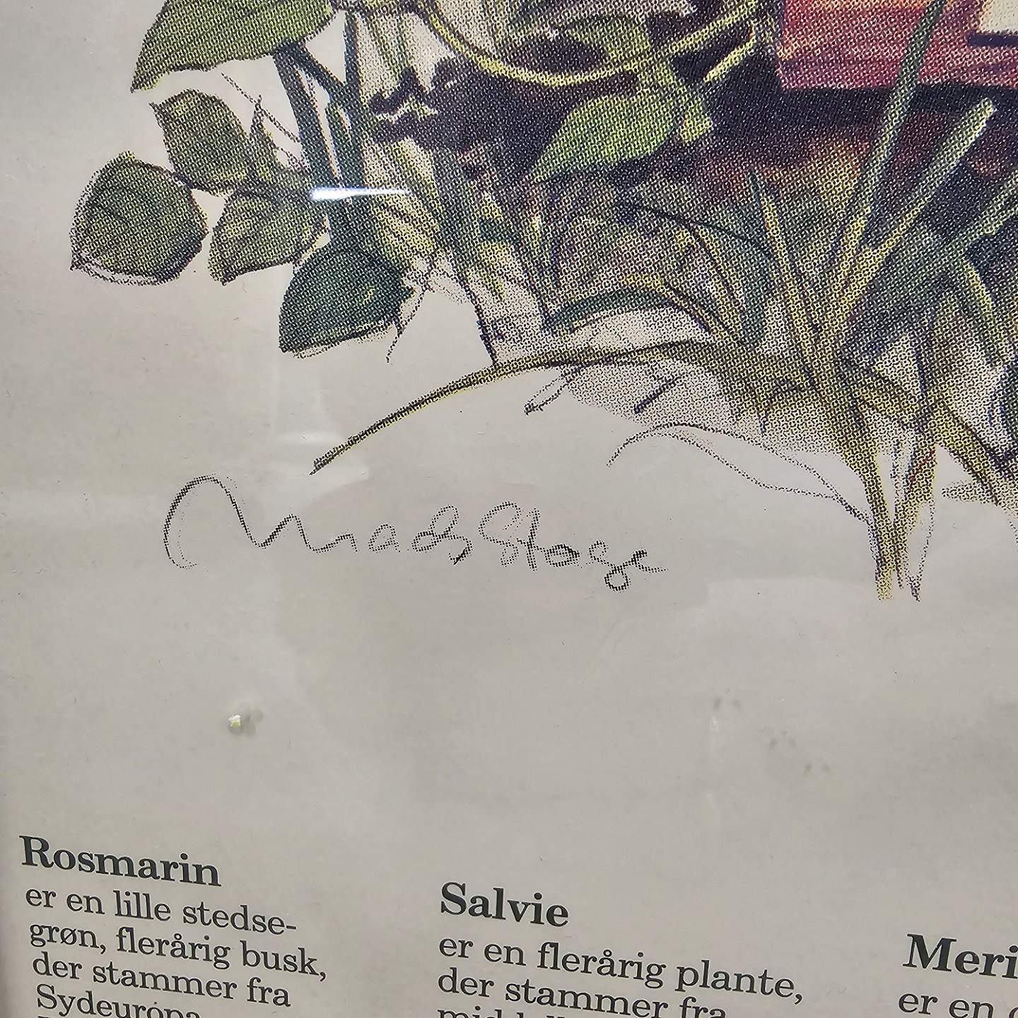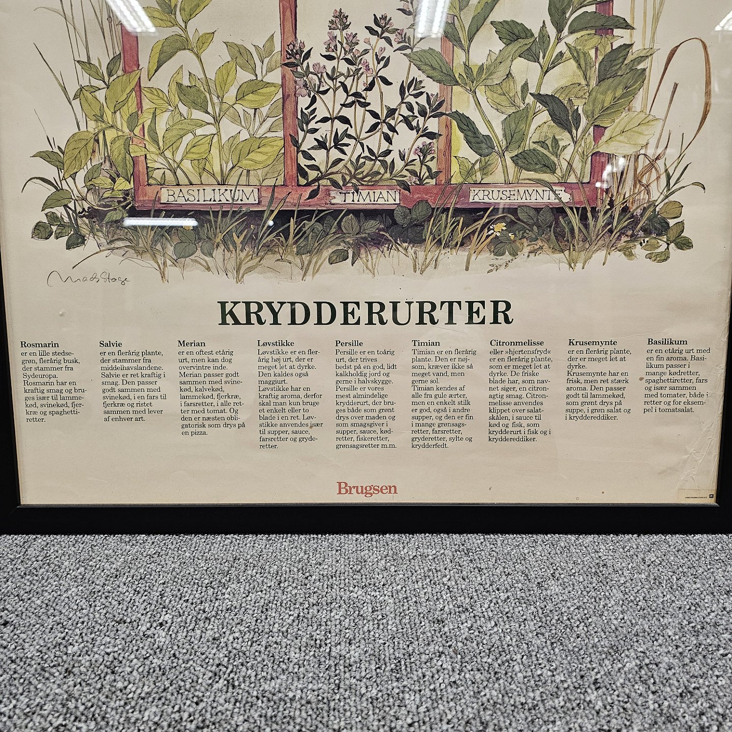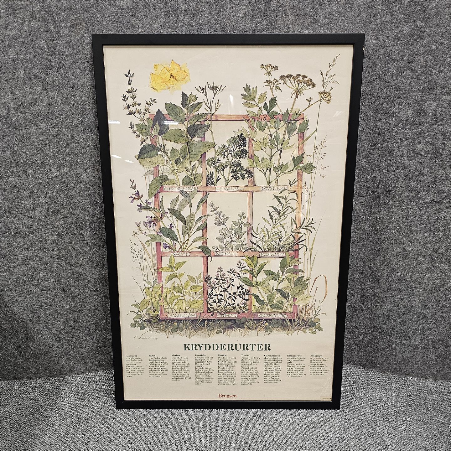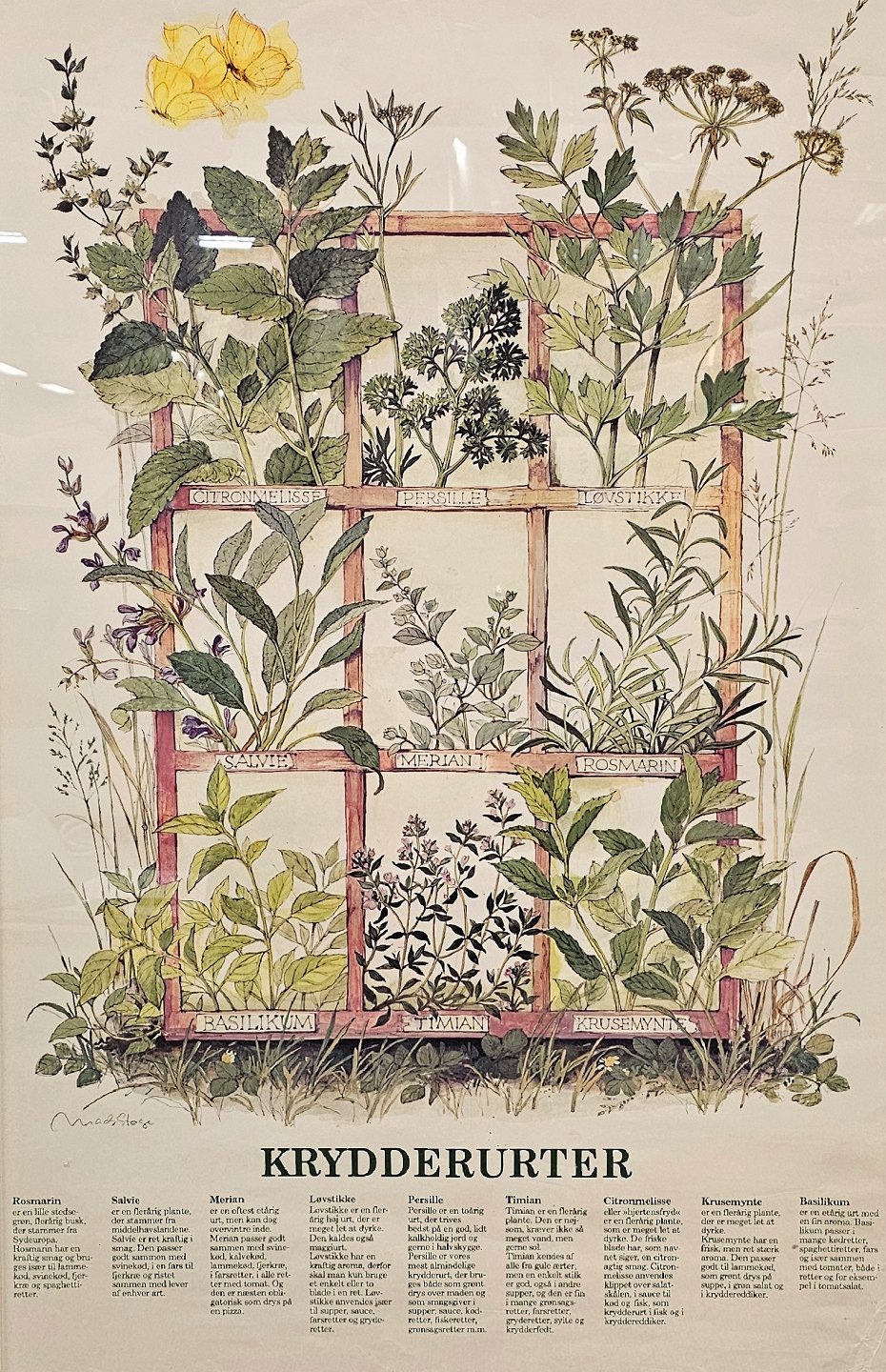 Plakat med motiv af ni forskellige krydderurter, med beskrivelse af dem og deres anvendelse.