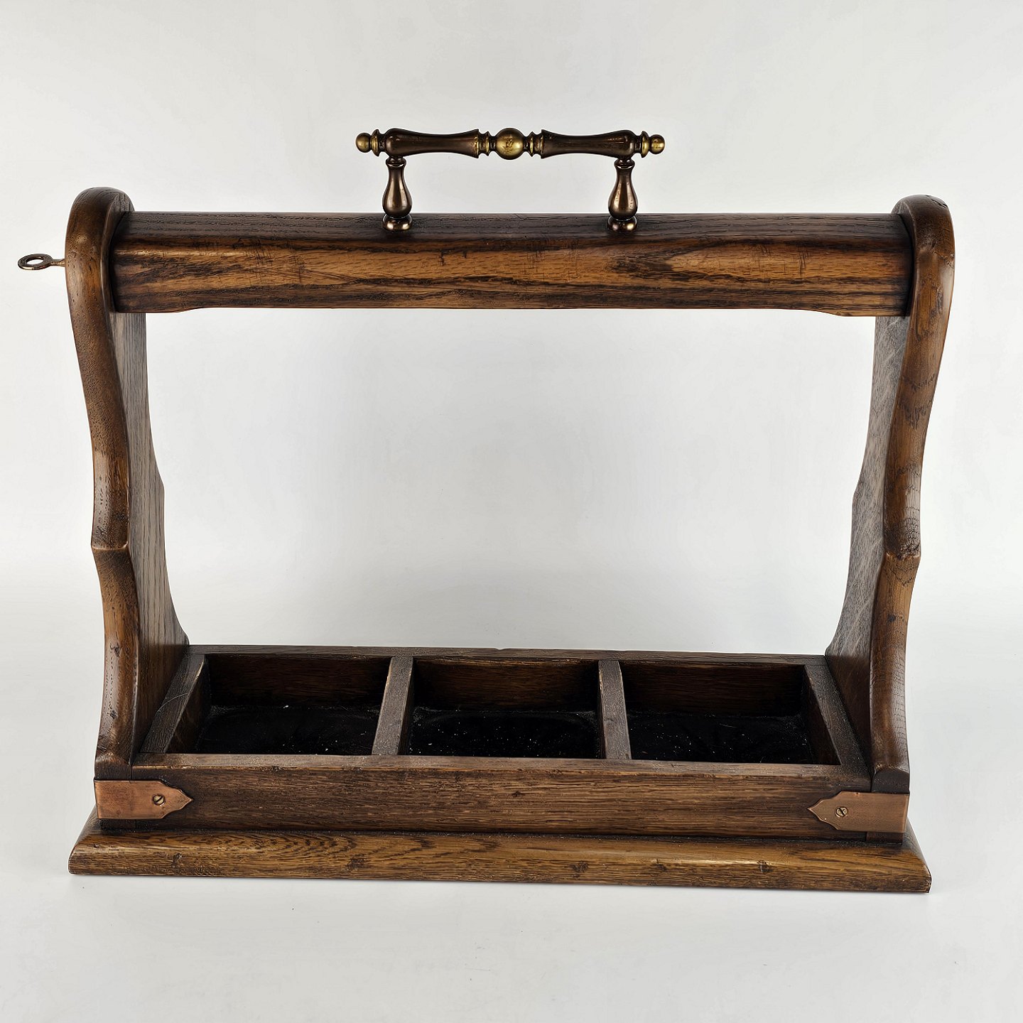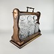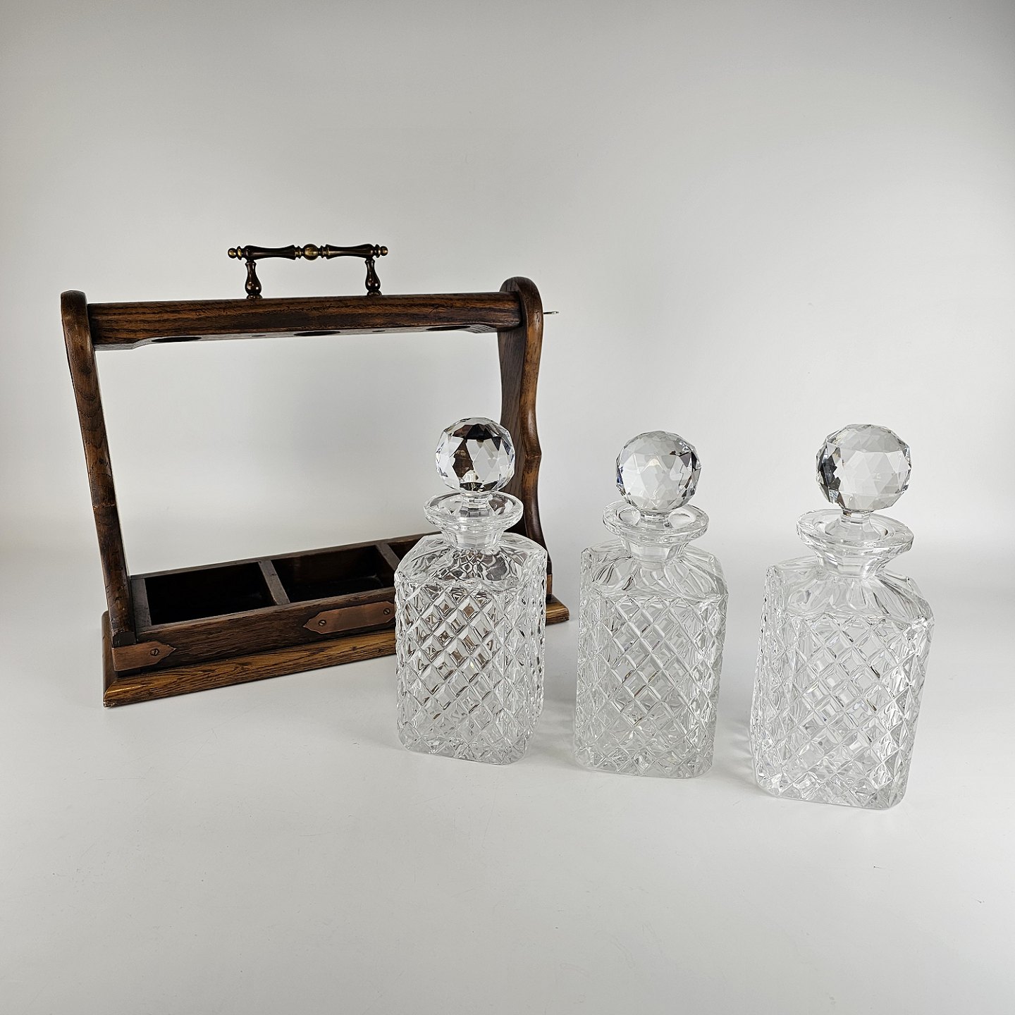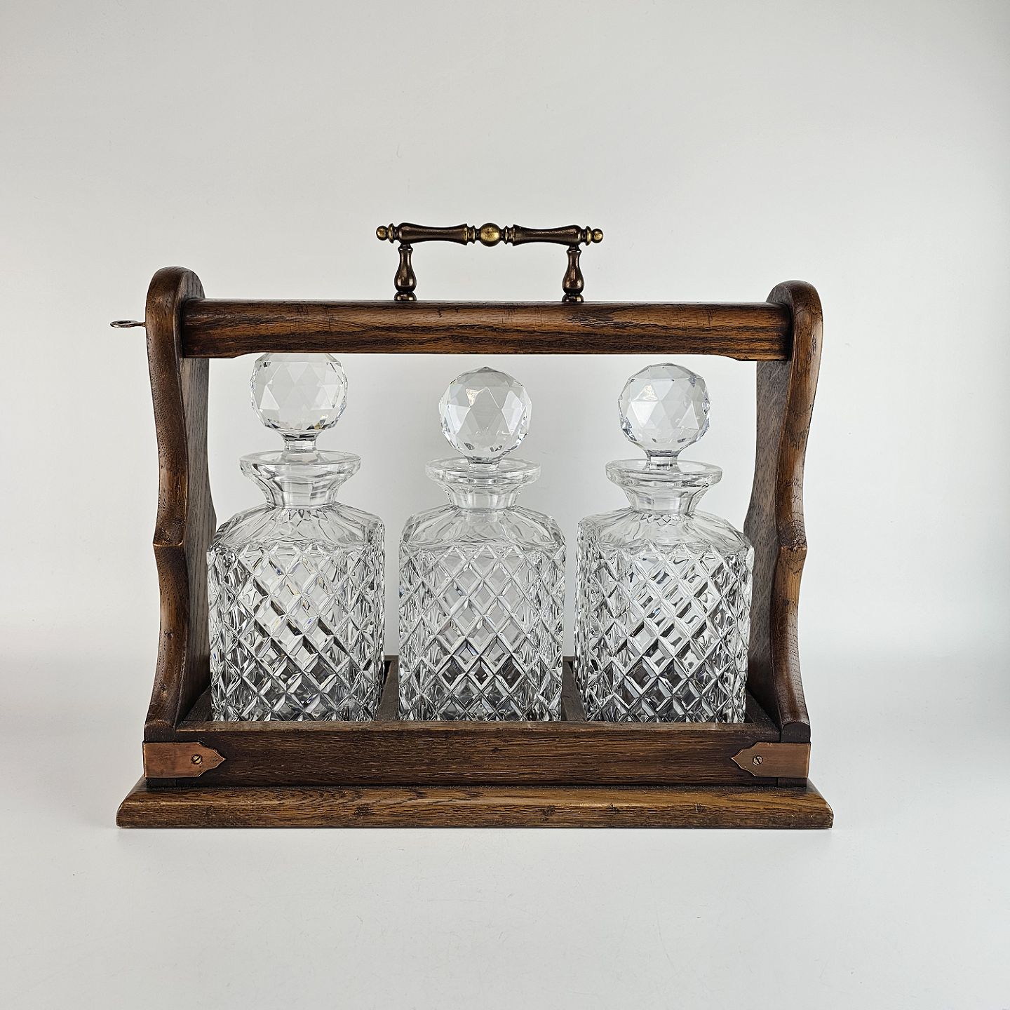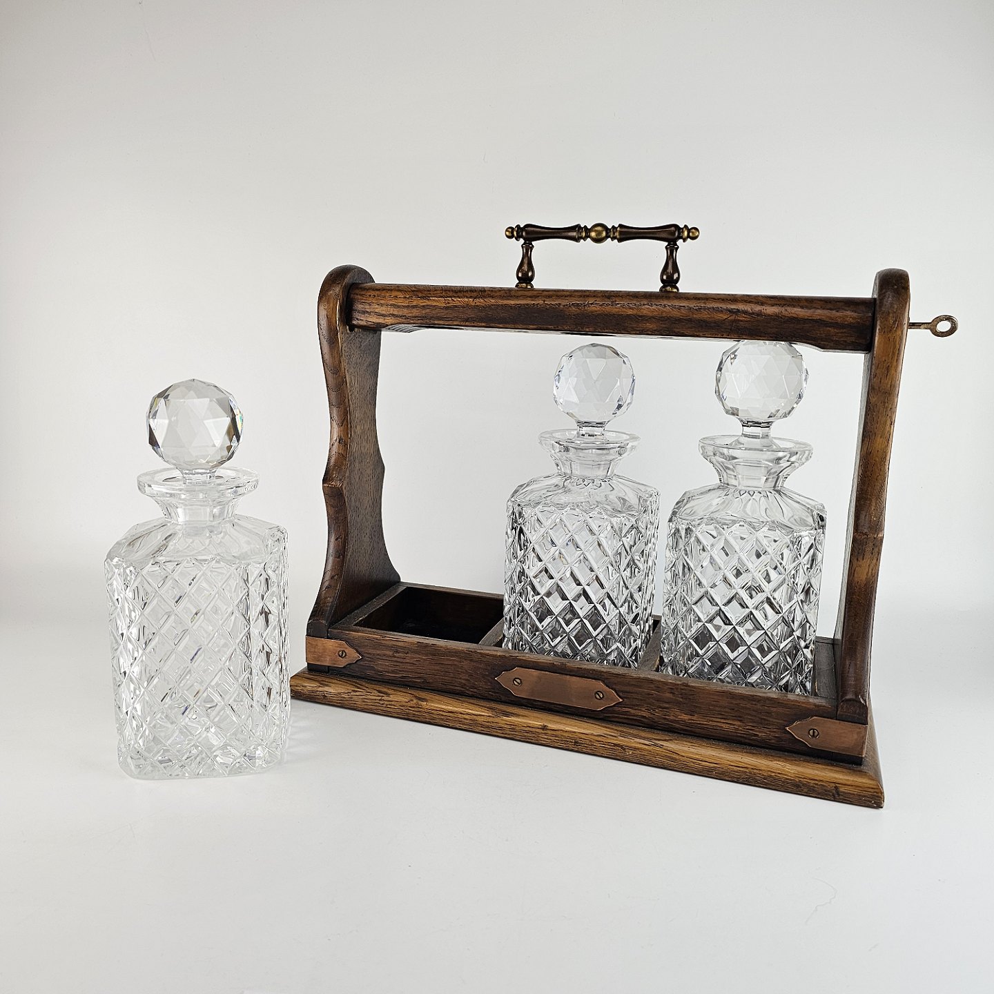 Tantalus i egetræ med tre flasker af presset glas.