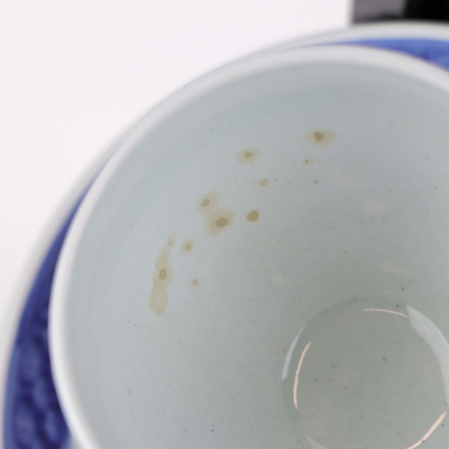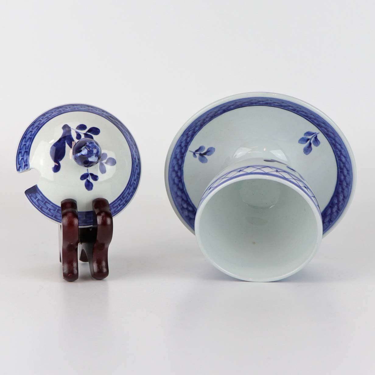 Glat hvid fajance med blå dekoration af blomster og blå bort