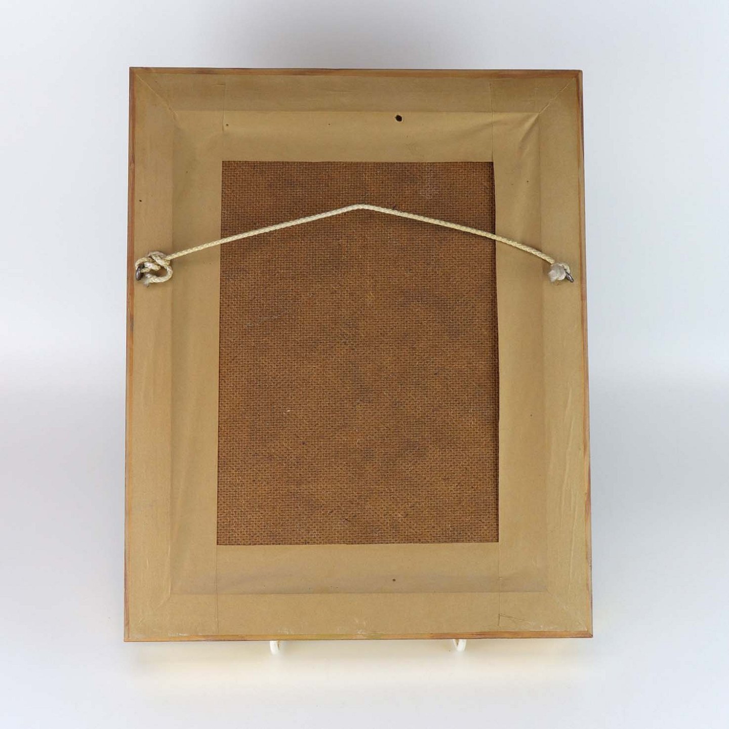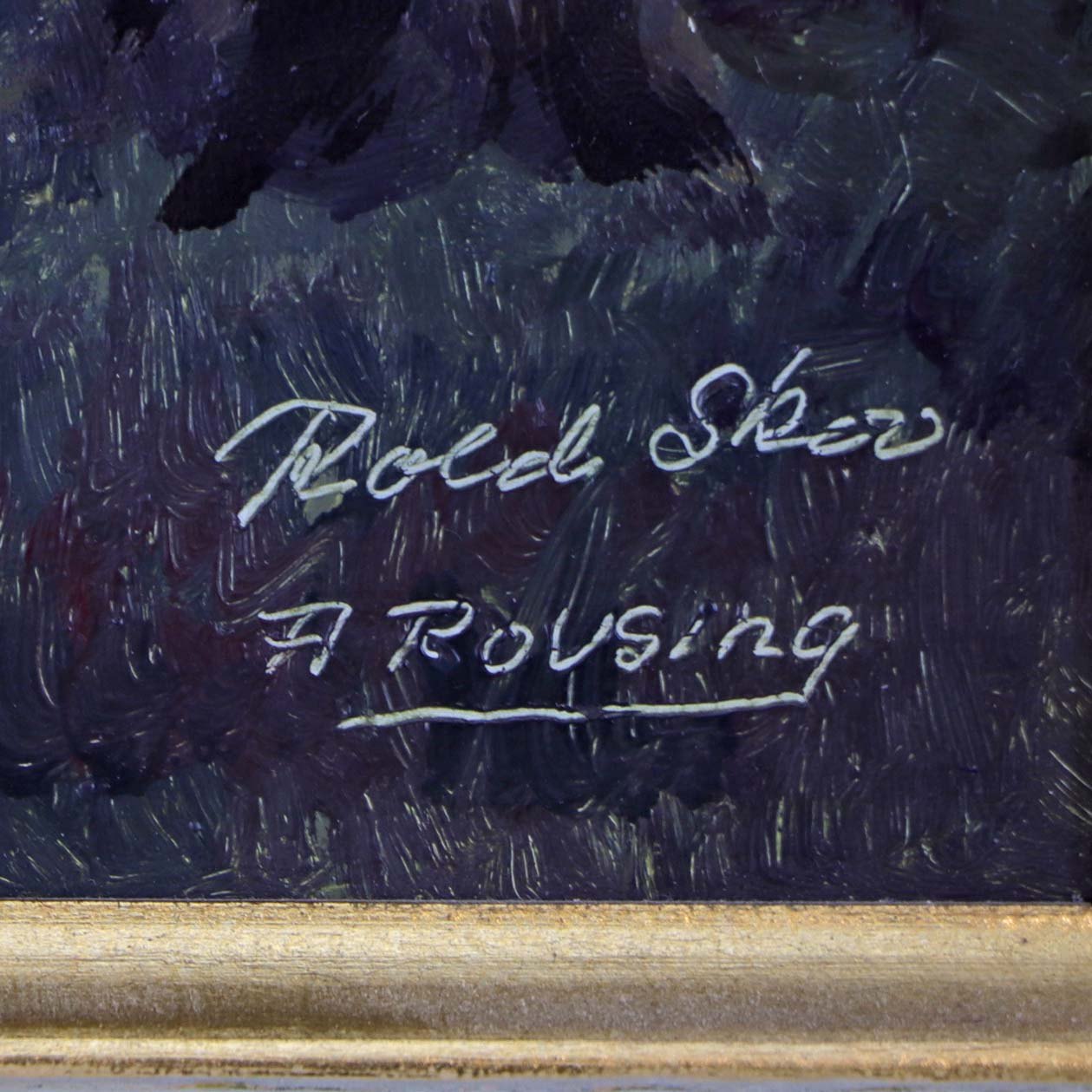 Oliemaleri på plade i gylden træramme med natur motiv af fyrtræer i Rold skov.