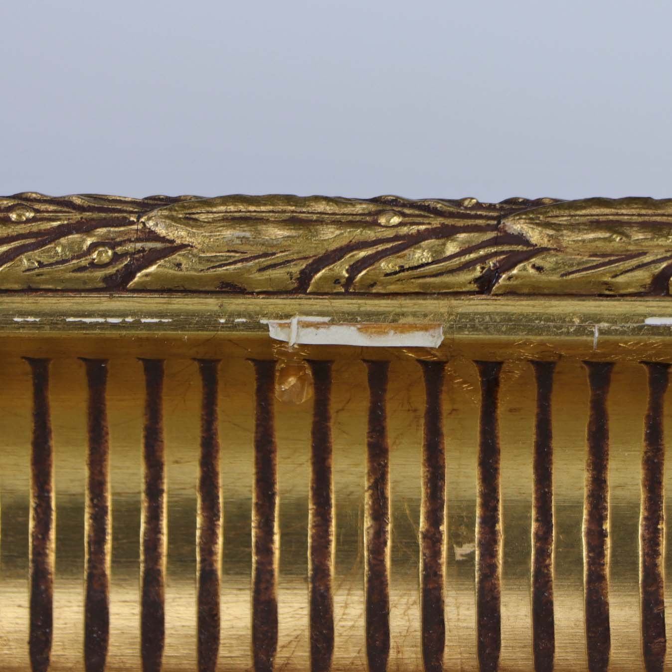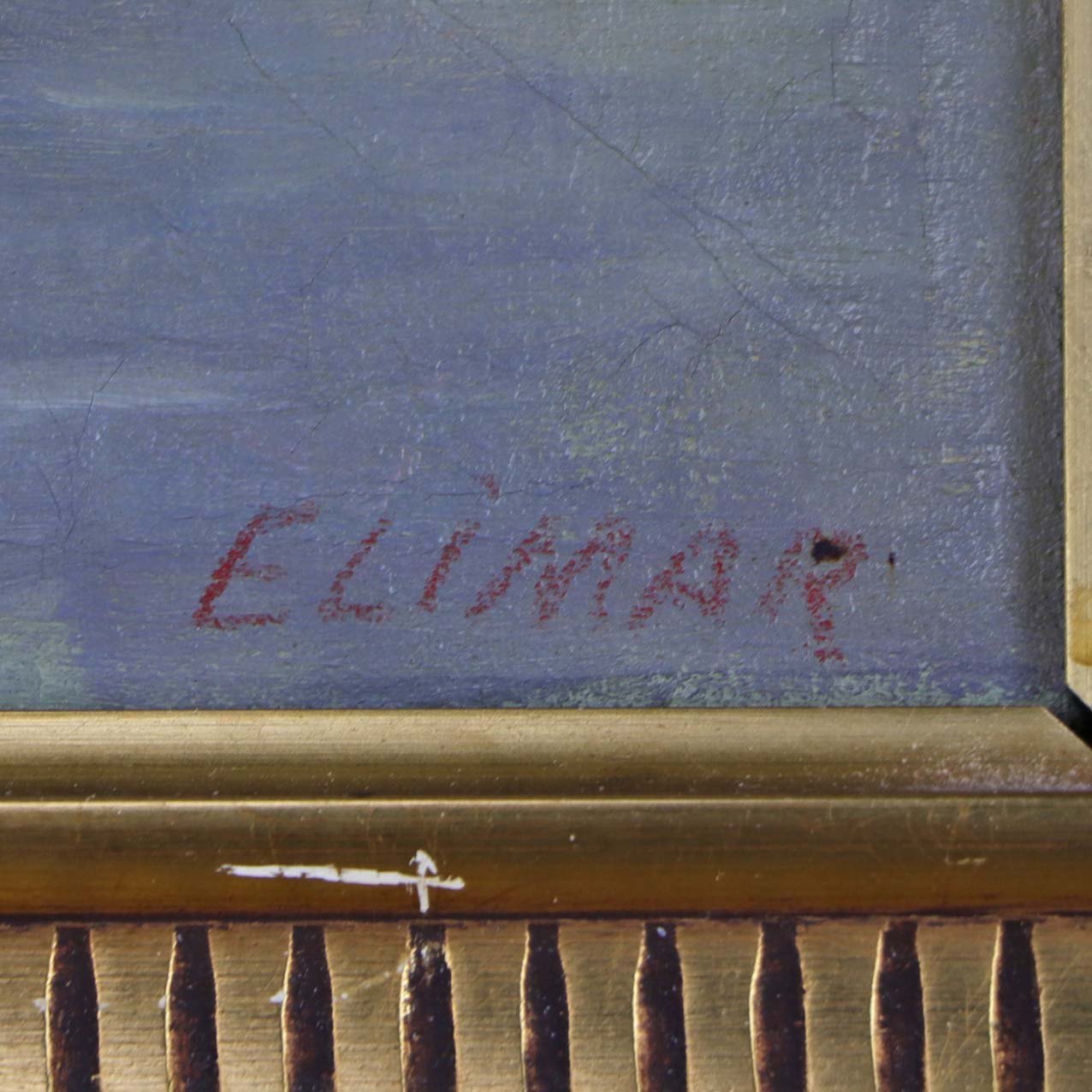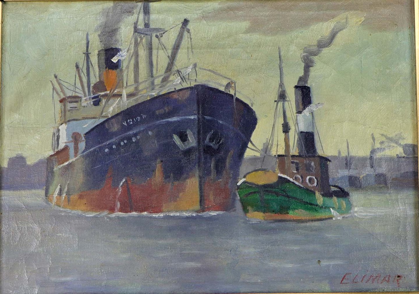 Oliemaleri på lærred i guldmalet træramme med havnemotiv af slæbebåd som trækker skib i havn.