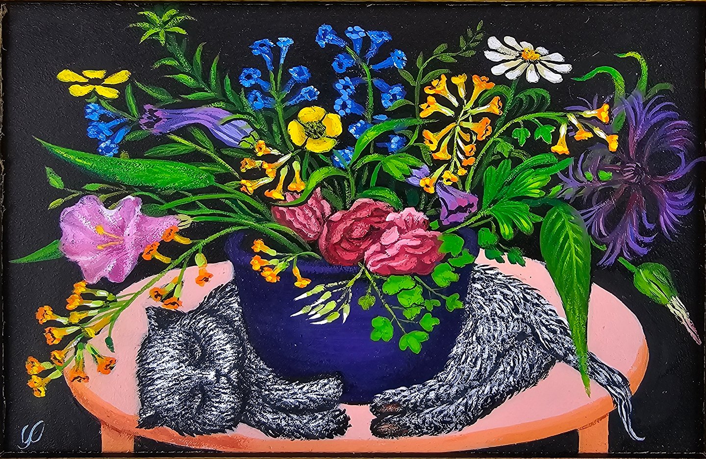 Maleri med motiv af en kat under en farverig buket blomster, på sort baggrund.