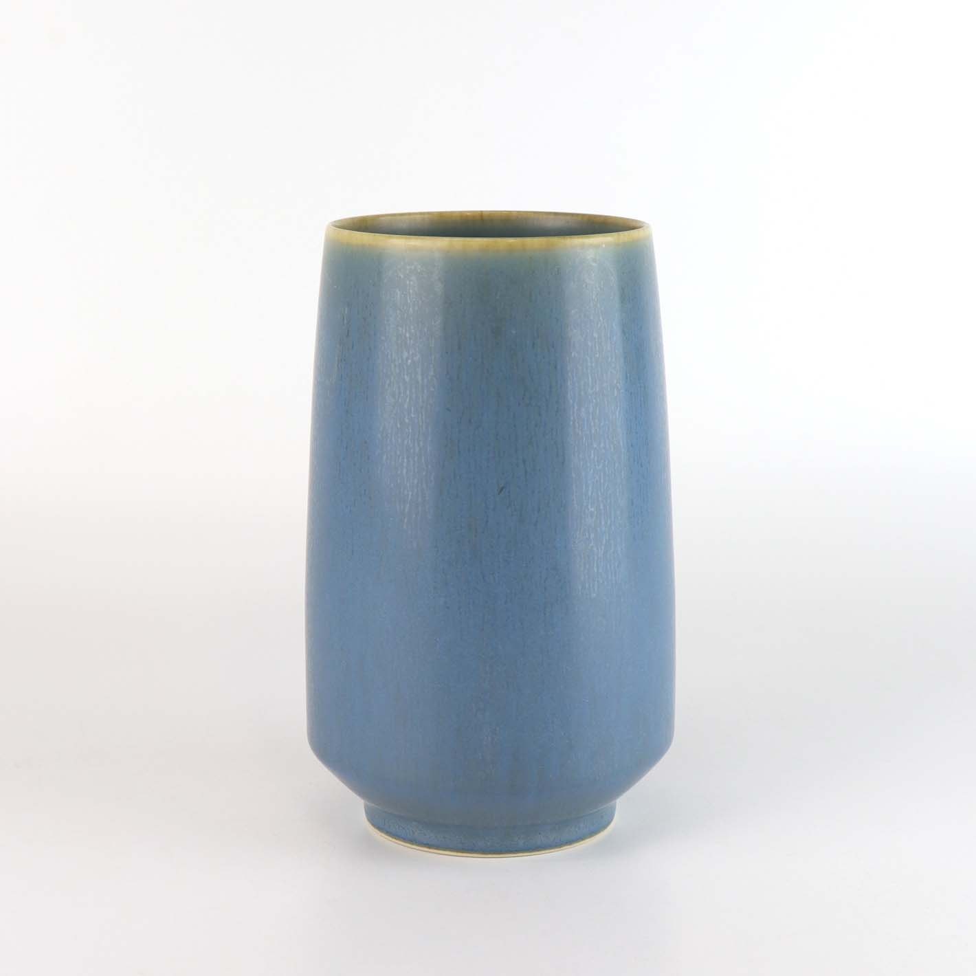 Vase i stentøj med harepels glasur i blå nuance med brunlig top kant. Nr. 1182/2