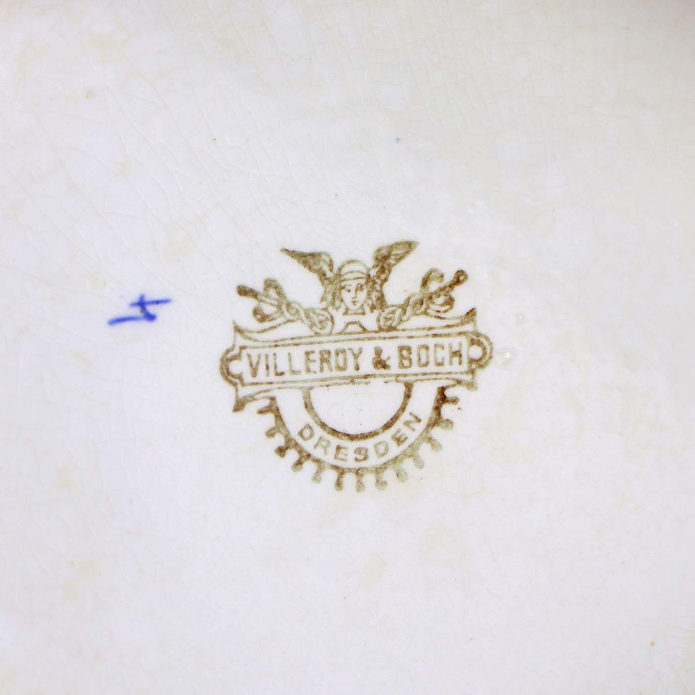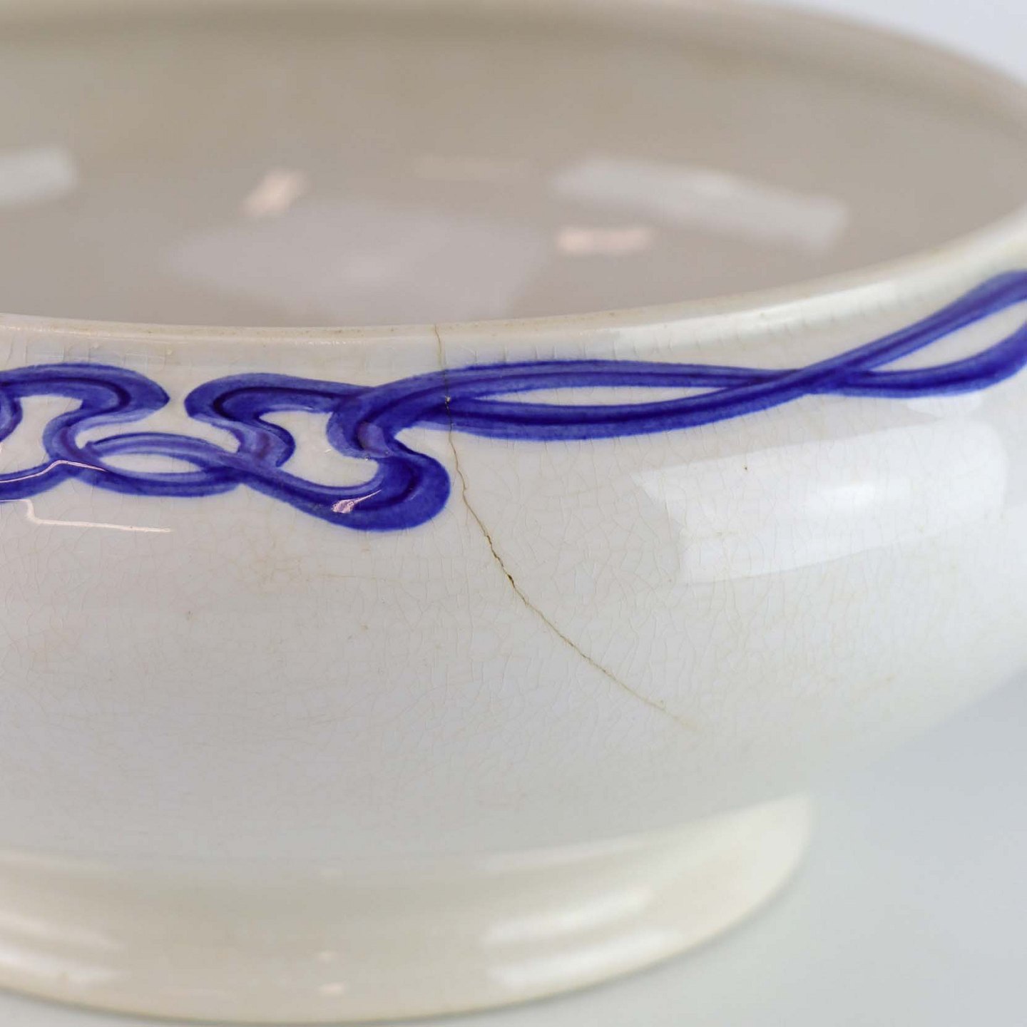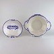 Blå Olga er hvid fajance dekoreret med blå abstrakt mønster langs kanten
