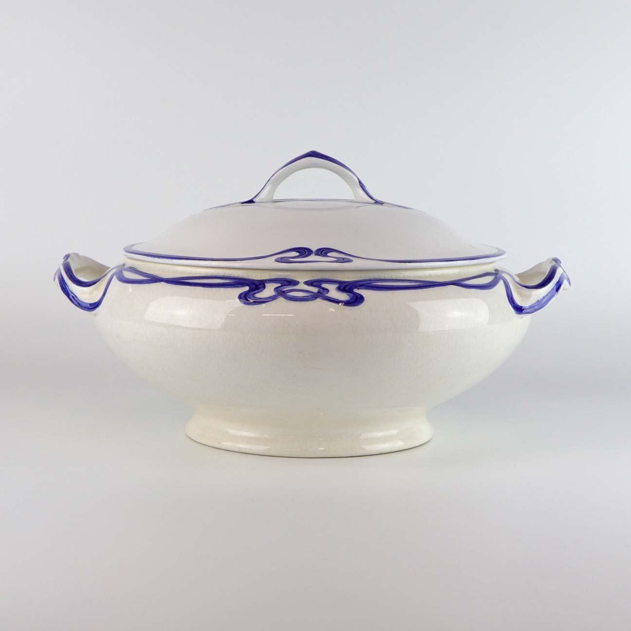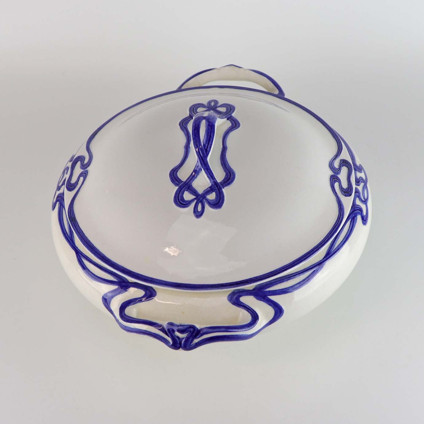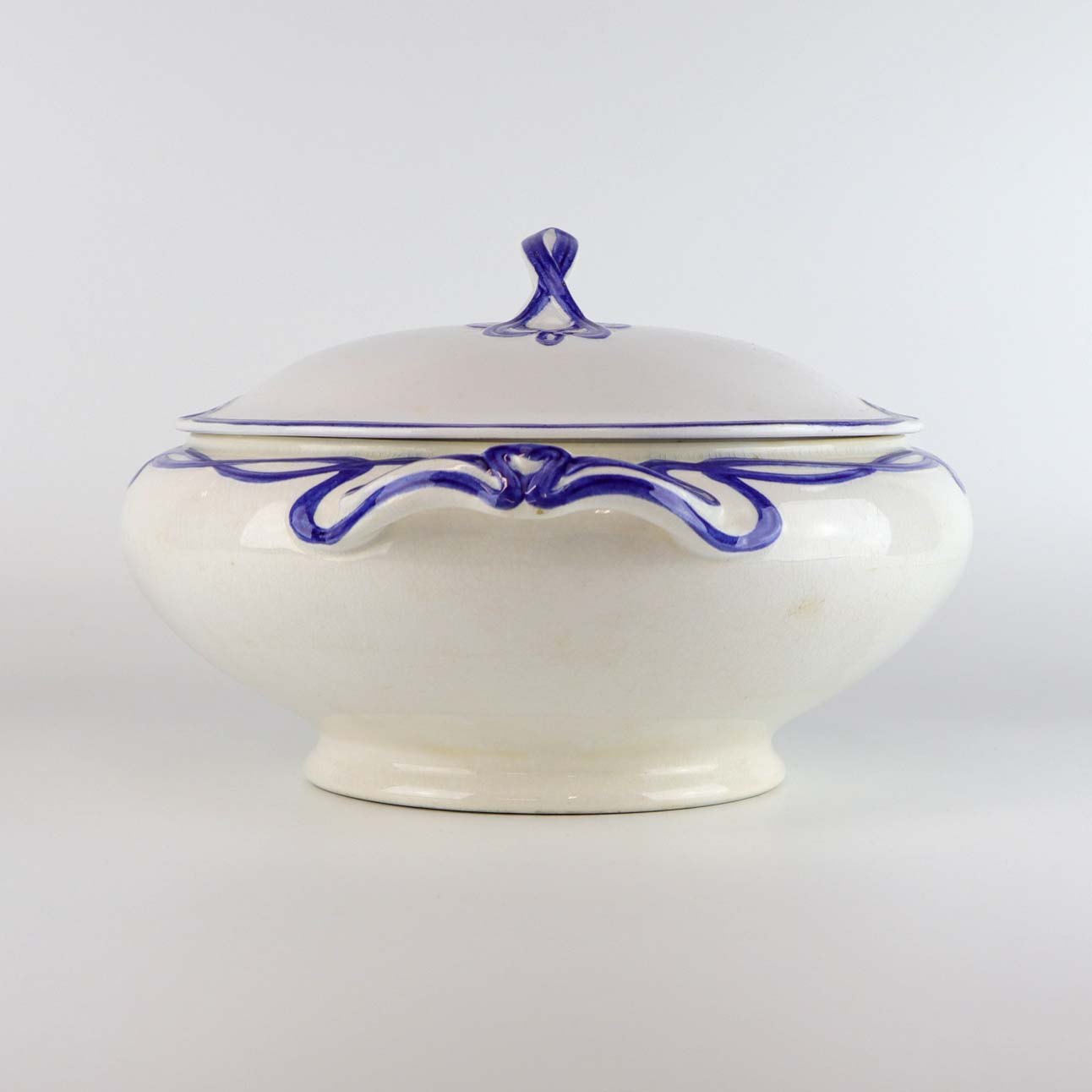 Sjælden rund terrin i fajance med låg og håndtag fra stellet Blå Olga, model Pommern
