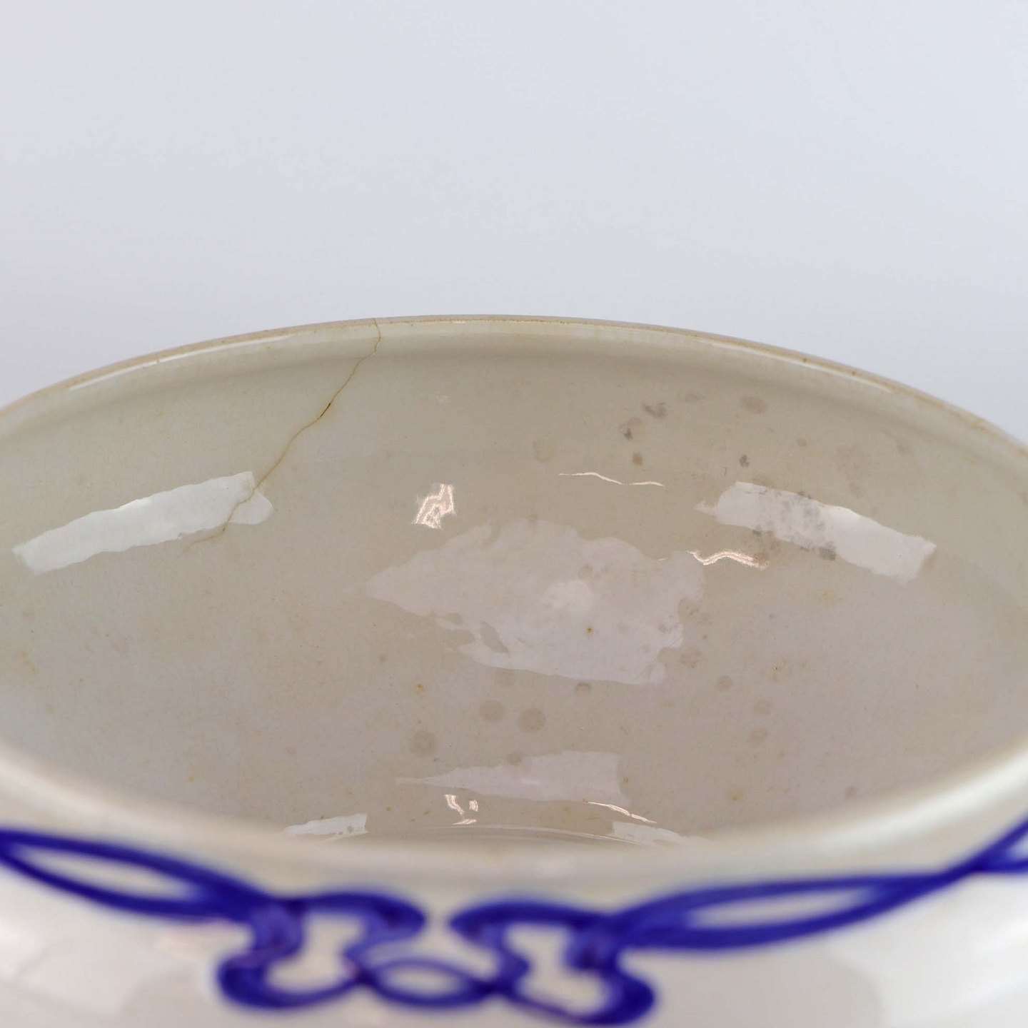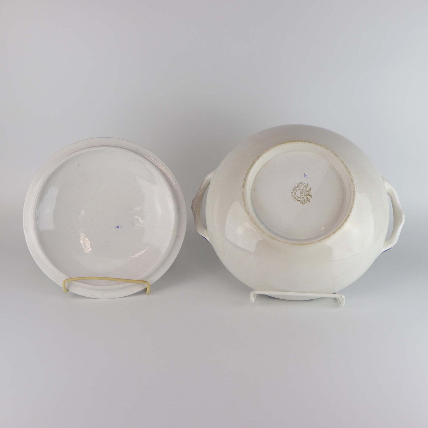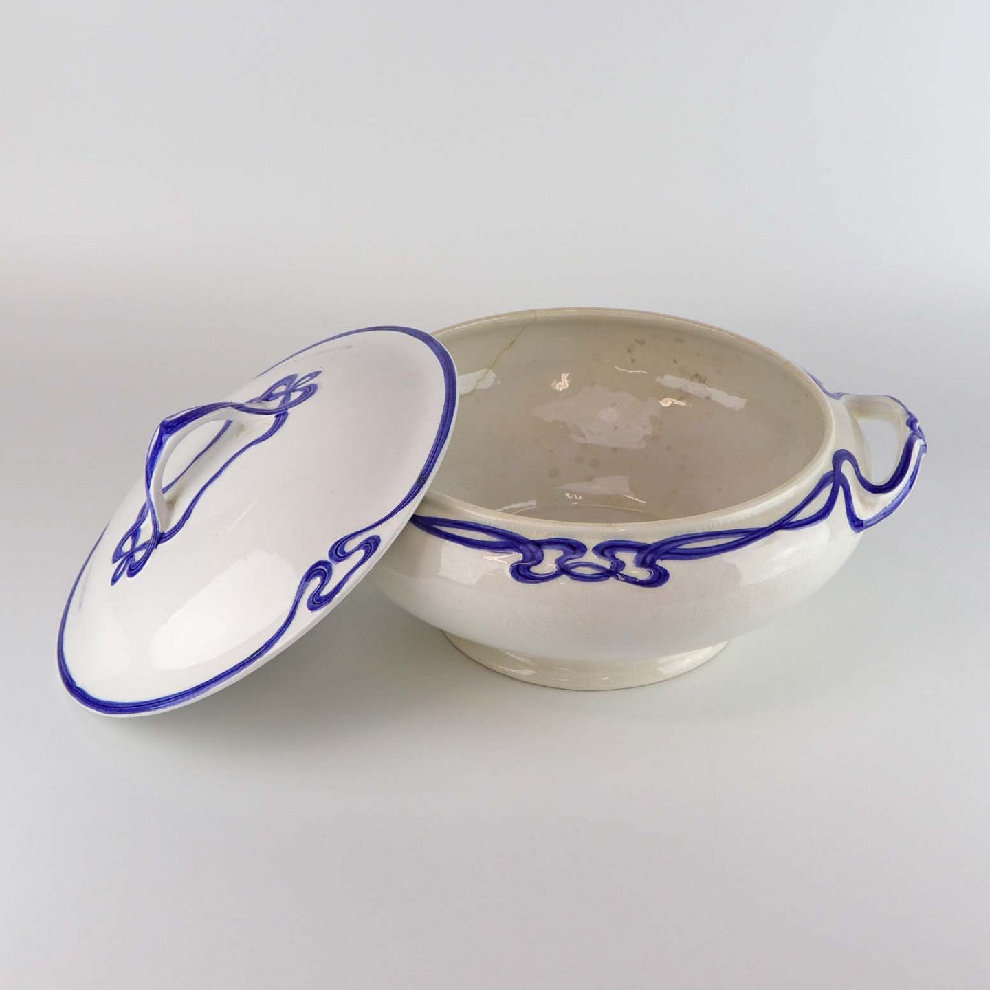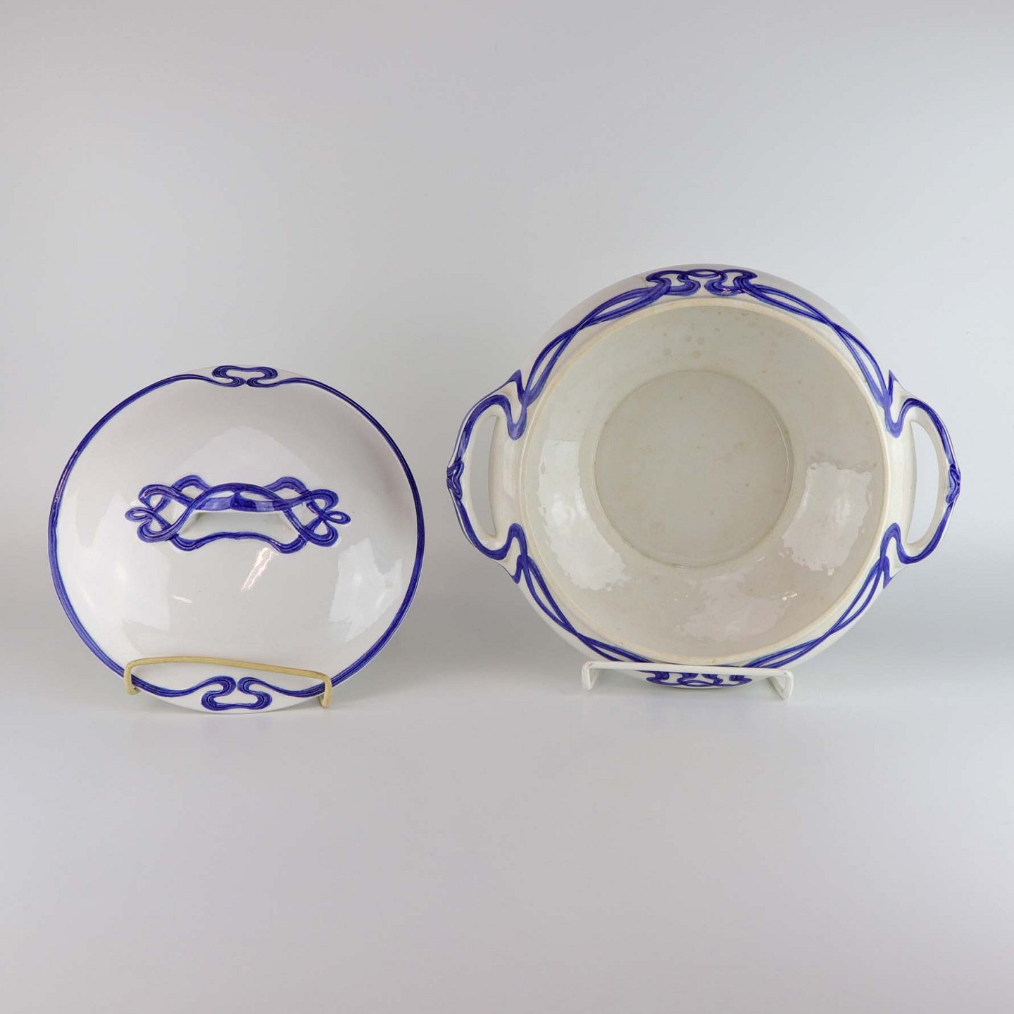 Sjælden rund terrin i fajance med låg og håndtag fra stellet Blå Olga, model Pommern