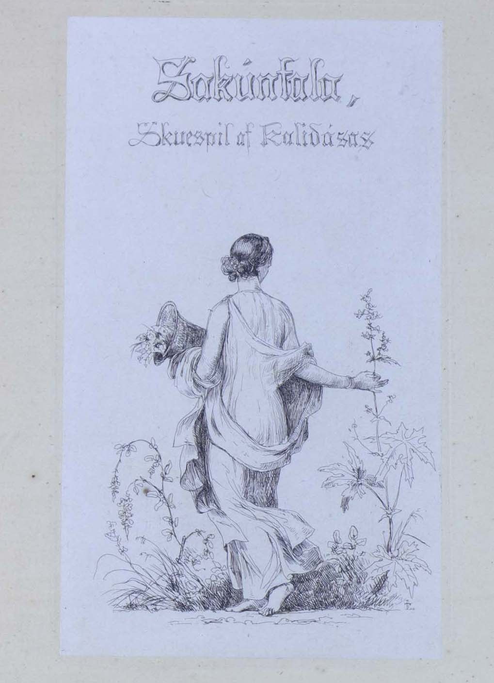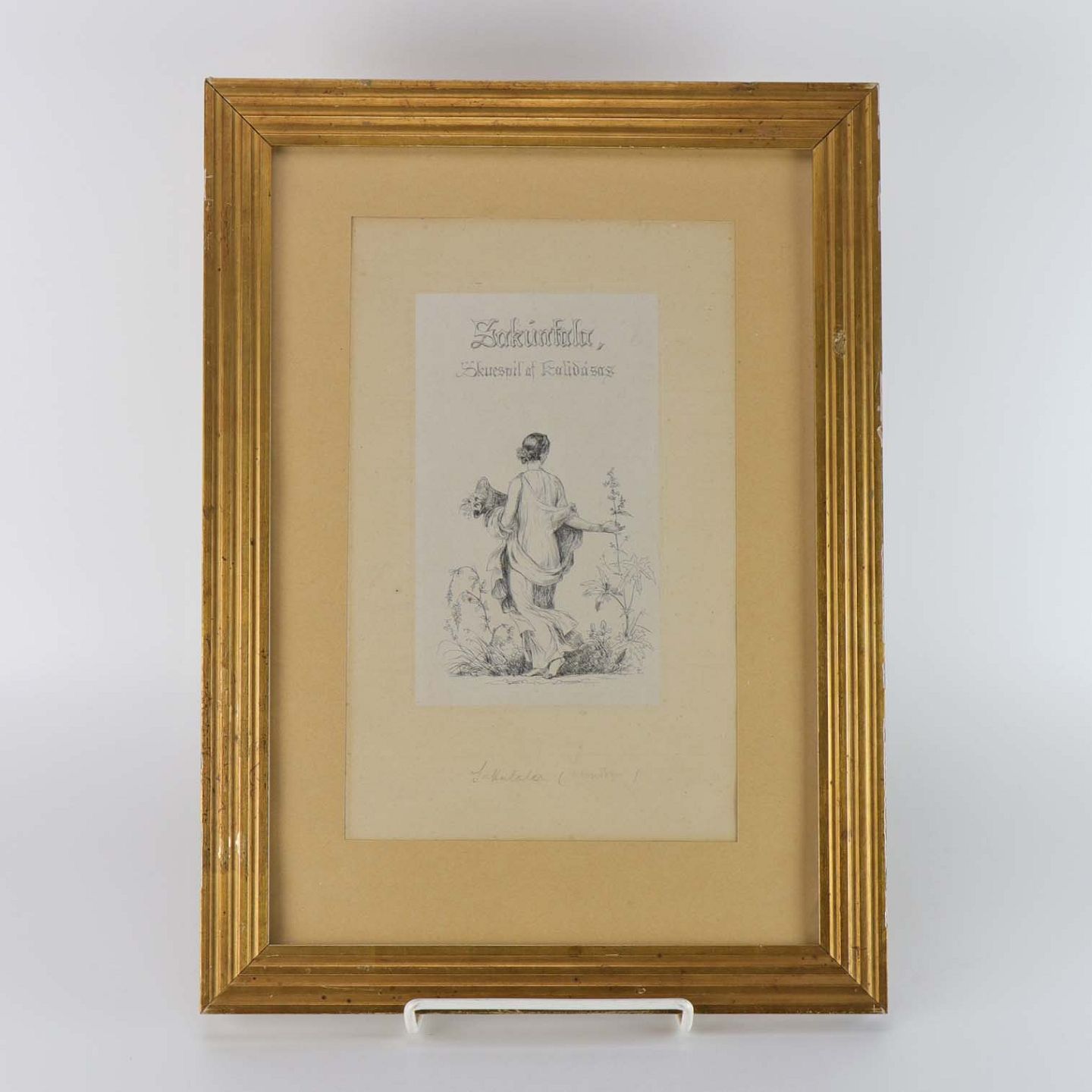 Indrammet ældre radering med passepartout i guldmalet træramme med motiv af ryggen af en kvinde med blomster i favnen og teksten Sakunfala, Skuespil af Kalidasos.