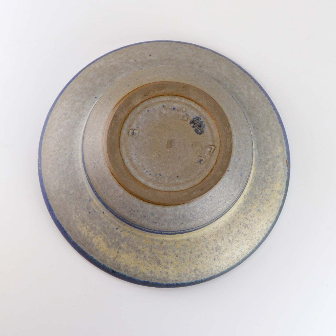 Dyb skål eller bordfad i glaseret stentøj med abstrakt motiv i blå nuancer. Nr. 611