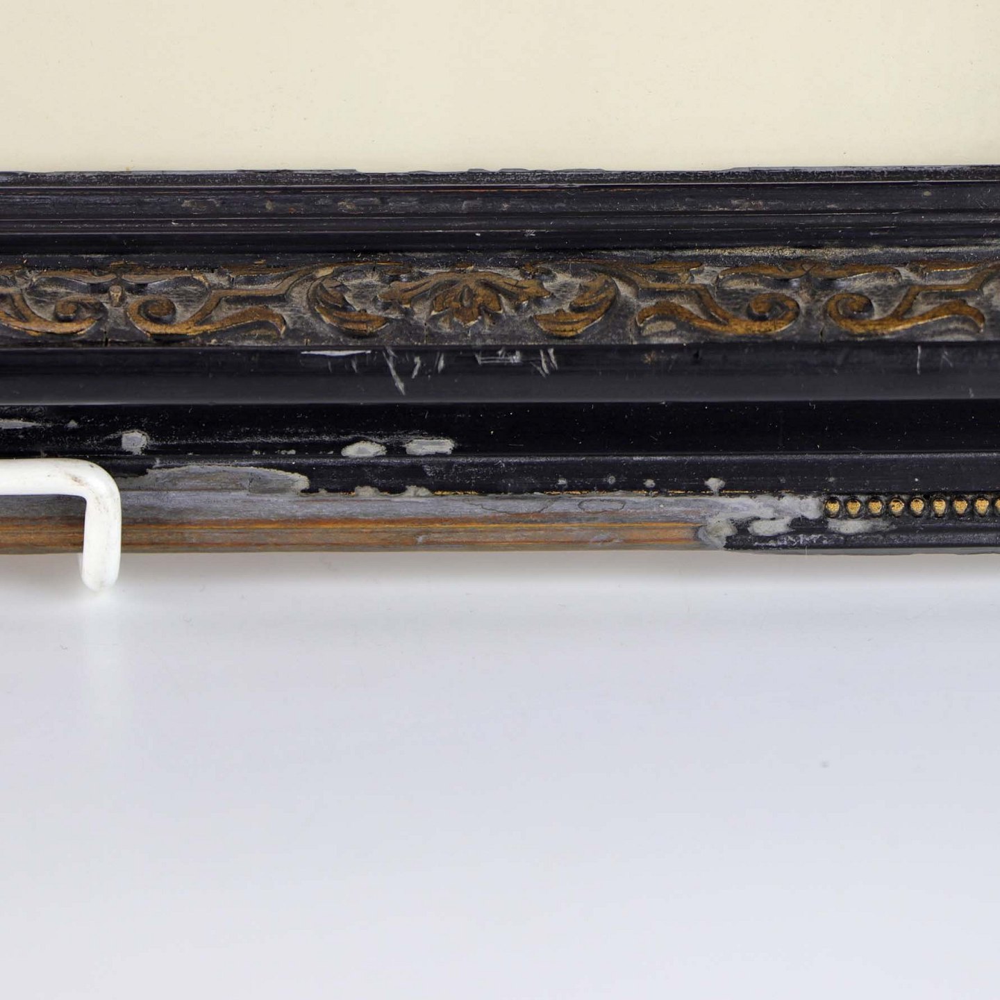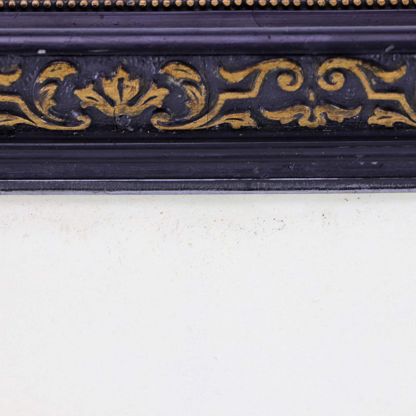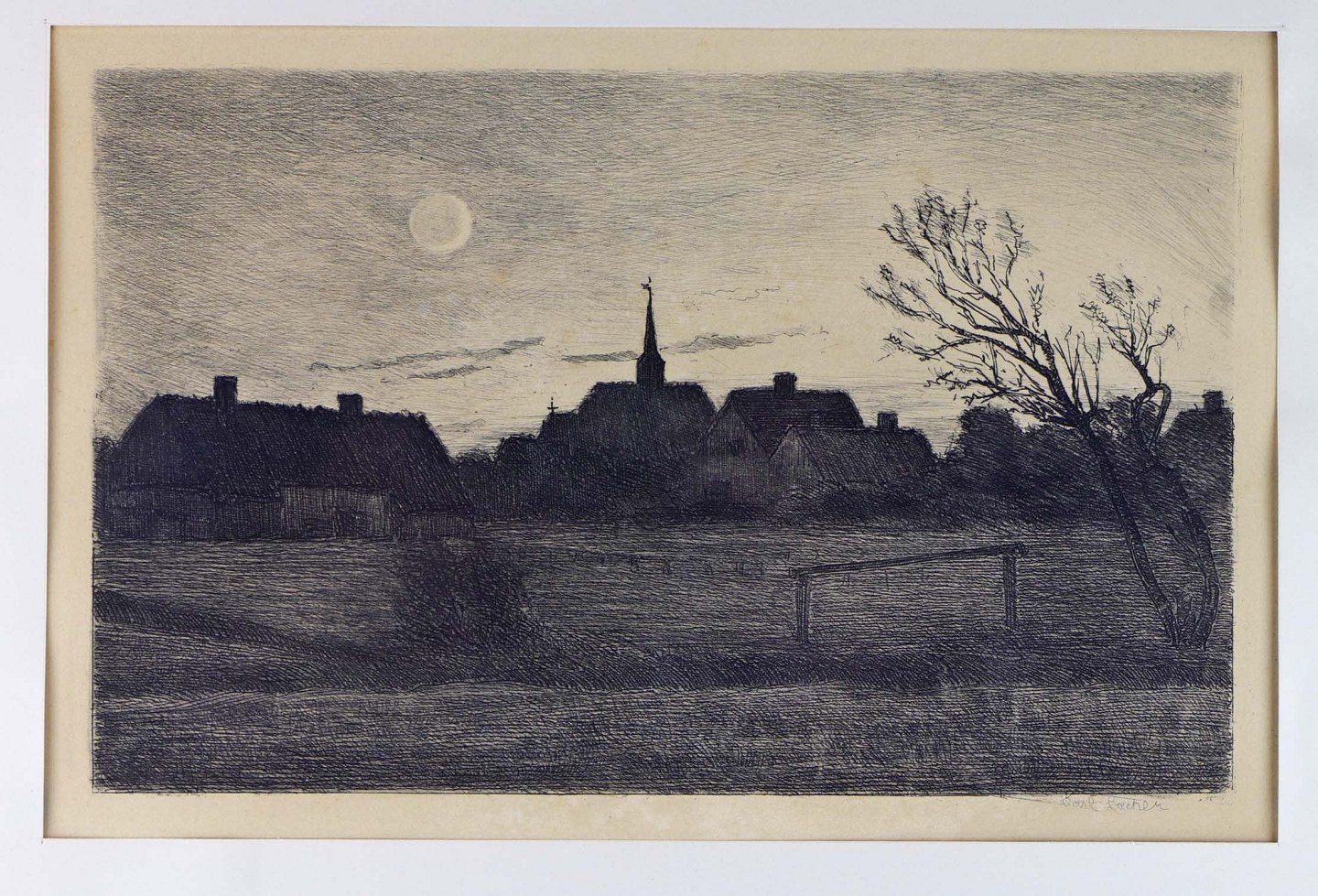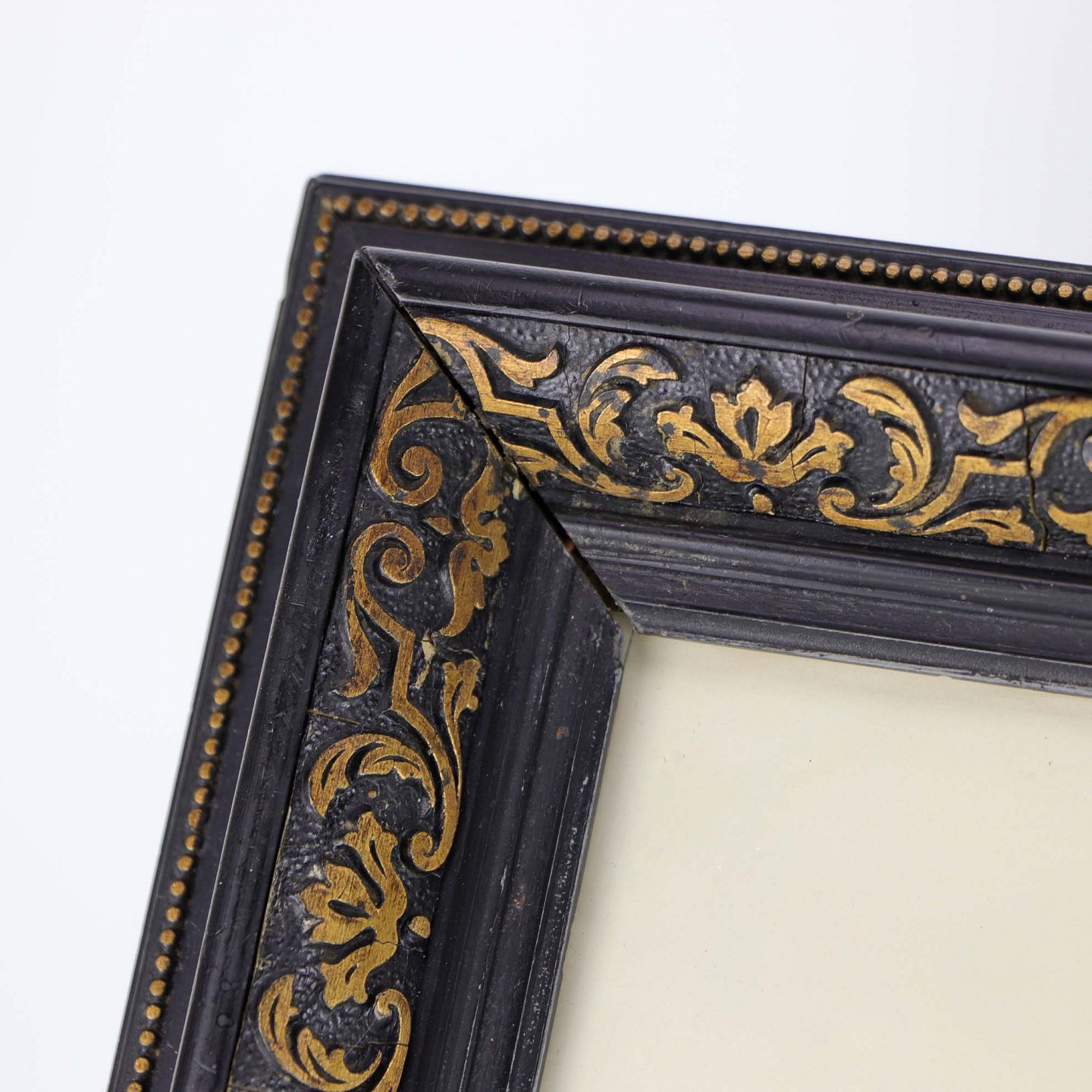Indrammet radering med sortmalet træramme med guldmalet mønster og byskabsmotiv i silhuet.