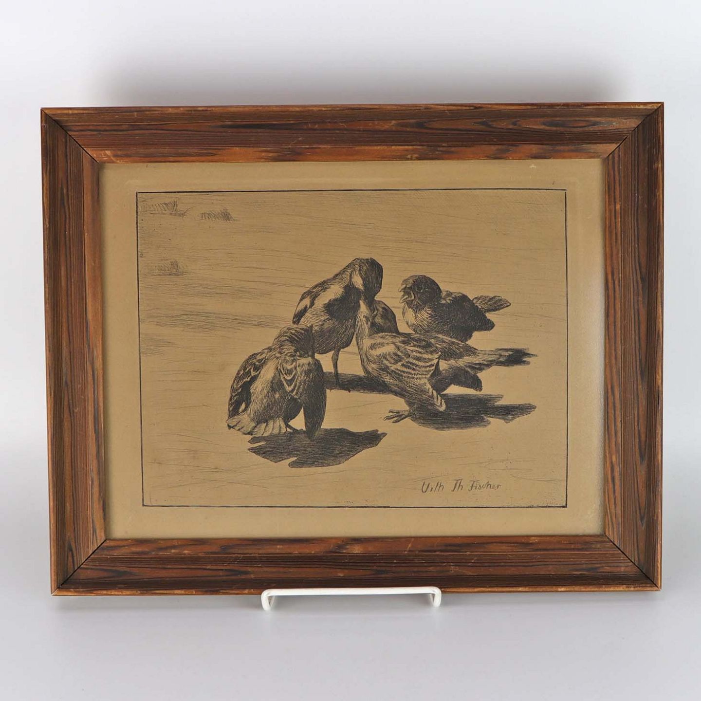 Indrammet radering på brunligt papir i træramme med motiv af fire gråspurve.
