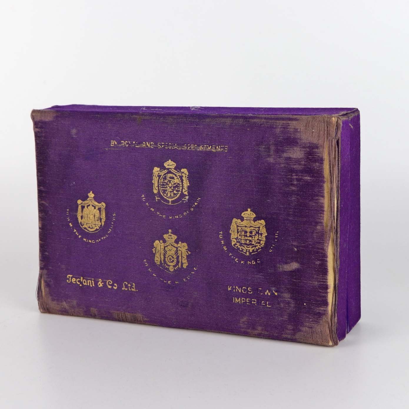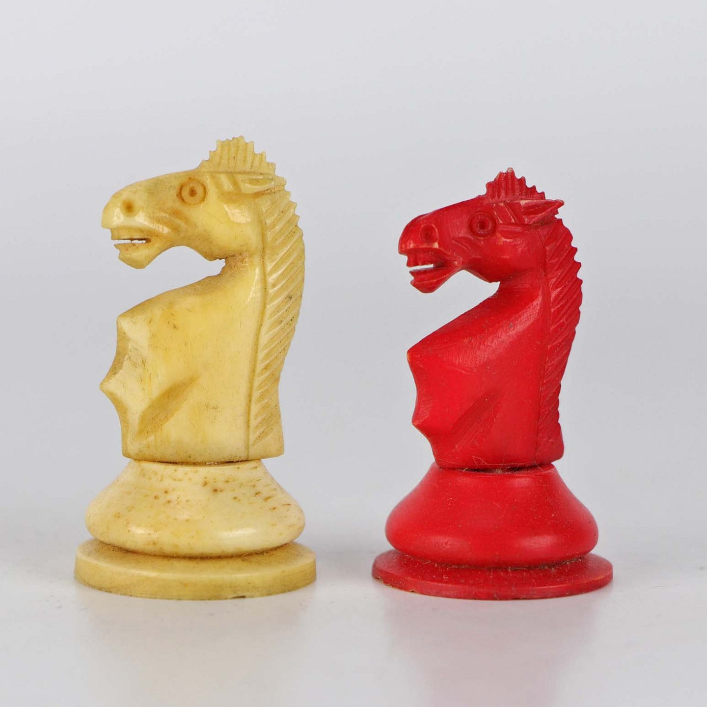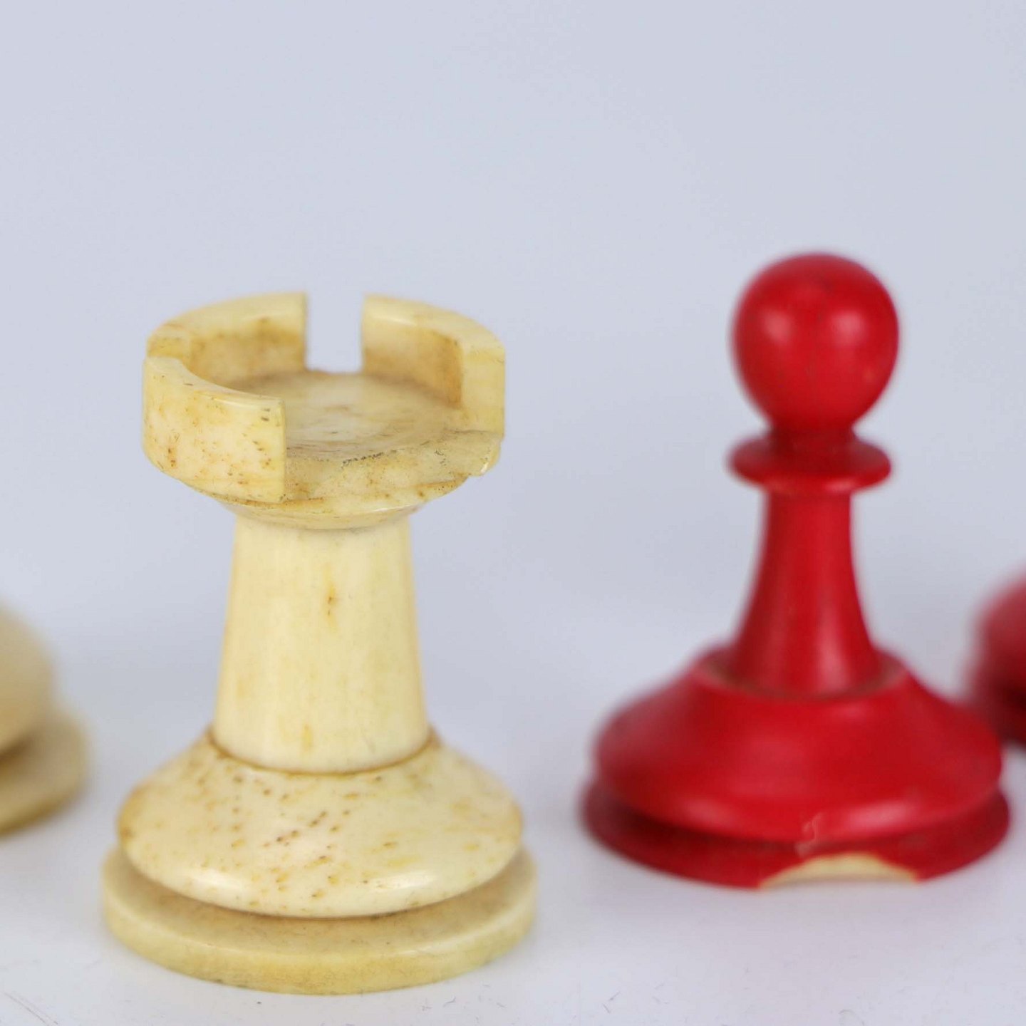 Ældre sæt røde og hvide skak brikker af ben. brikkerne kommer i ældre polstret cigaretboks. I alt 32 brikker.