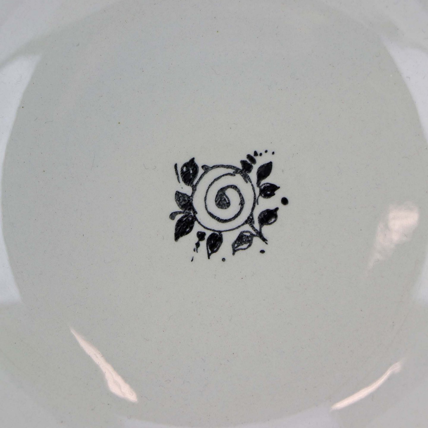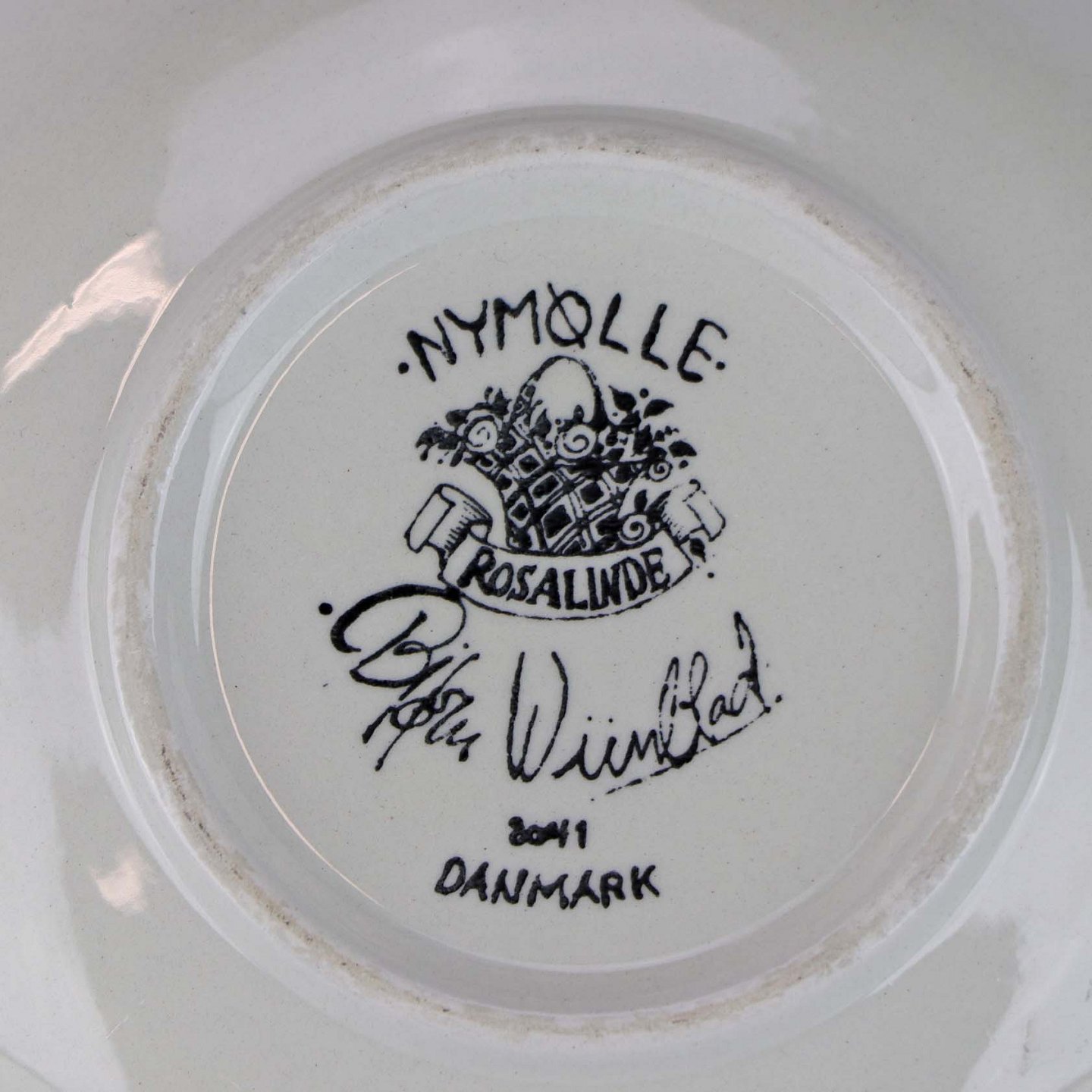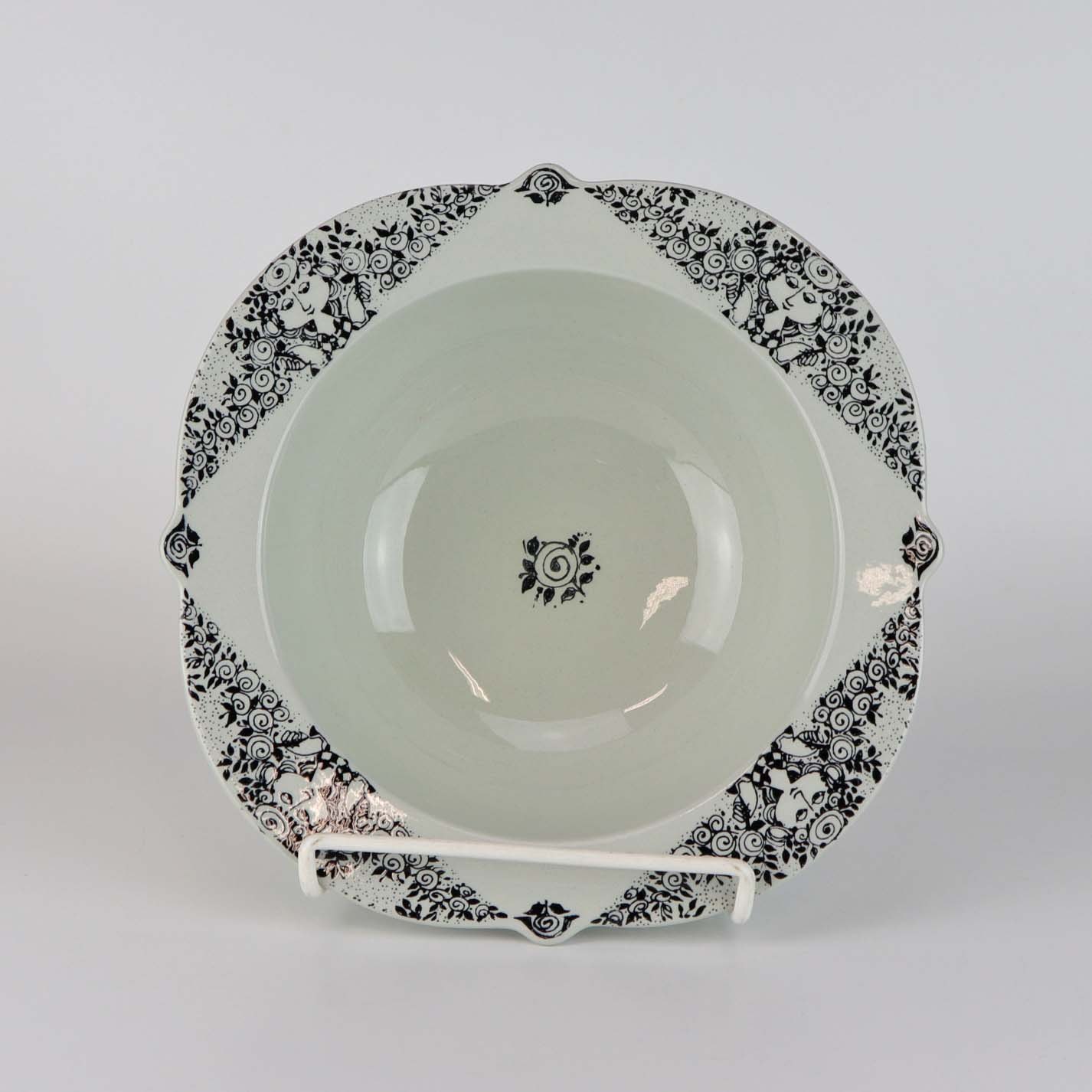 Kantet skål i porcelæn med motiv i sort streg af kvinde og med titlen Rosalinde. Nr. 3041