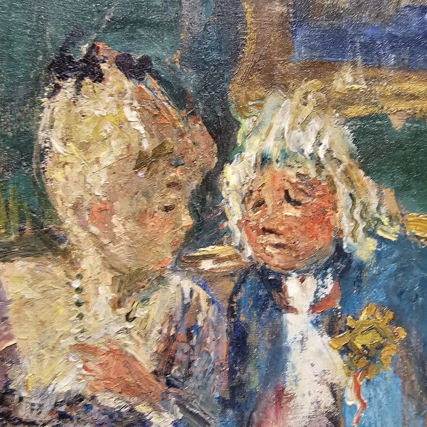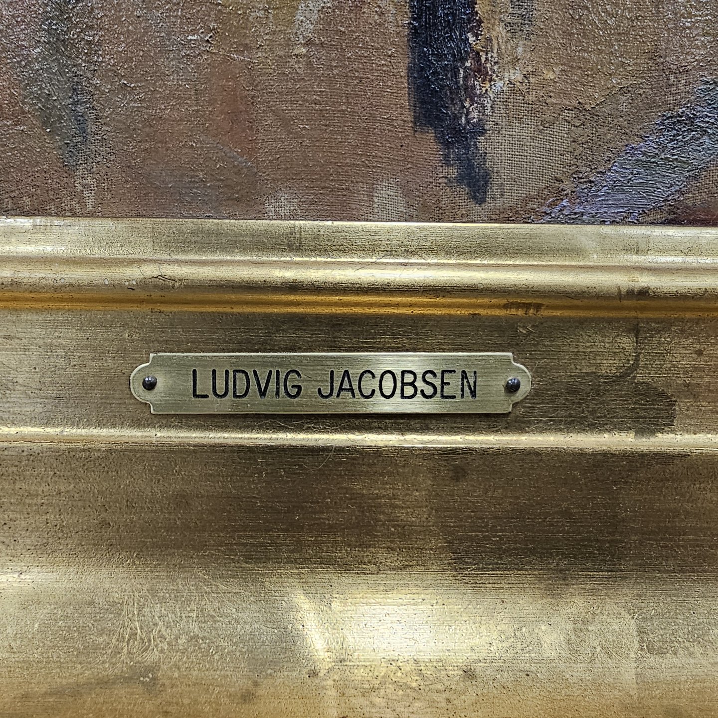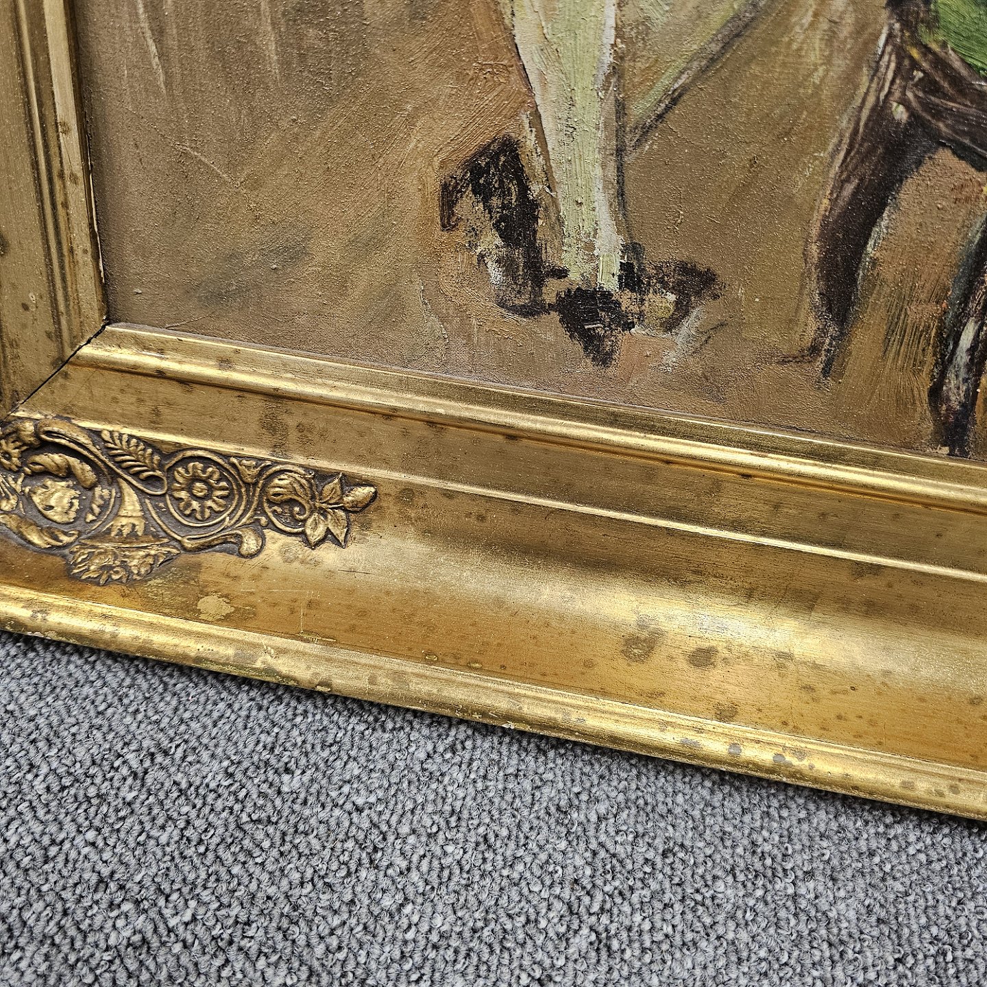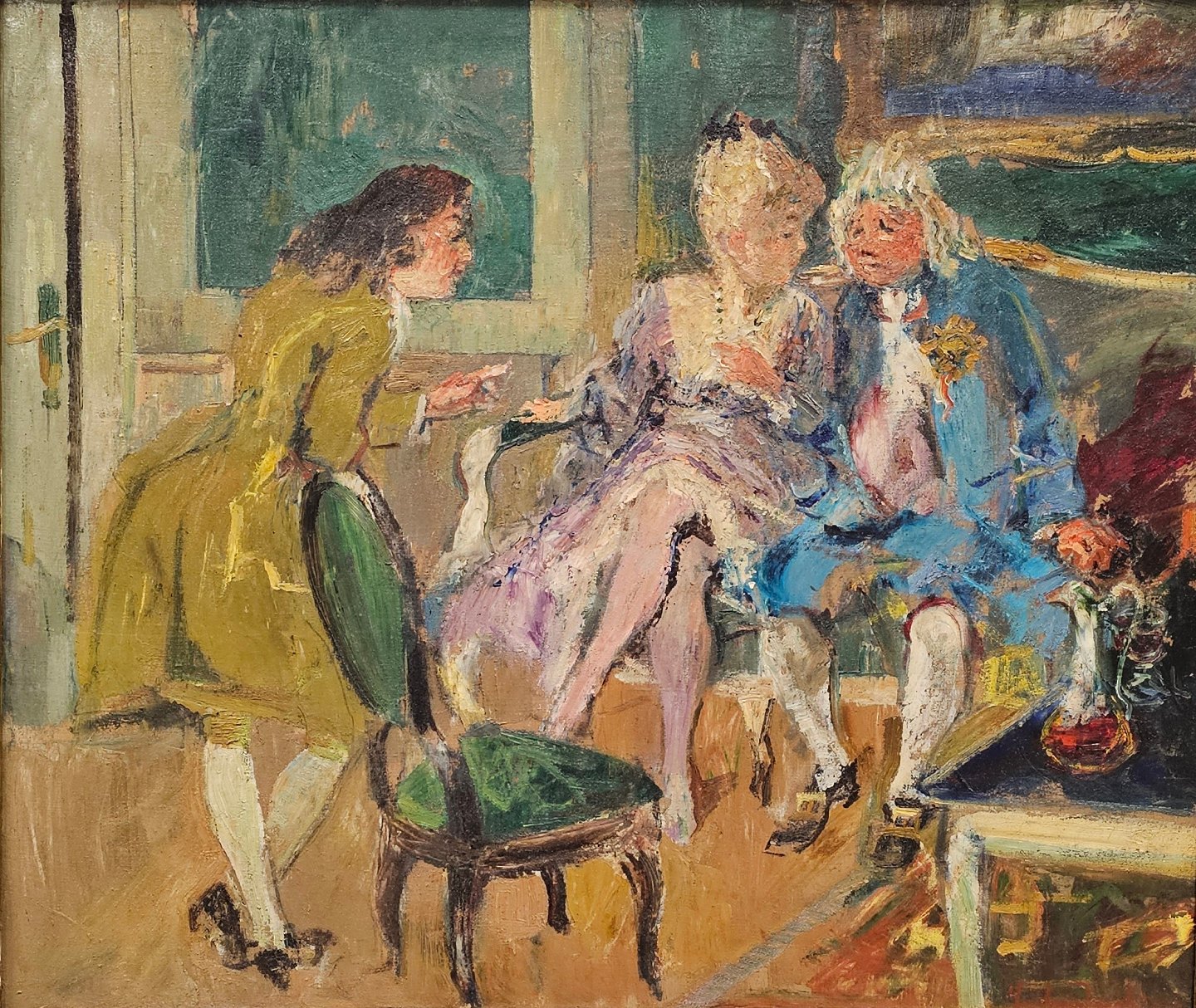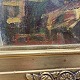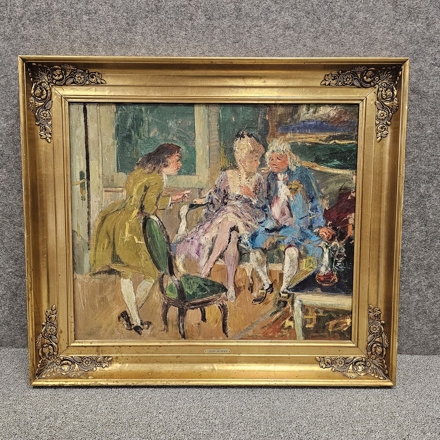 Oliemaleri, sat i guldramme, med motiv af tre mennesker i en stue.