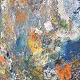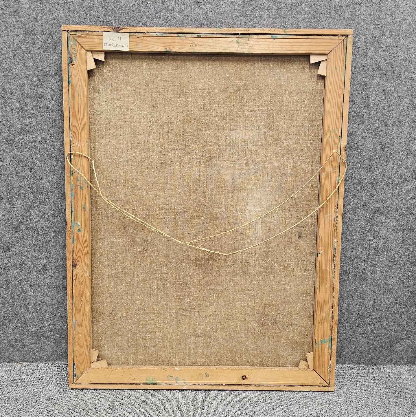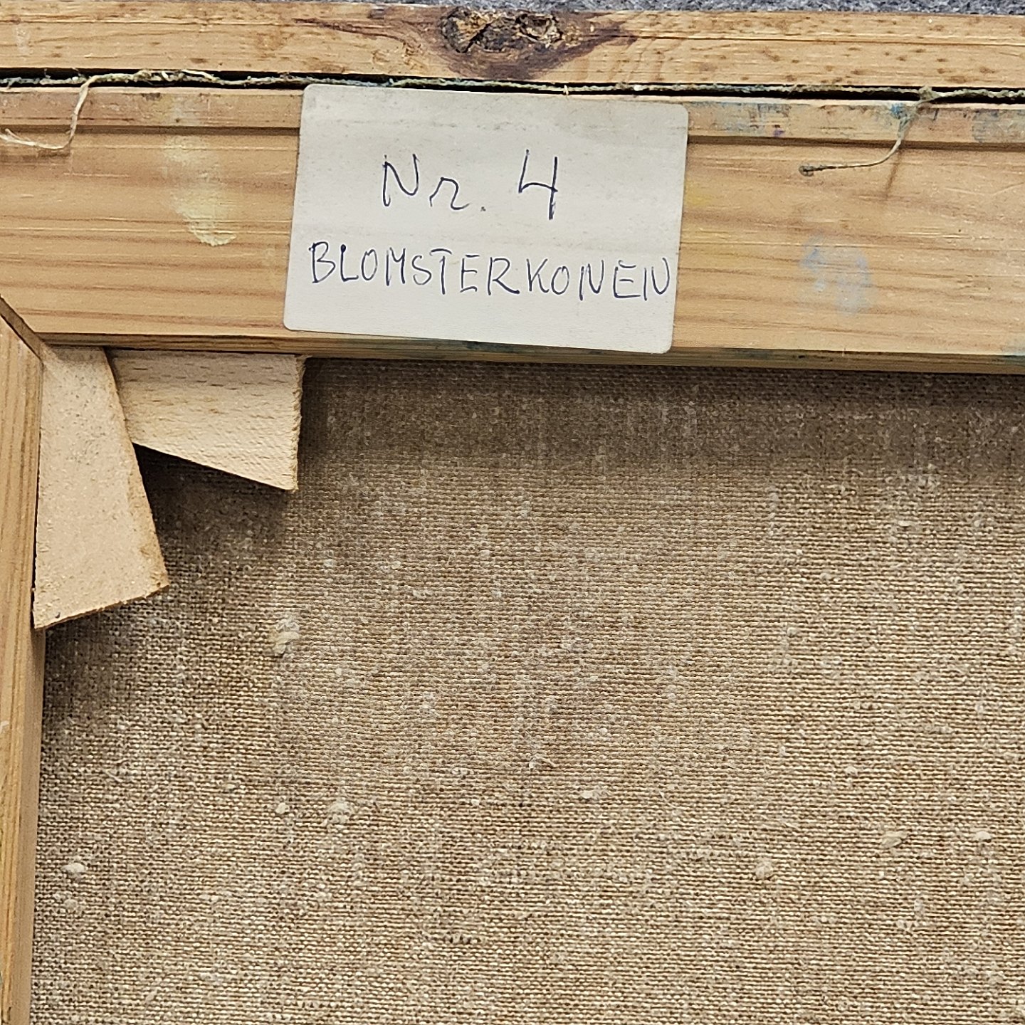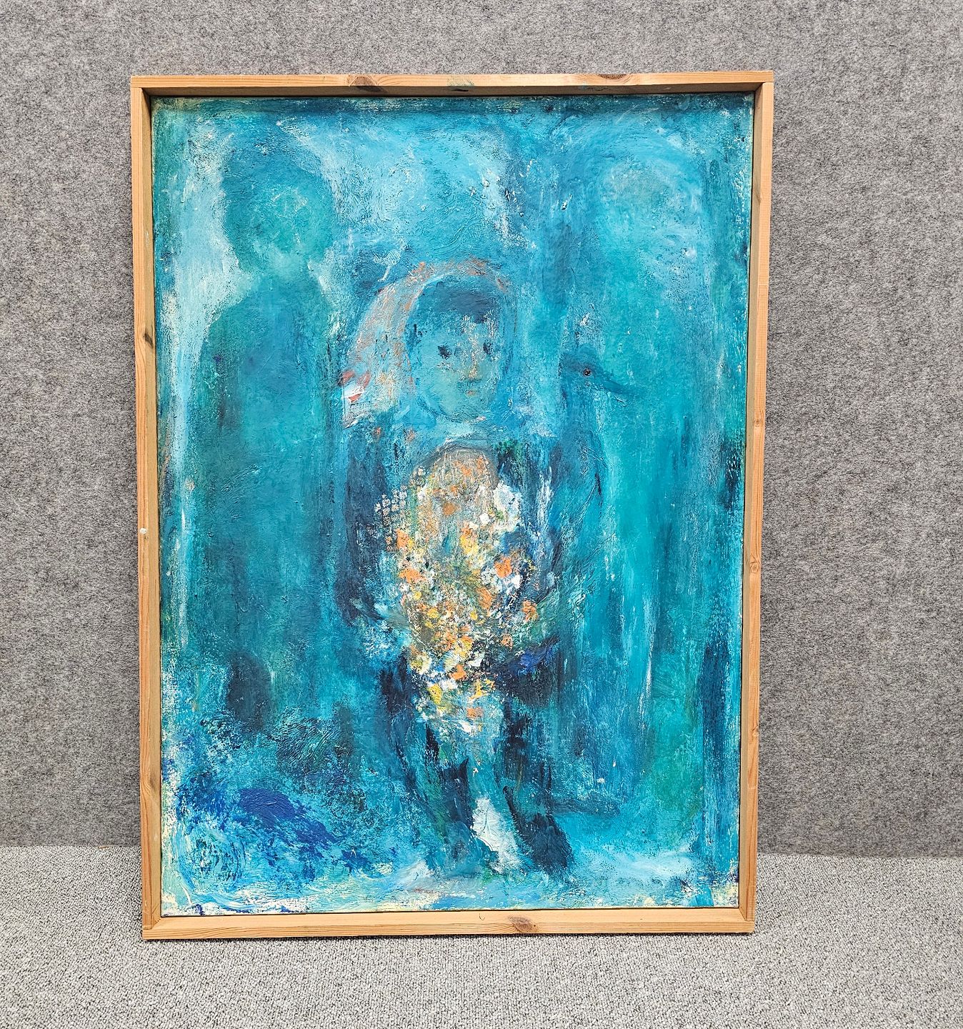 Oliemaleri på lærred, sat i træramme, med motiv af en kvinde med blomster i favnen, i blå nuancer.