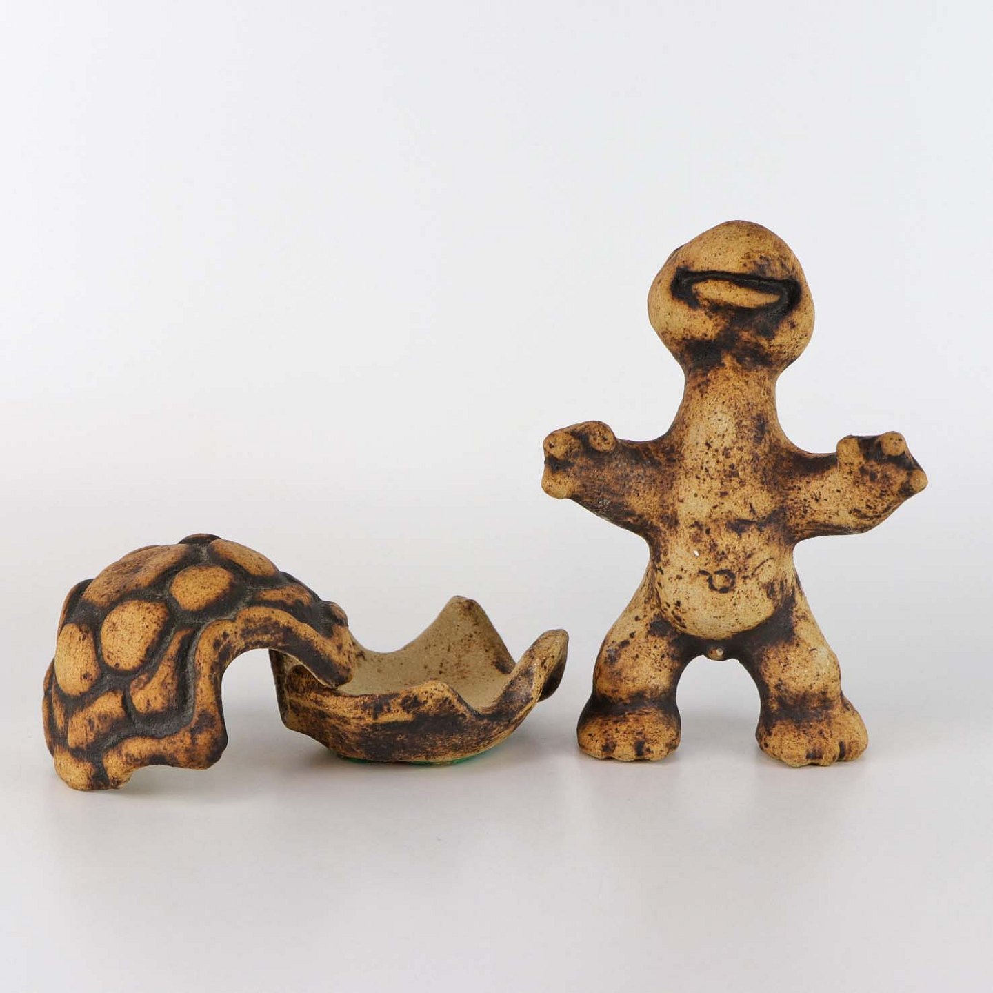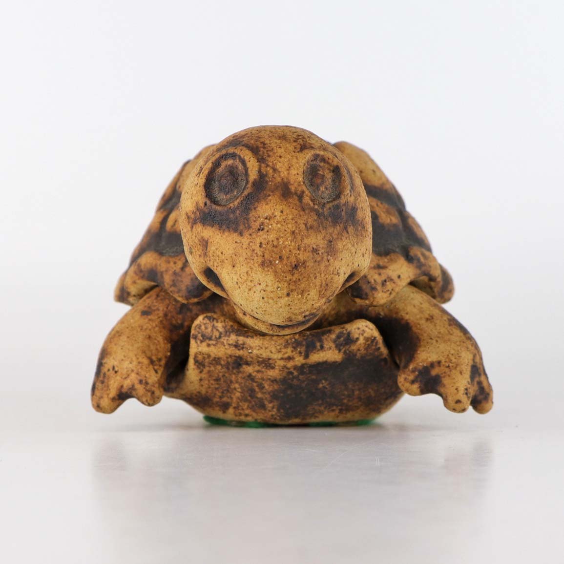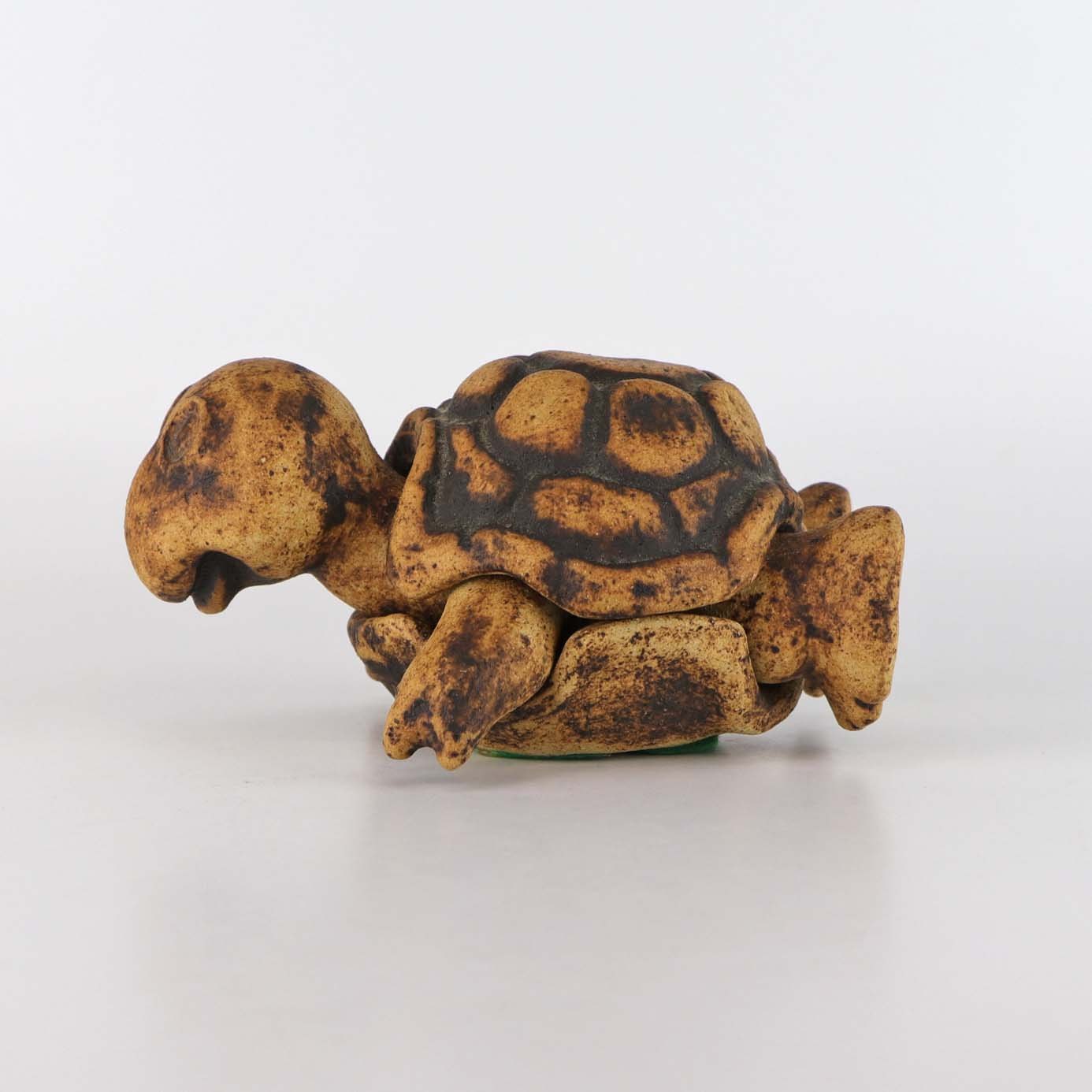 Figur i keramik med motiv af skildpadde. Figuren er tre-delt og består af over- og underskjold samt afklædt padde.