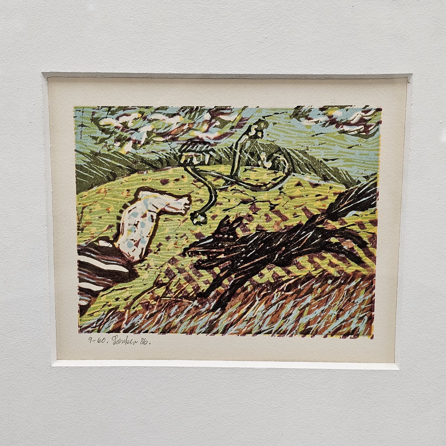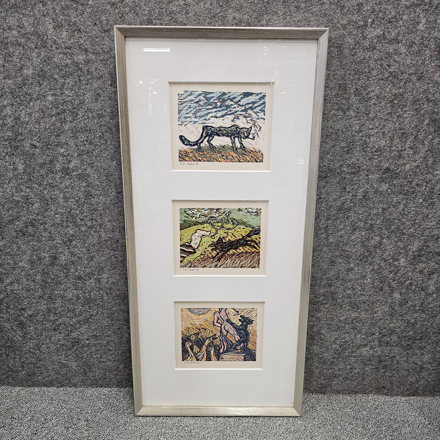 Tre små linoliumssnit i skifteramme, med forskellige motiver.