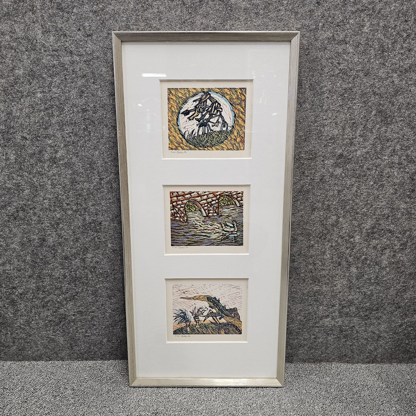 Tre små linoliumssnit i skifteramme, med forskellige motiver. Del af et sæt.