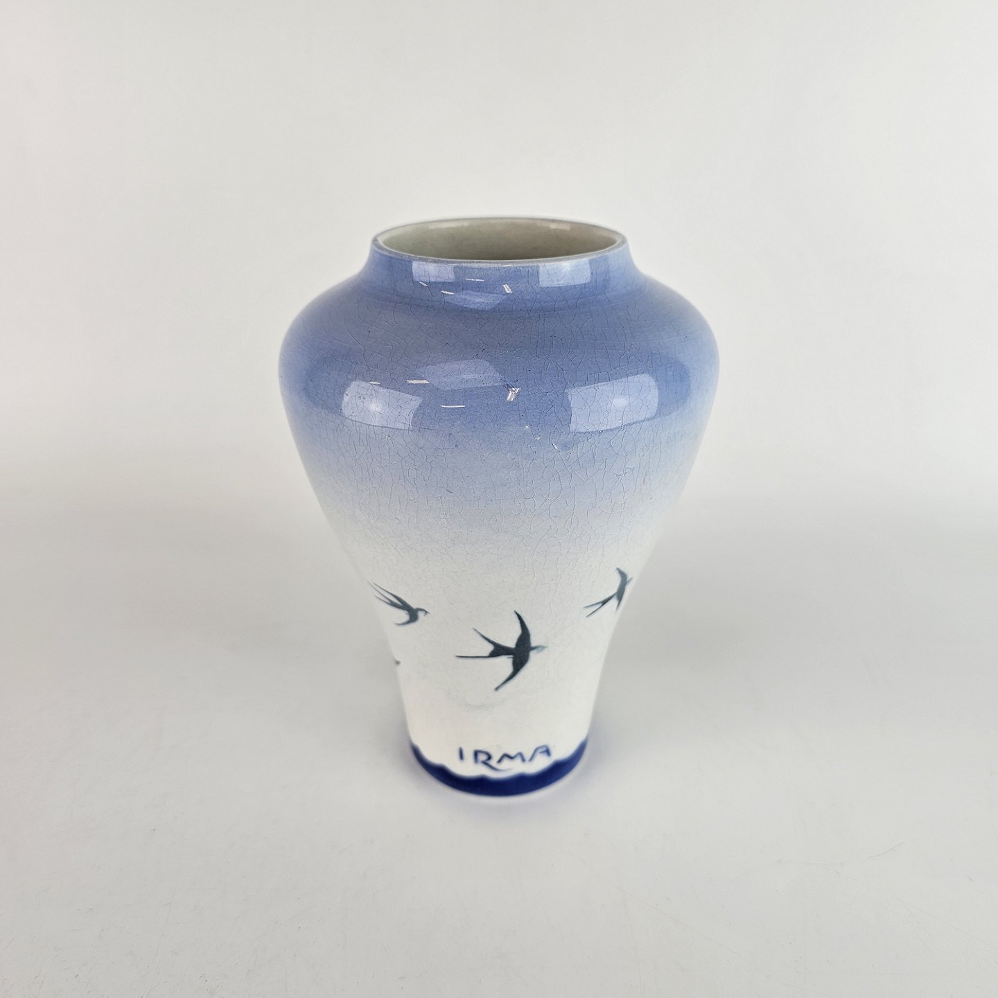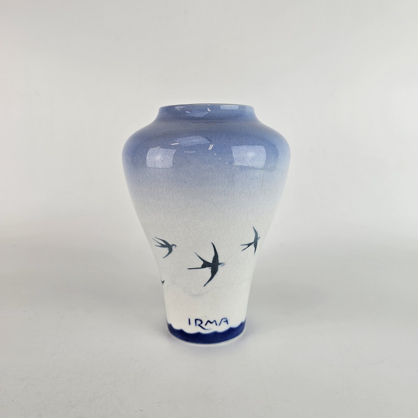Irma vase i fajance med motiv af svaler som flyver over vand.