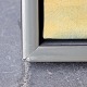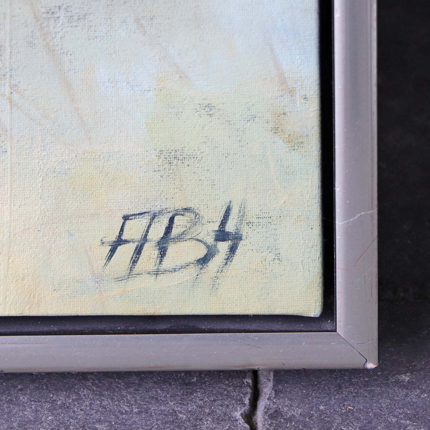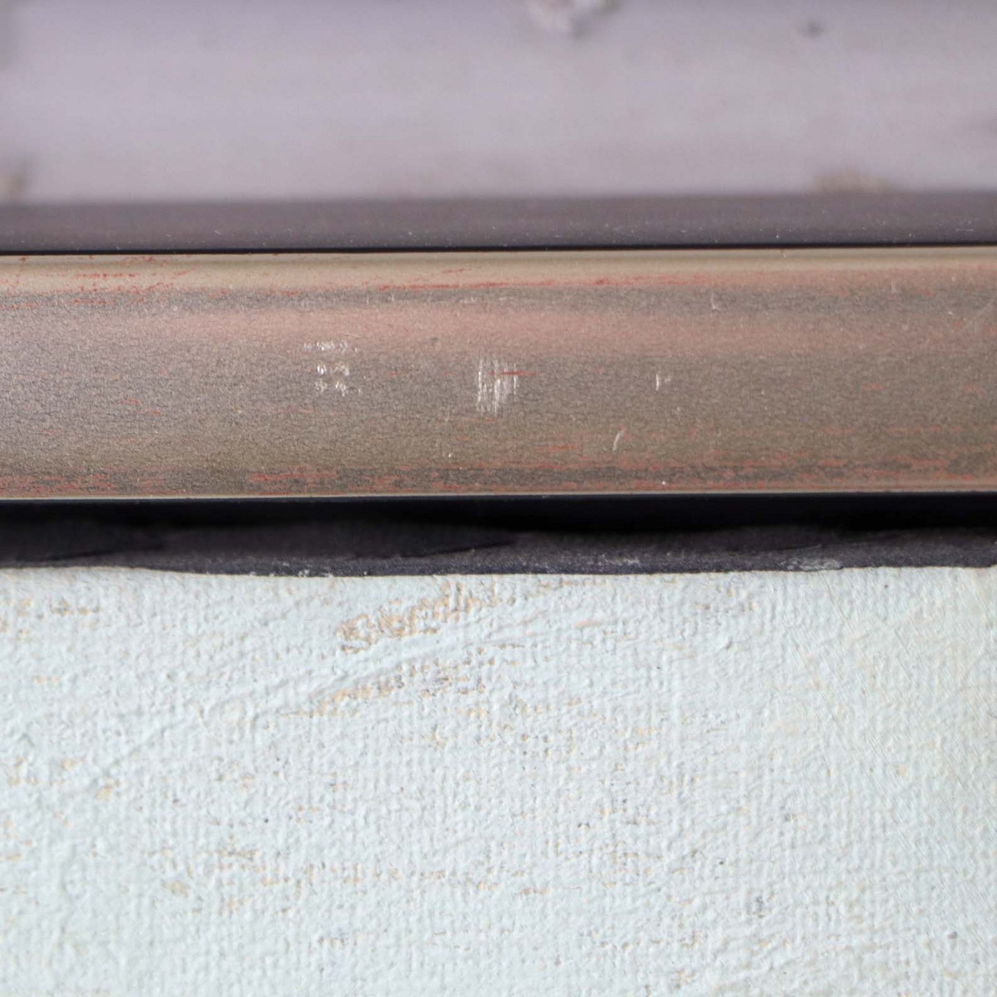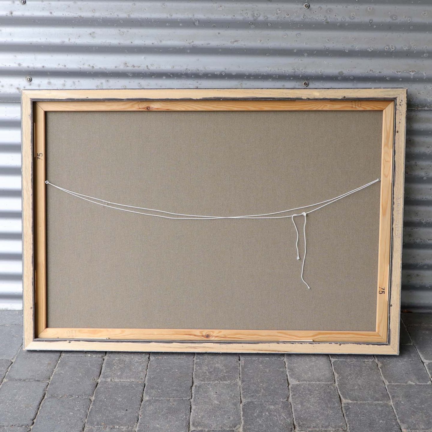 Maleri på lærred monteret i sortmalet træramme med sølvmalet kant. Abstrakt landskabsmotiv med jordtoner.
