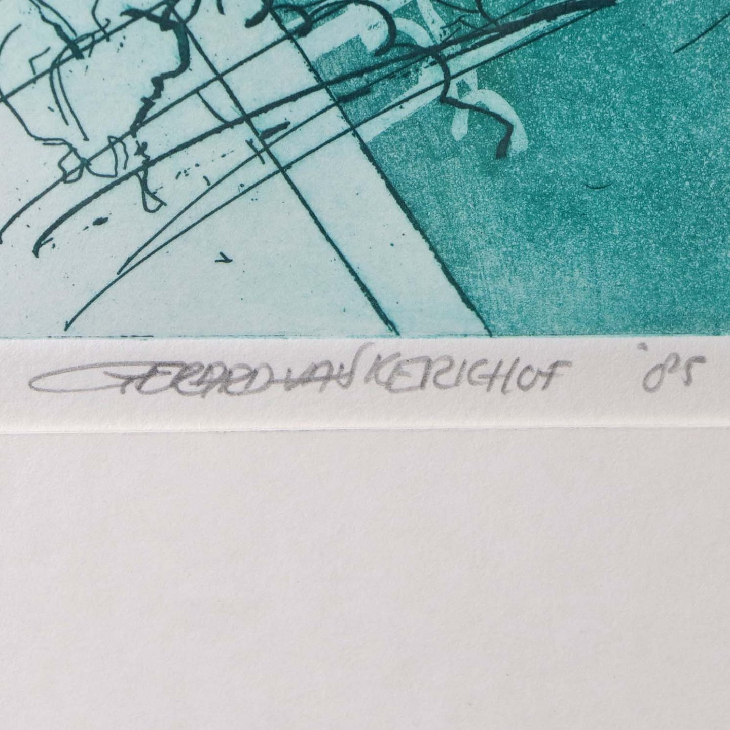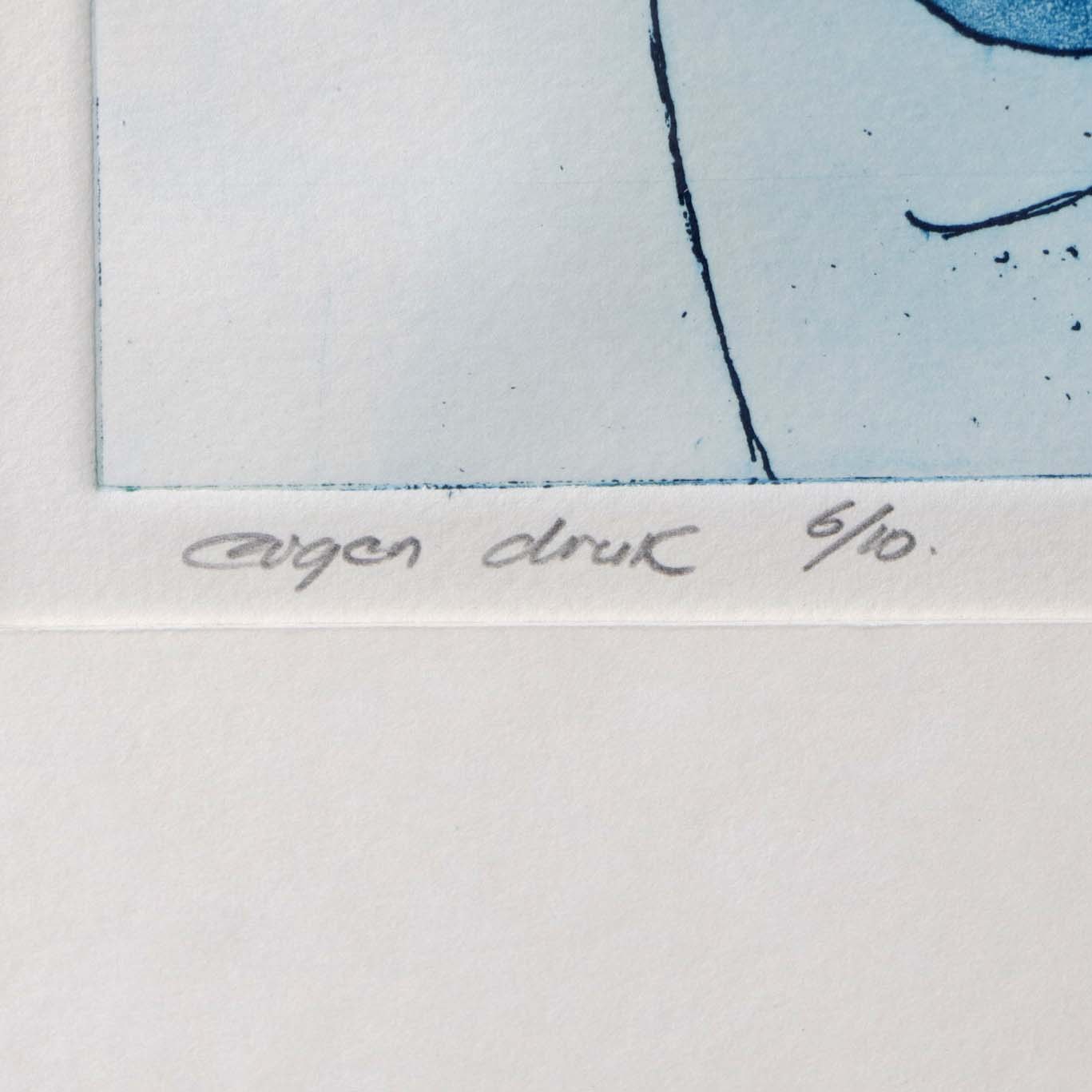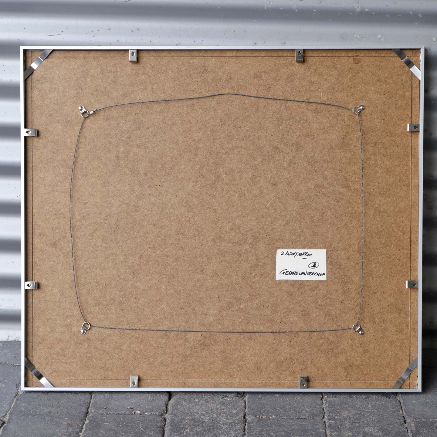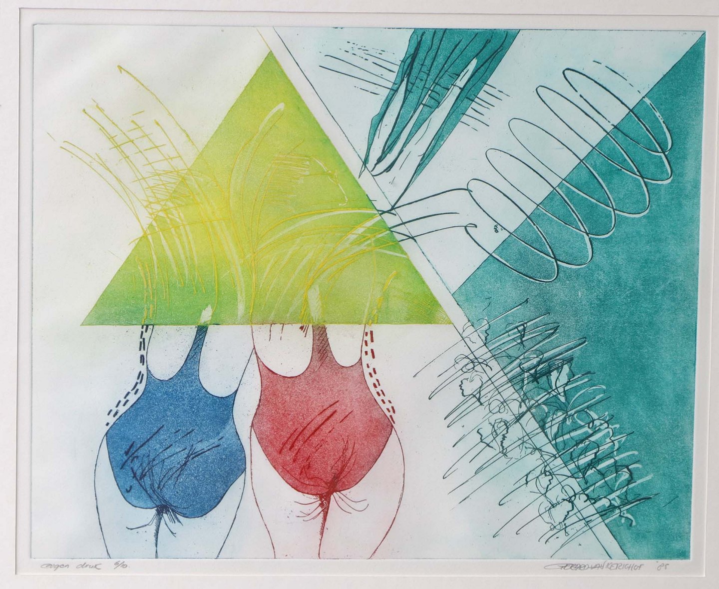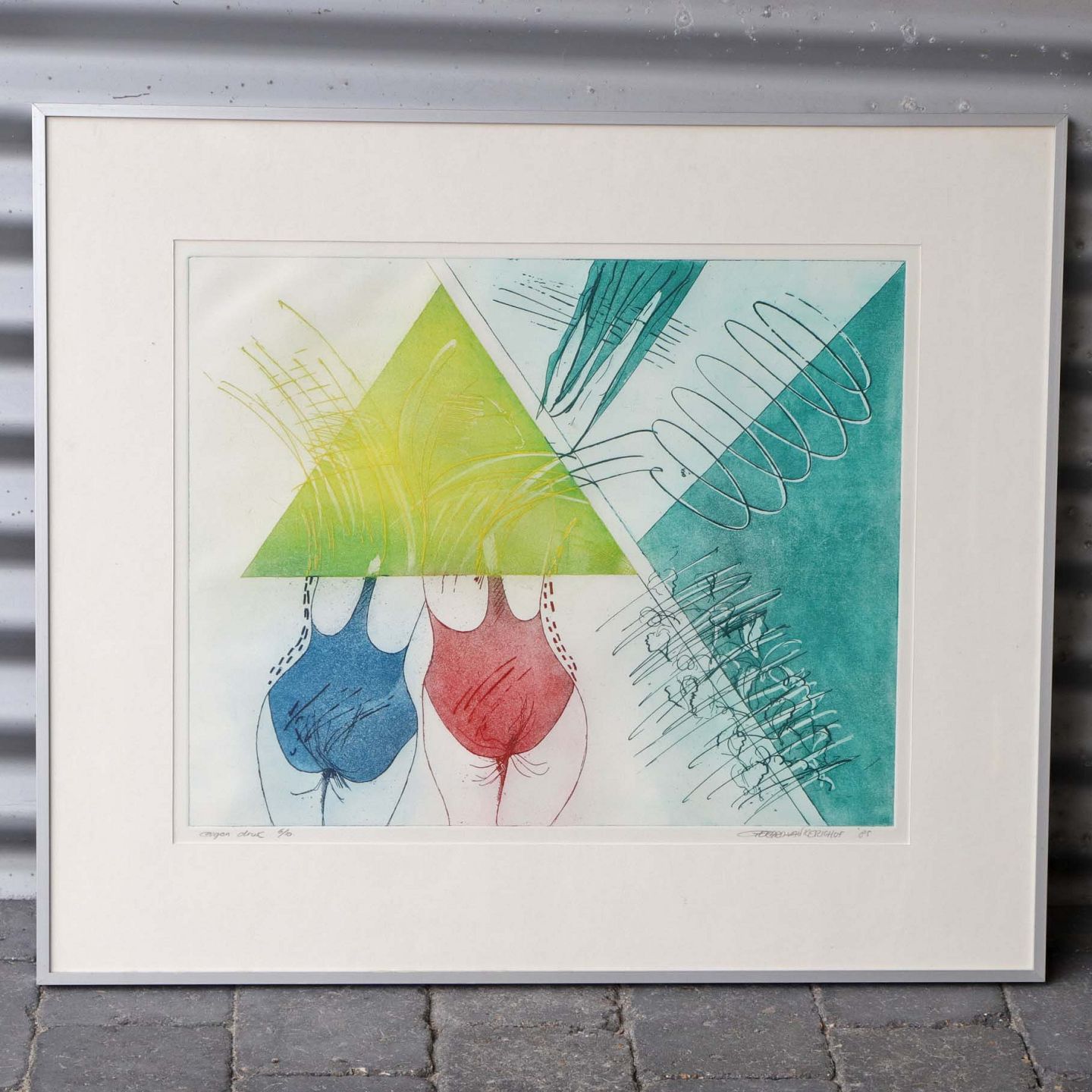 Indrammet litografi med passpartout i grå aluminium ramme med motiv af to kvinder i badedragt. Dateret 1985. Nr. 6 ud af 10 eksemplare.