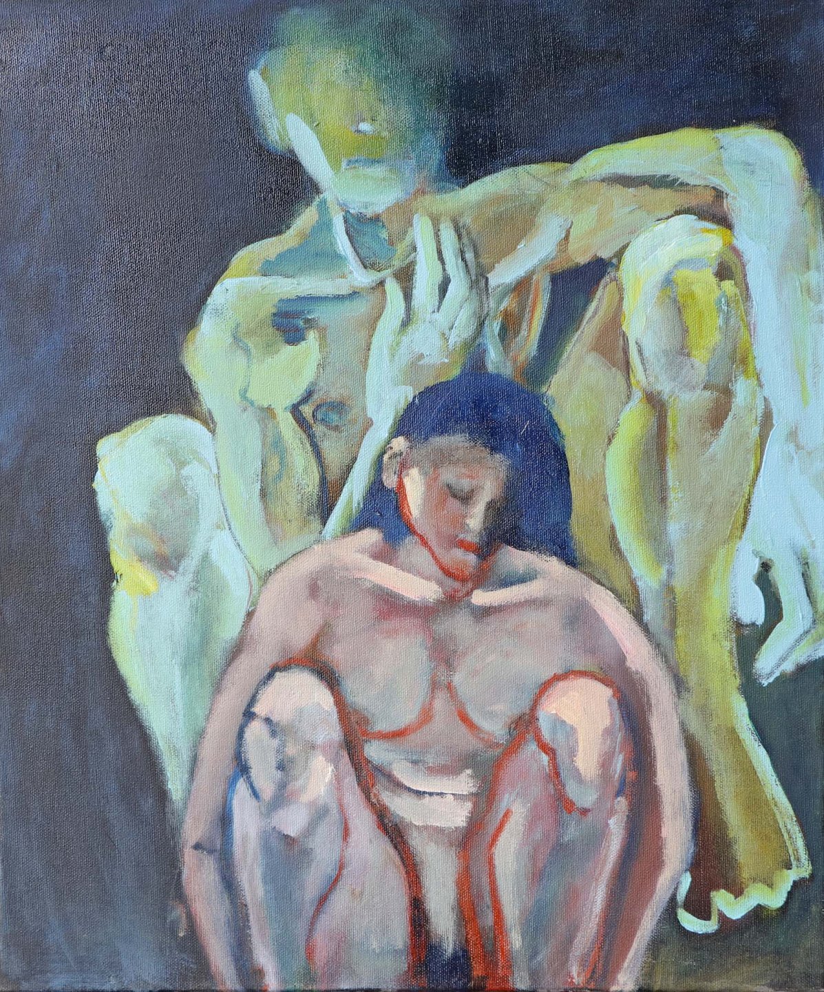 Maleri på lærred opspændt på træramme med motiv af en mand bagved en nøgen kvinde.
