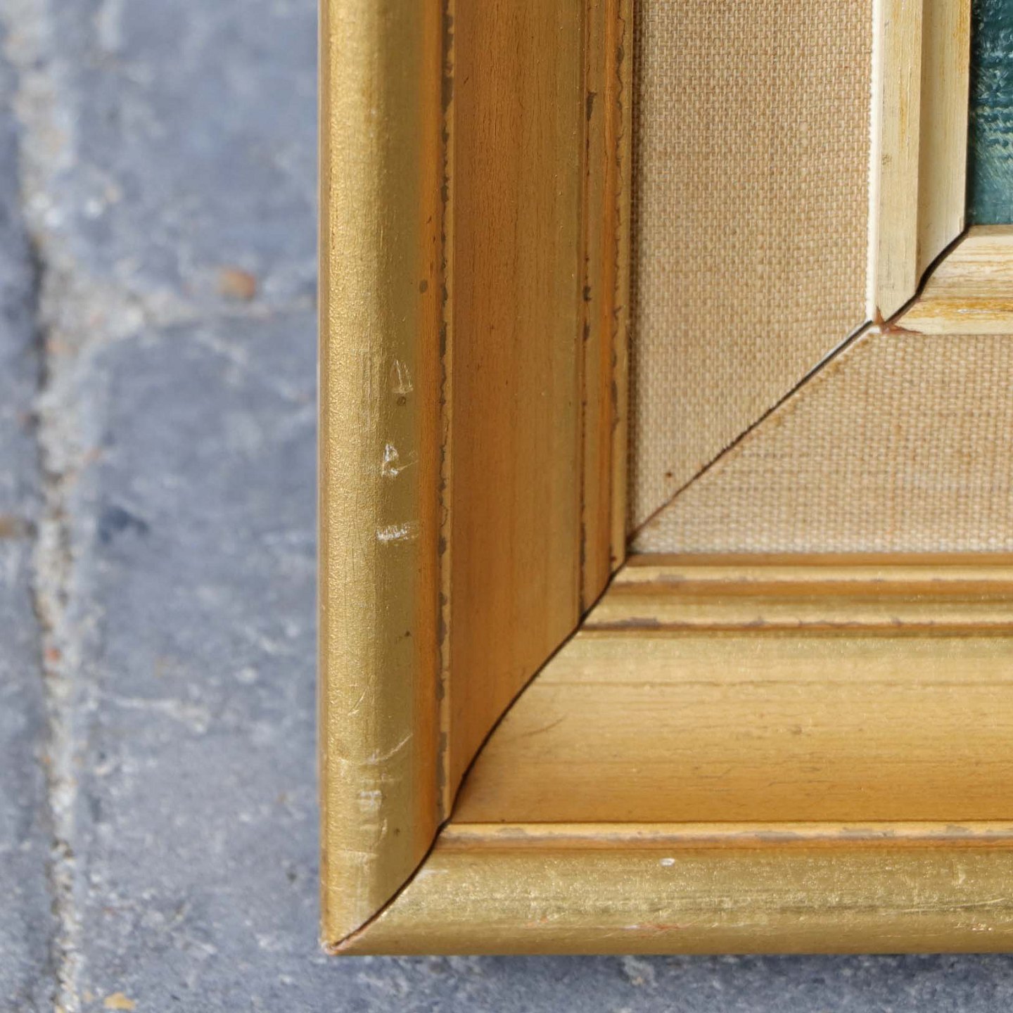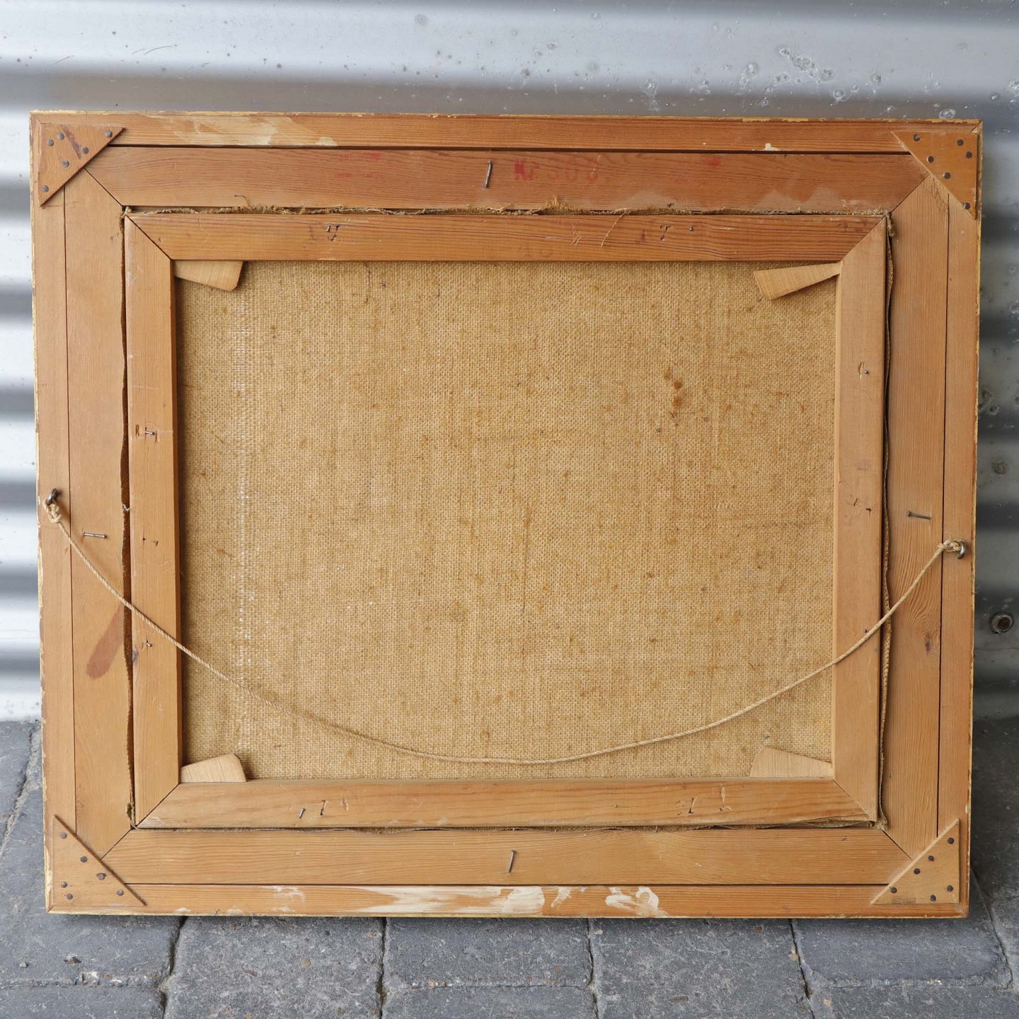 Oliemaleri på lærred i guldmalet træramme med landskabsmotiv af nøgne træer i kuperet terræn.