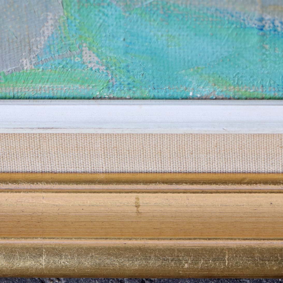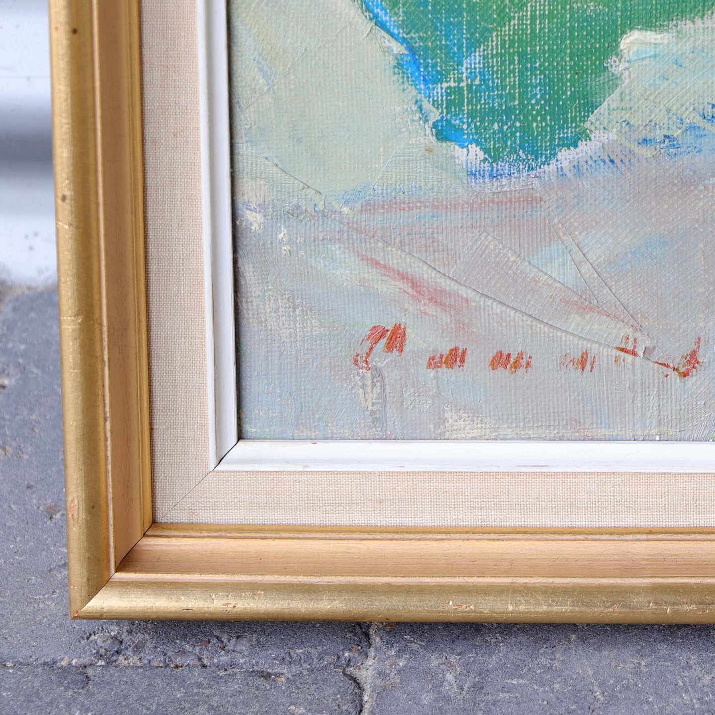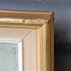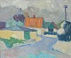 Oliemaleri på lærred med guldmalet ramme. Byskabsmotiv af huse ved mindre vej.