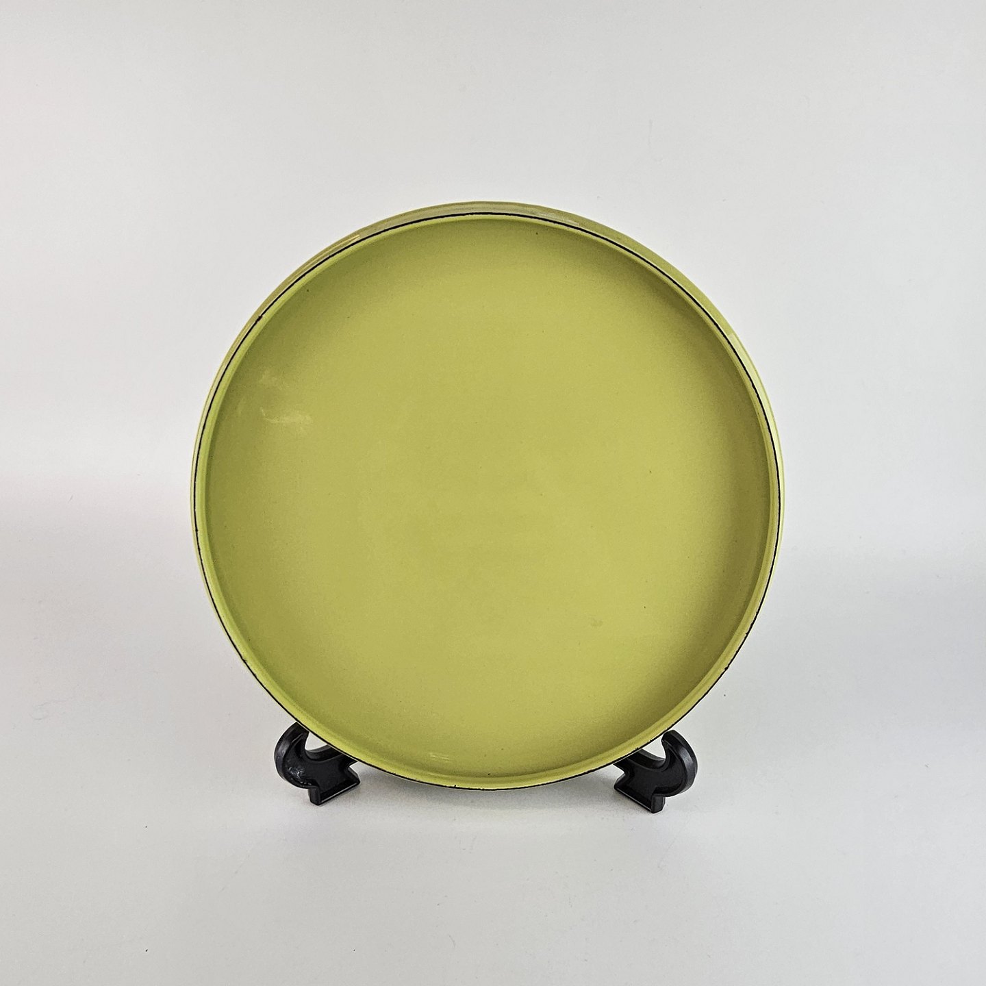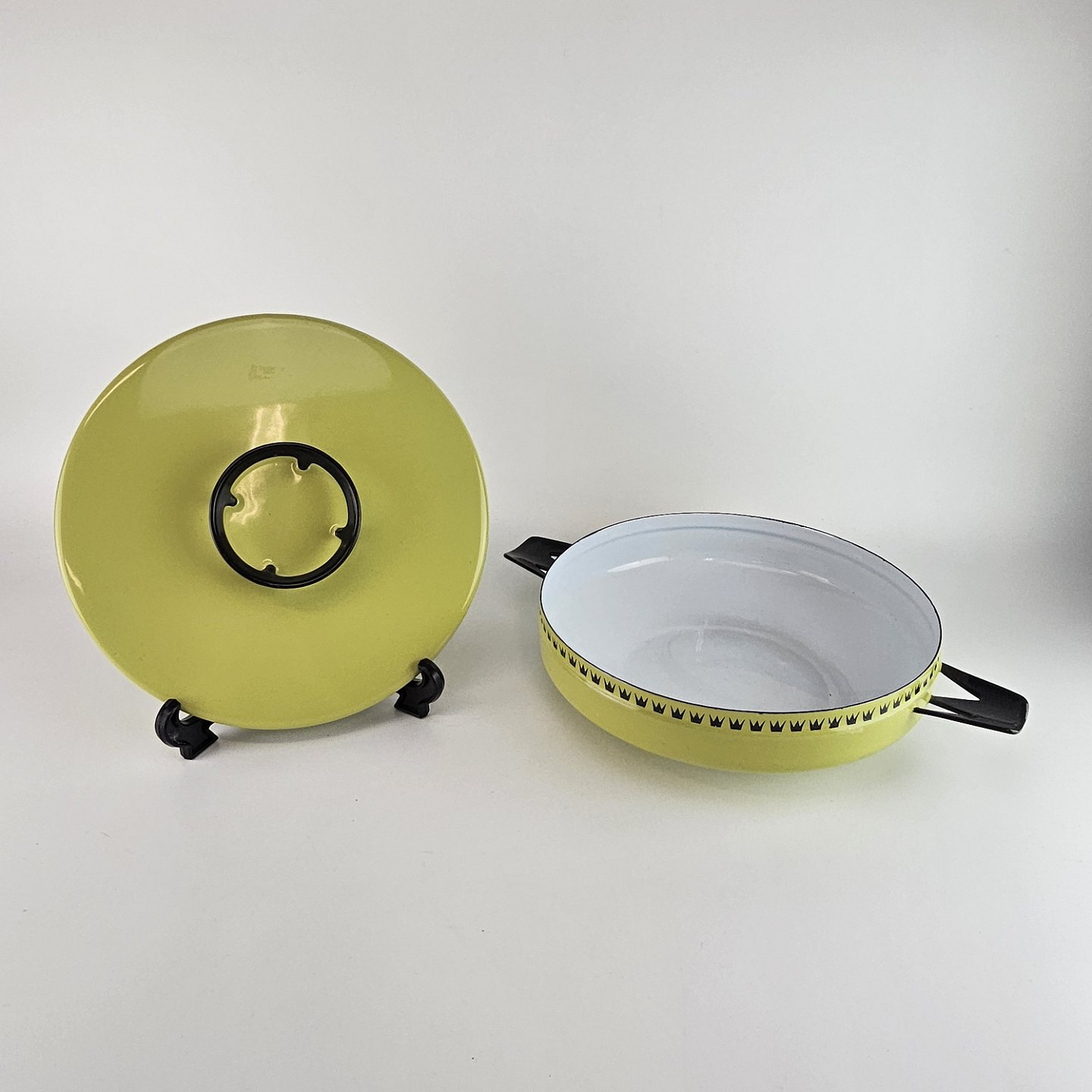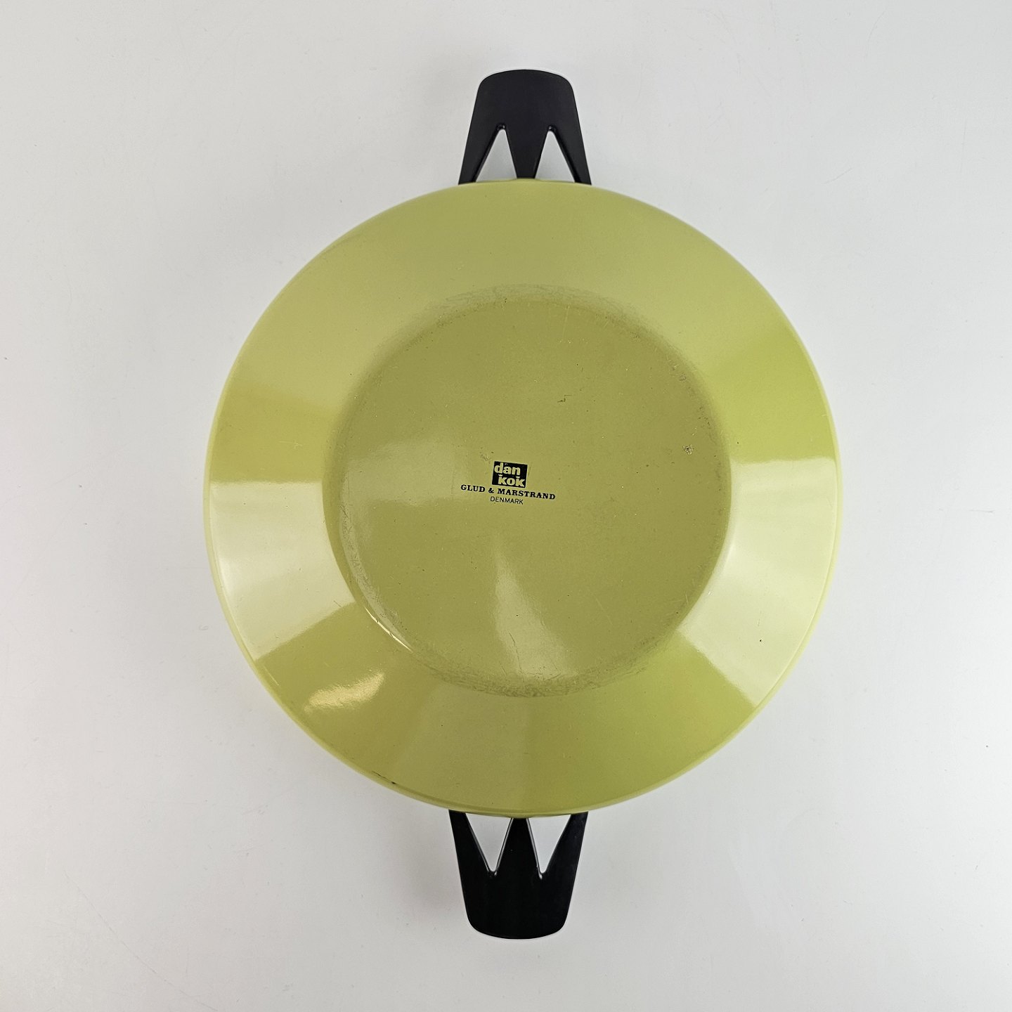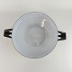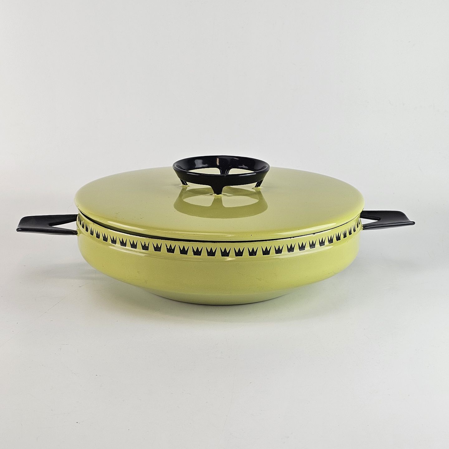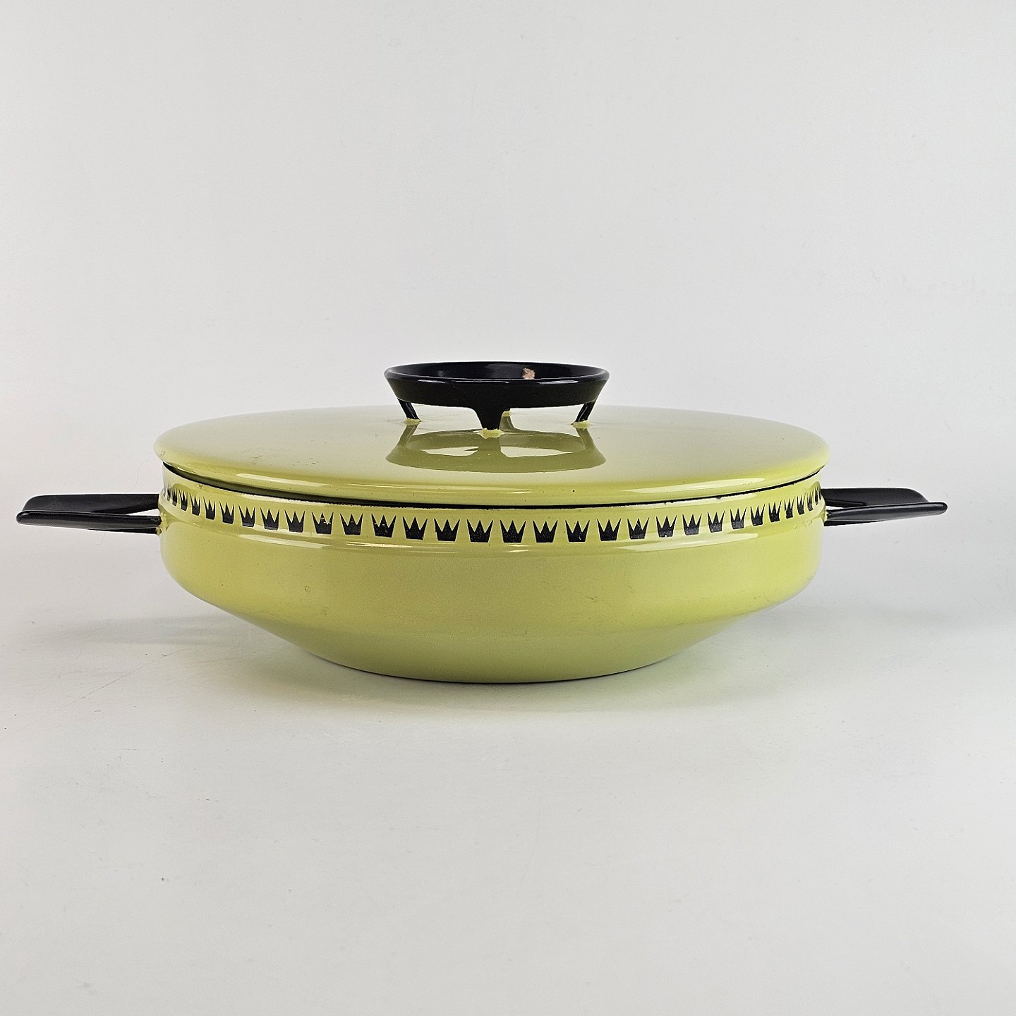 Grøn gryde af emalje, med dekoration langs kanten.