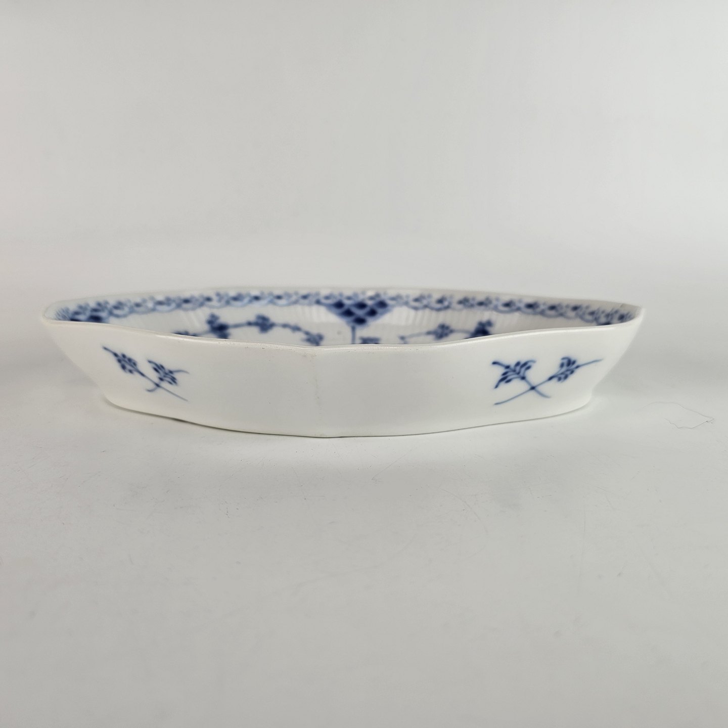 Musselmalet halvblonde er riflet hvidt porcelæn med dekoration af blå ranker og en kant med blonder.