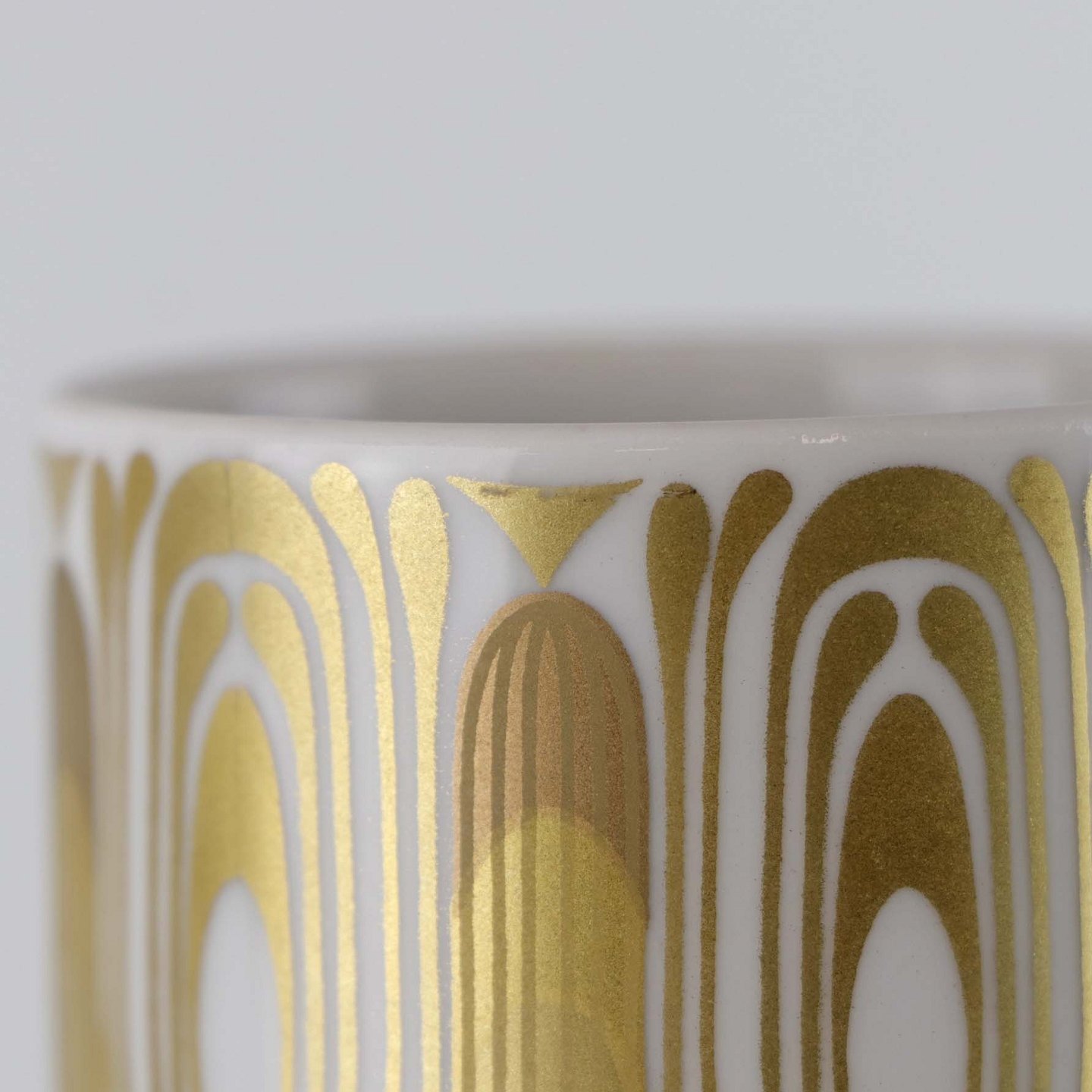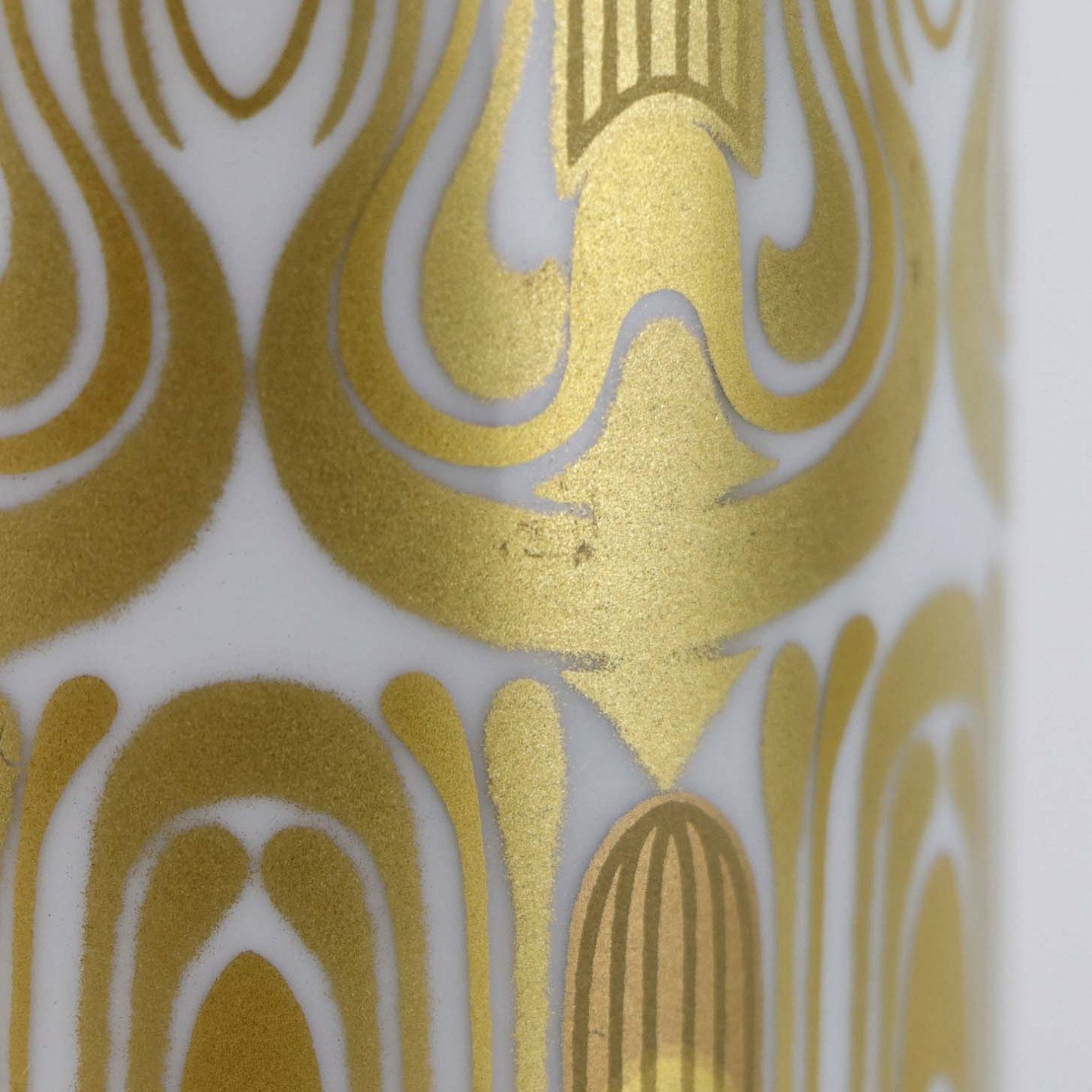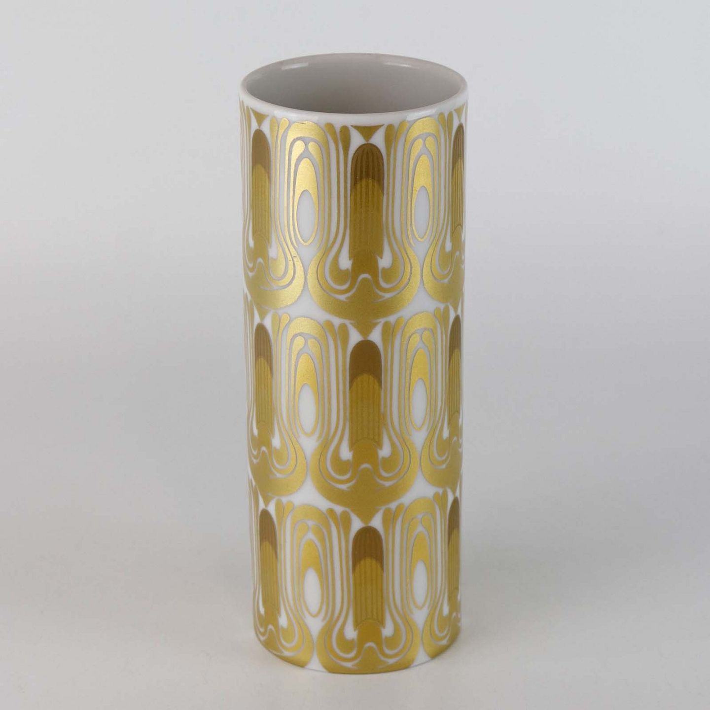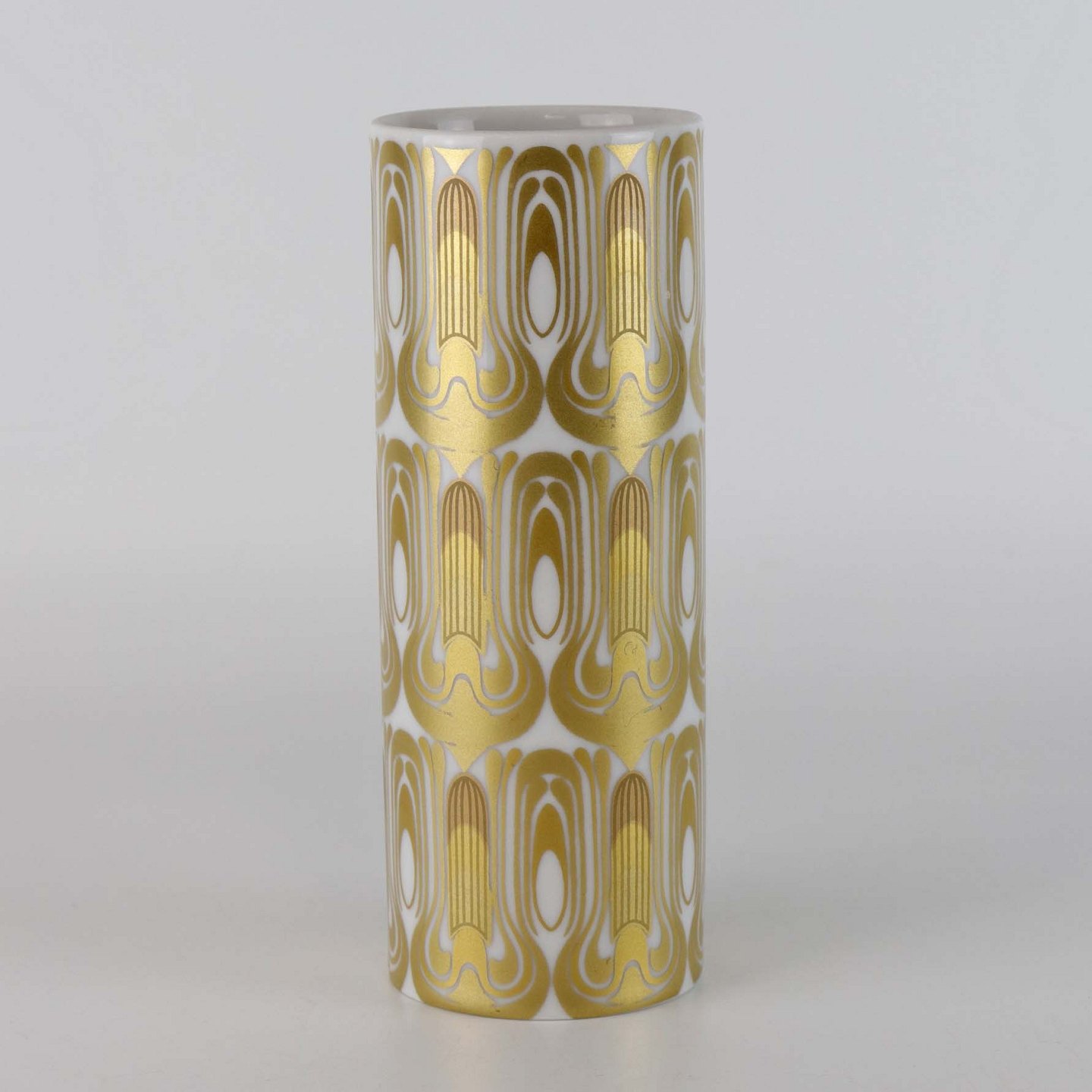 Cylinderformet vase i hvidt porcelæn med gylden dekoration