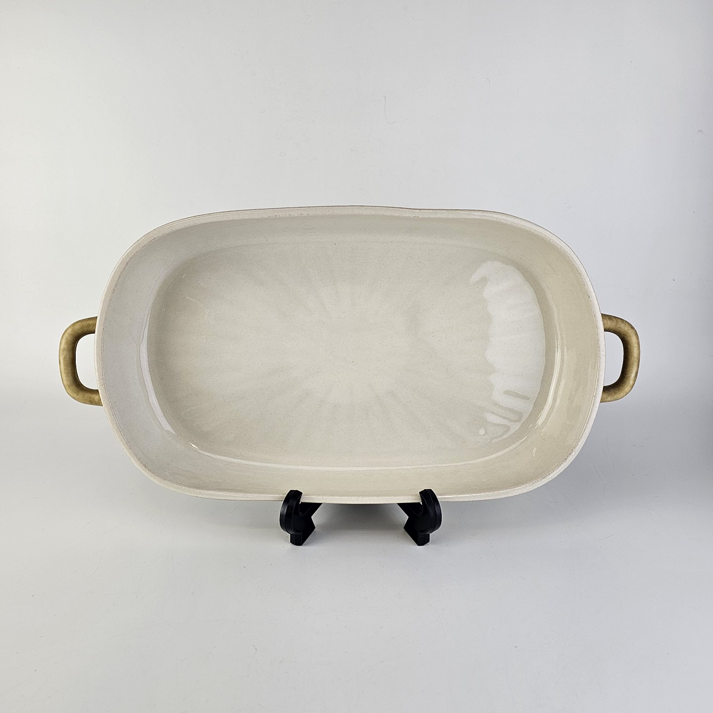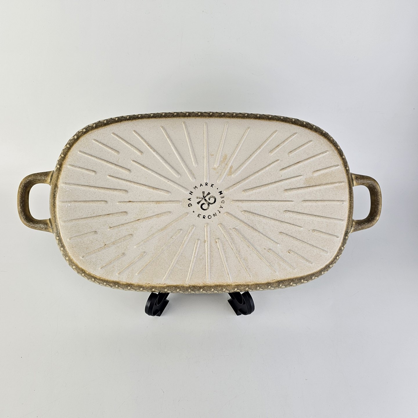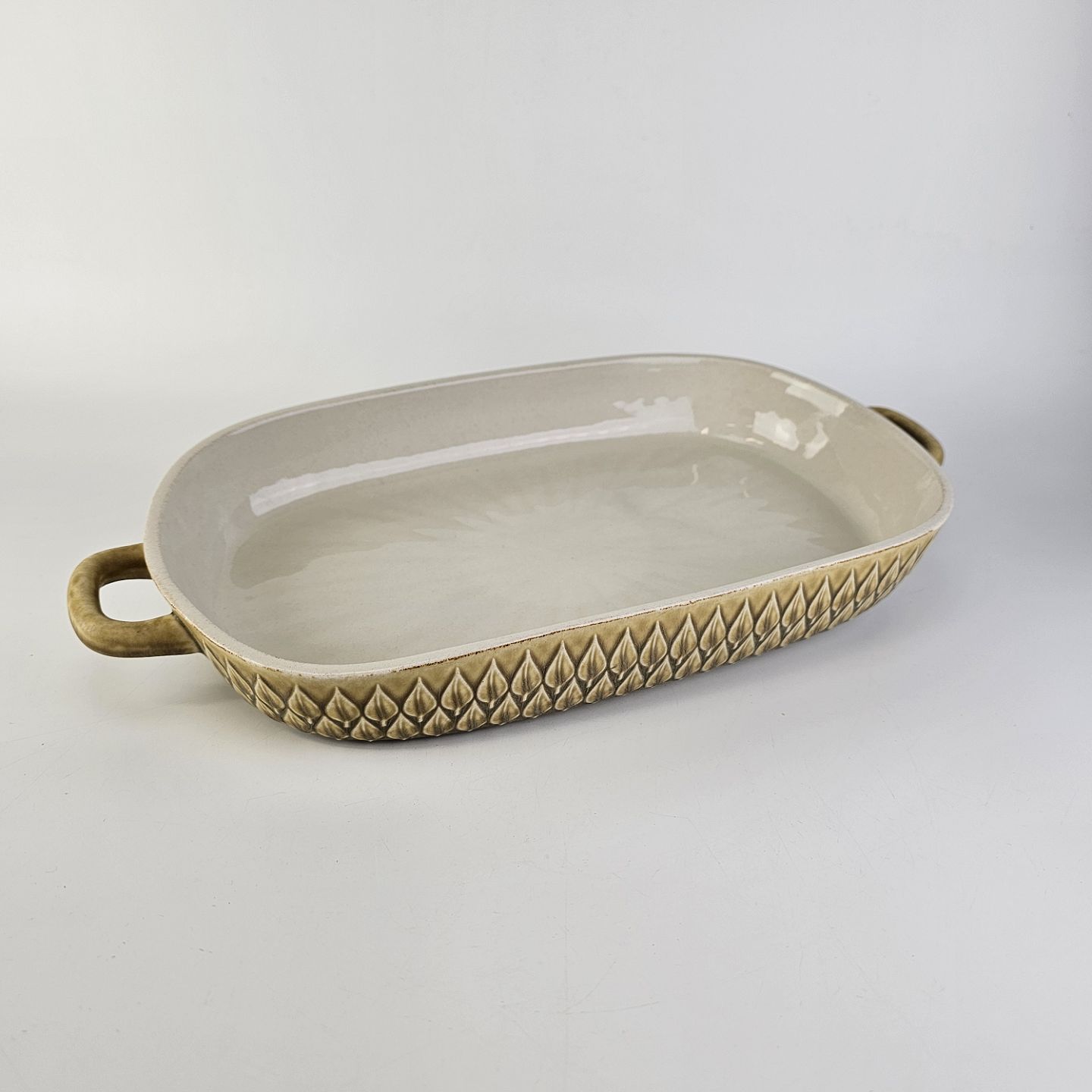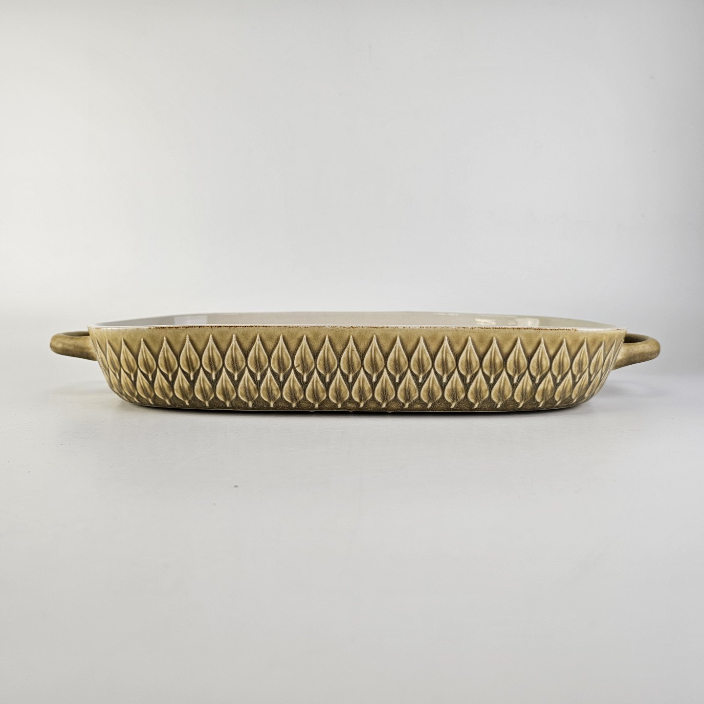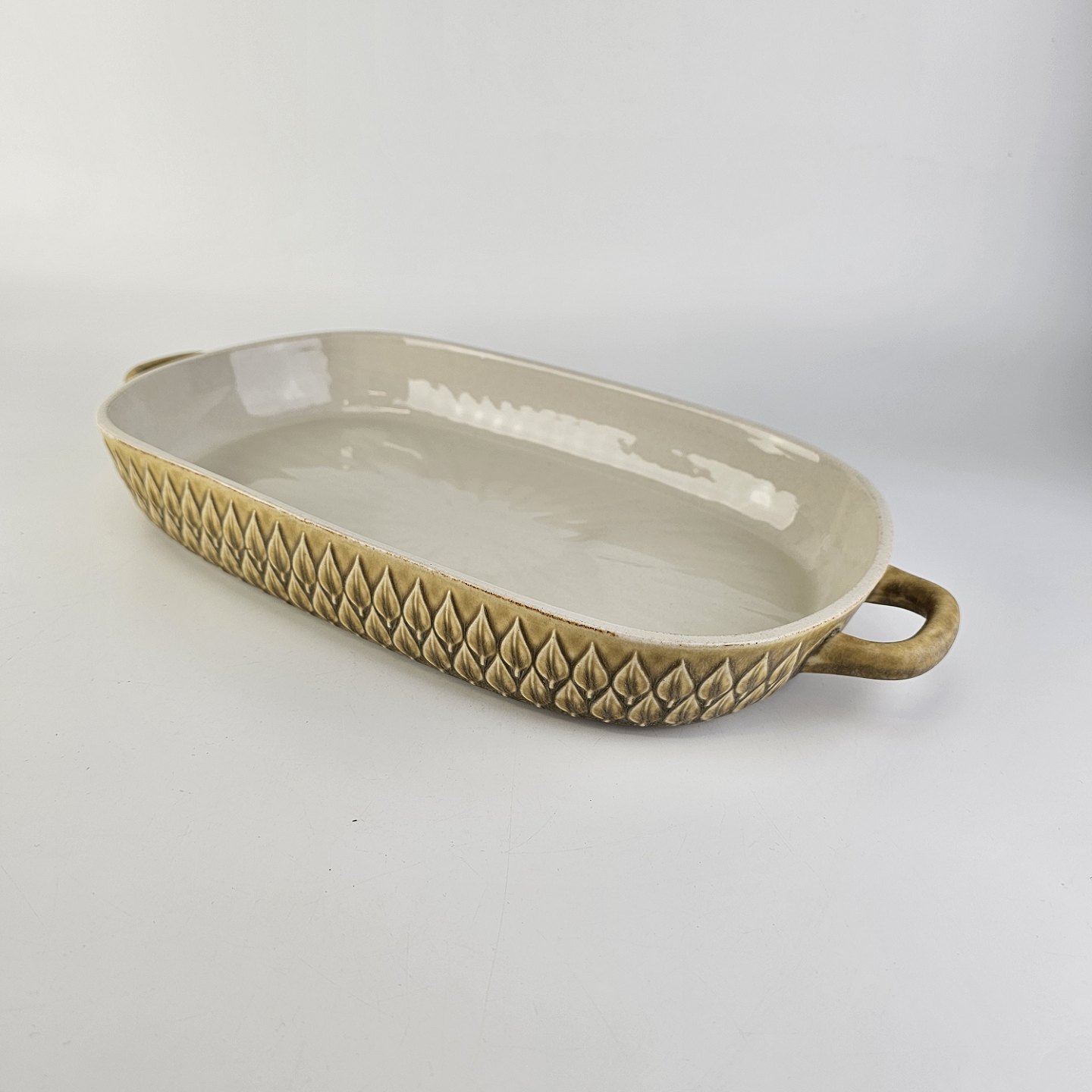 Aflangt fad med ører i stentøj fra stellet Relief.
