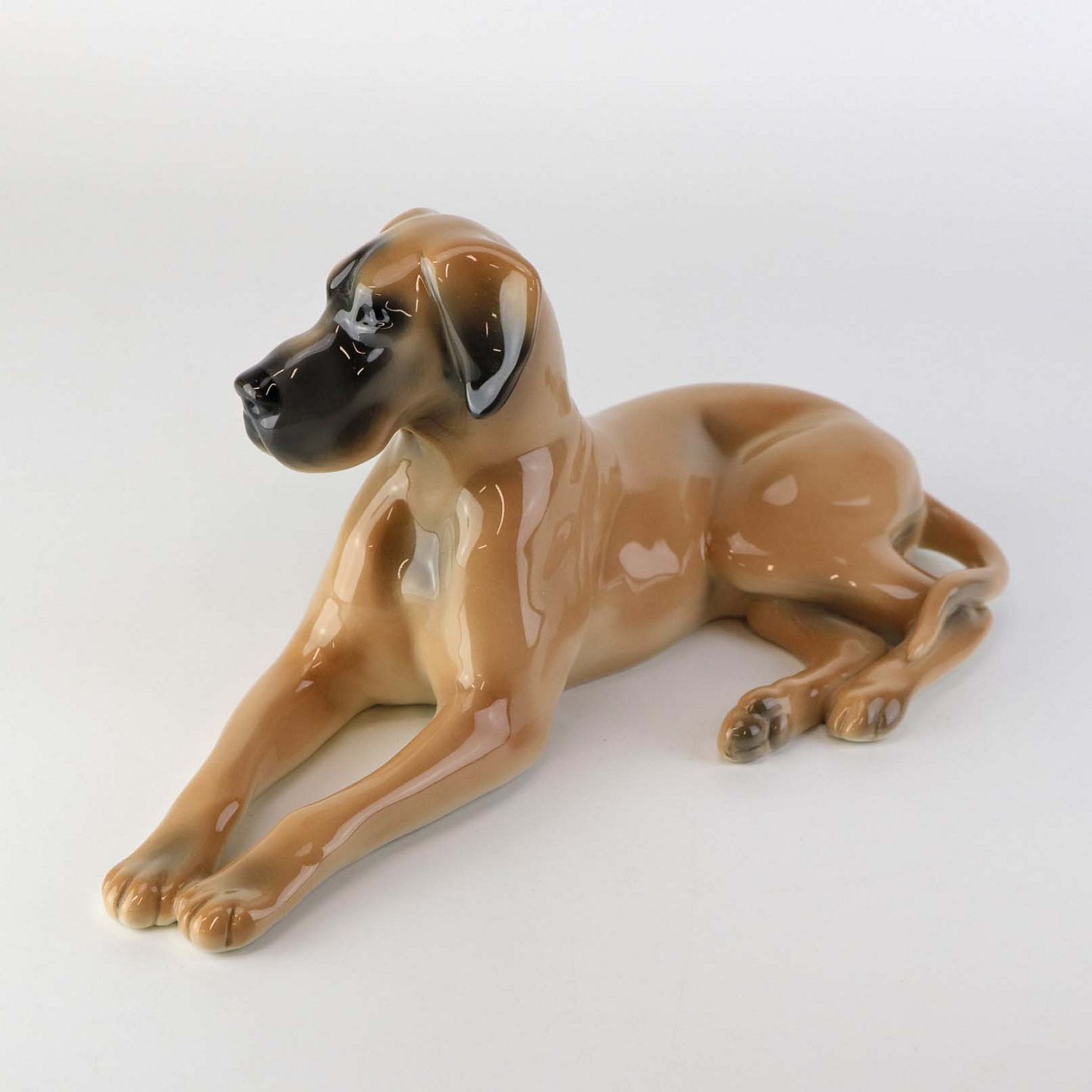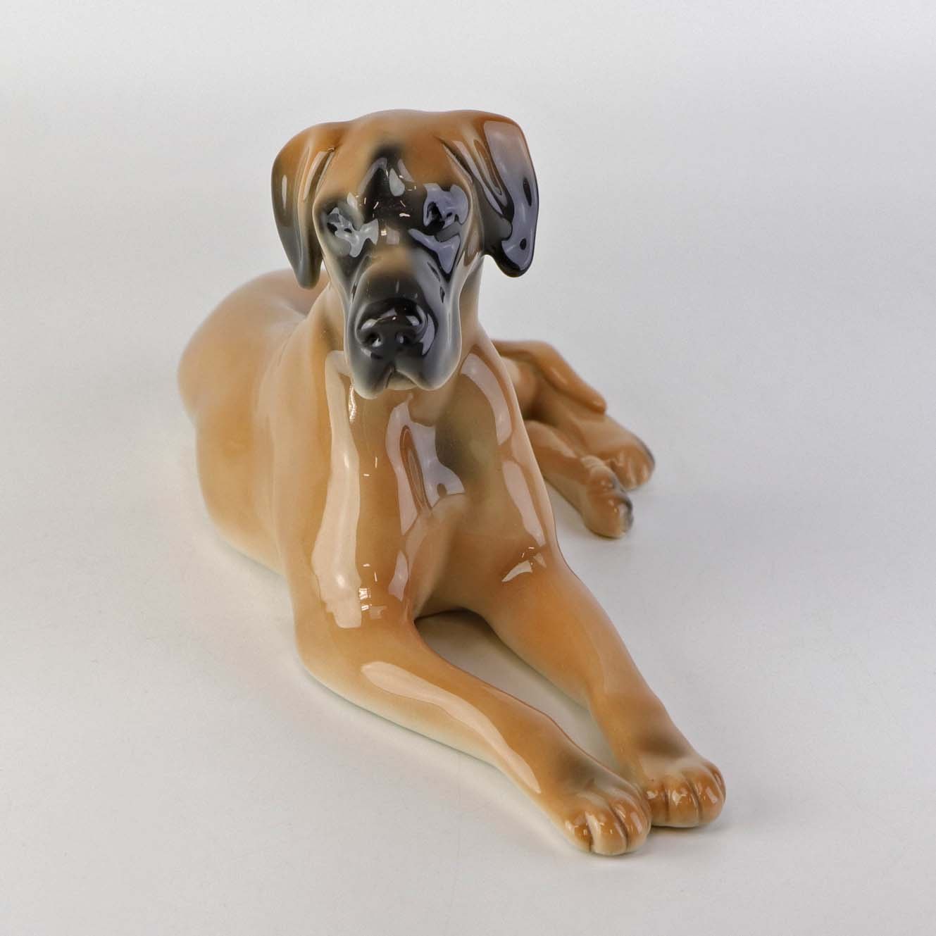 Figur i porcelæn med motiv af liggende brun hund af racen granddanois også kendt som Great Dane. Nr. 511
