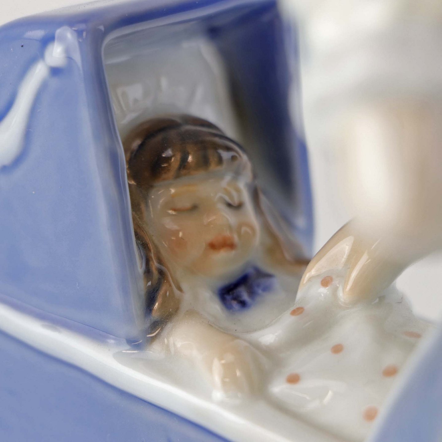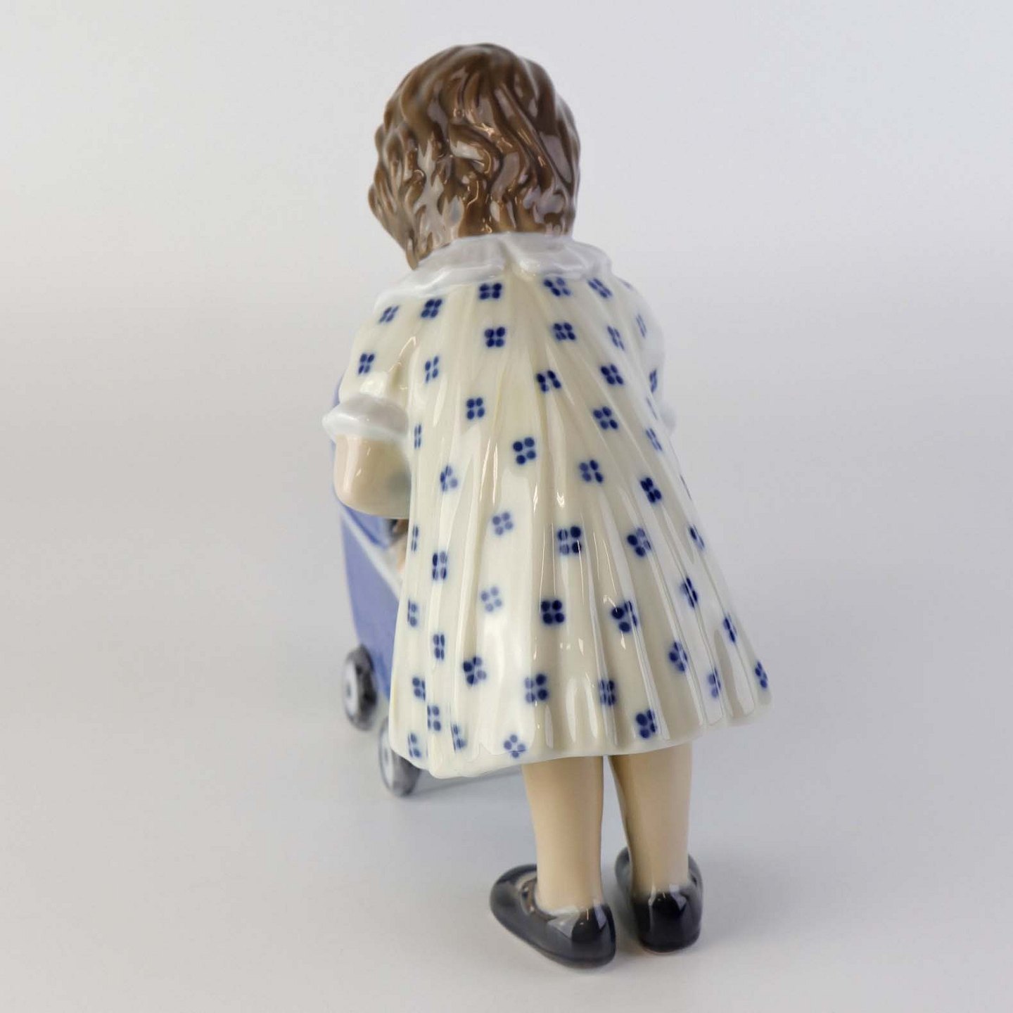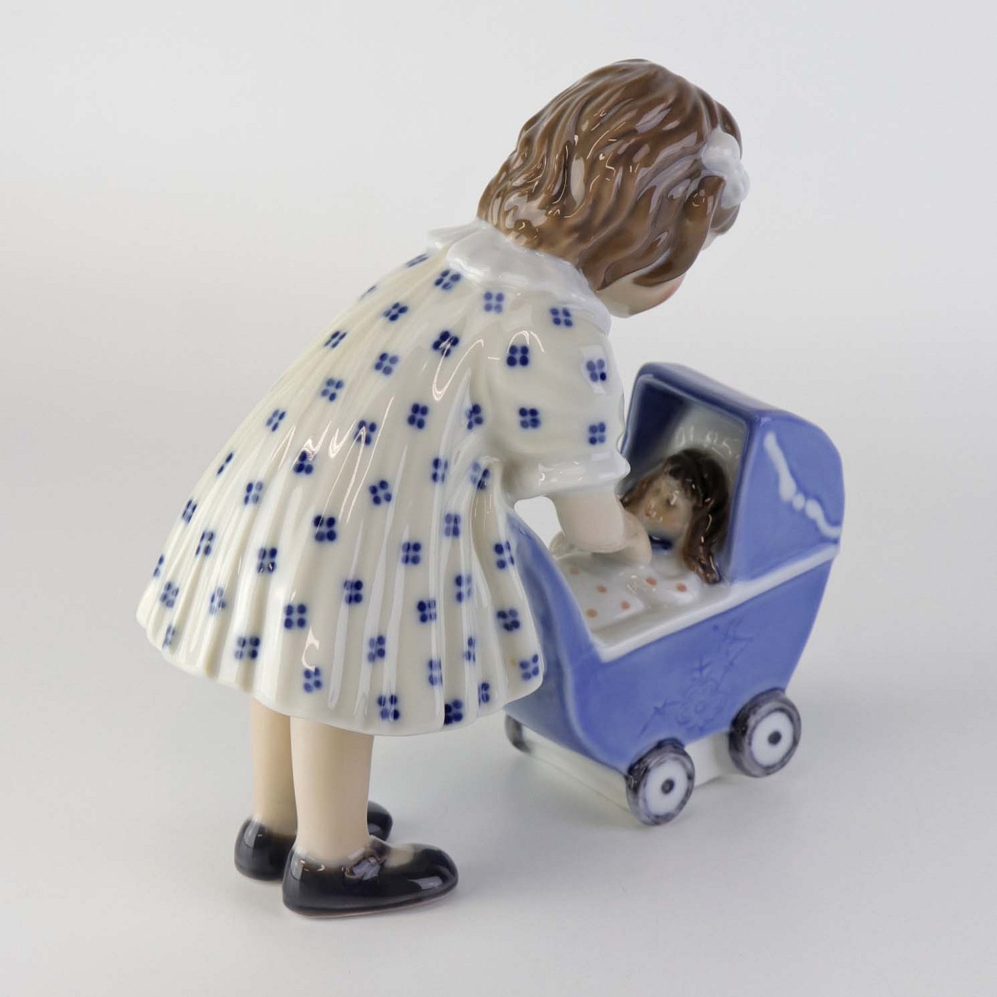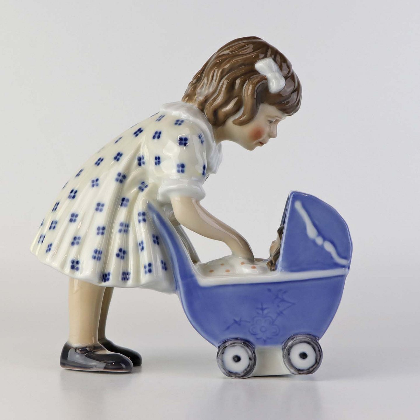 Figur i porcelæn med motiv af lille pige som tilser dukken i sin dukkevogn. Nr. 407