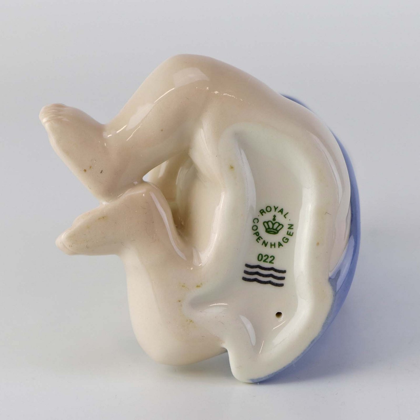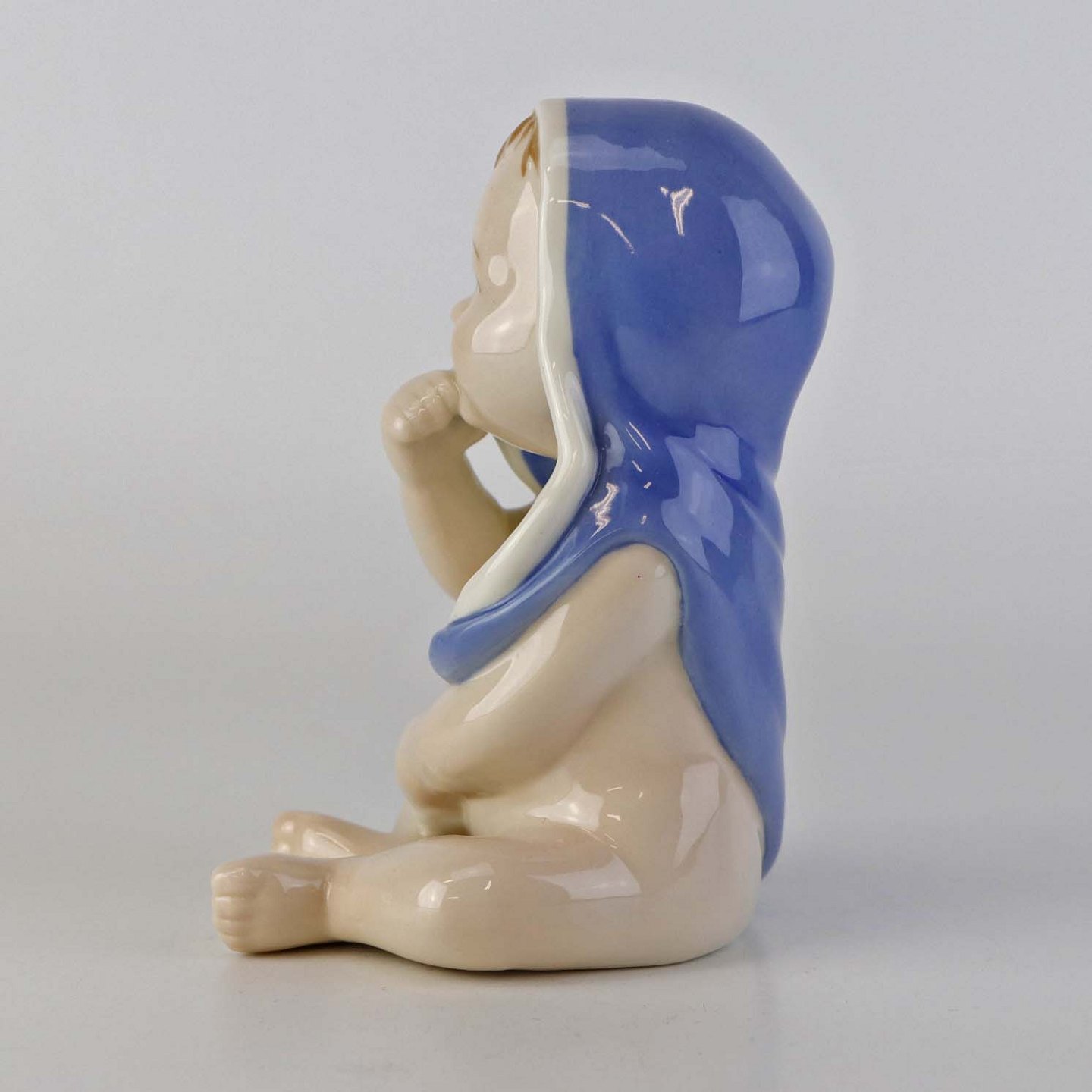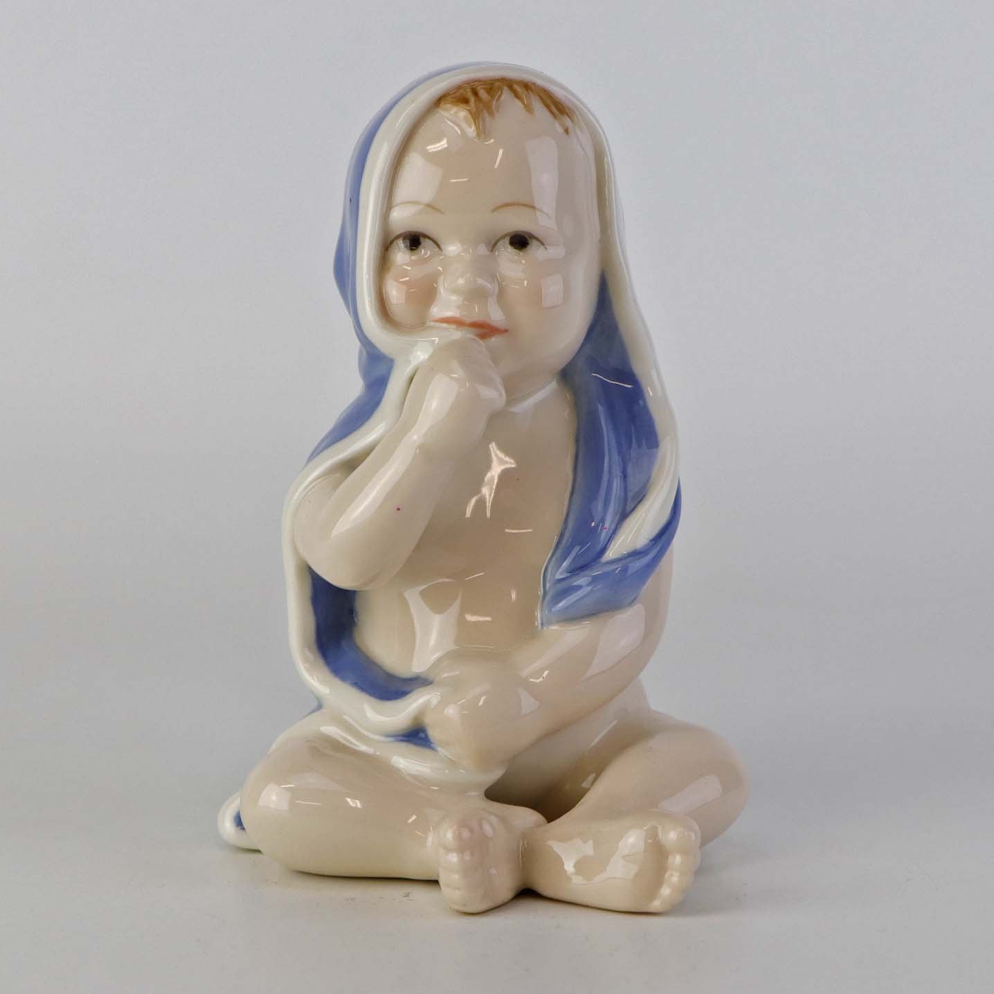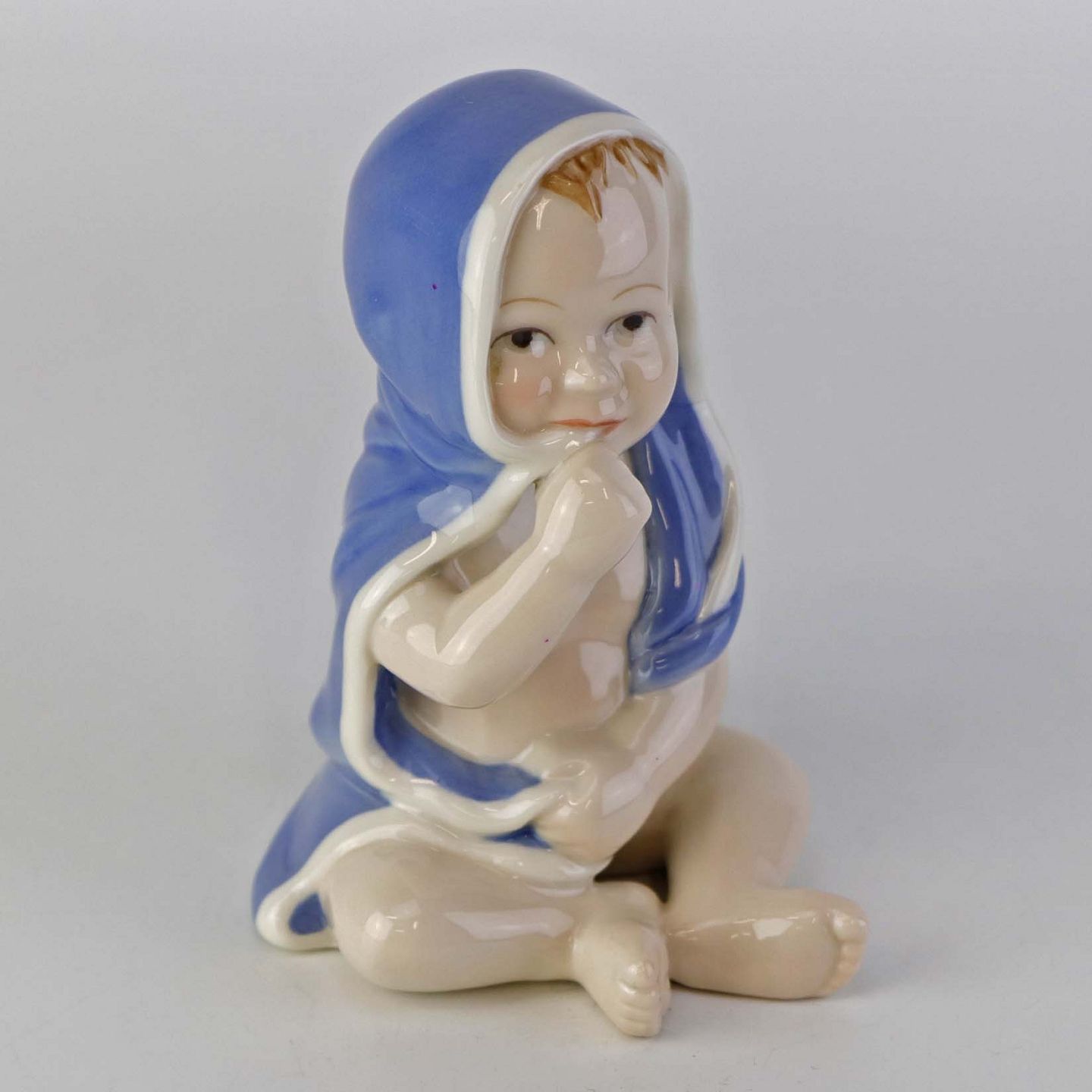 Figur i porcelæn med motiv af siddende lille dreng i sin blå badekåbe. Nr. 022