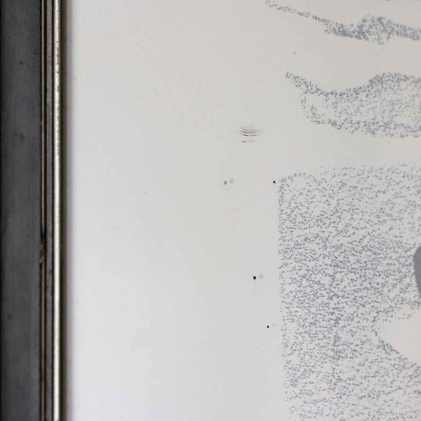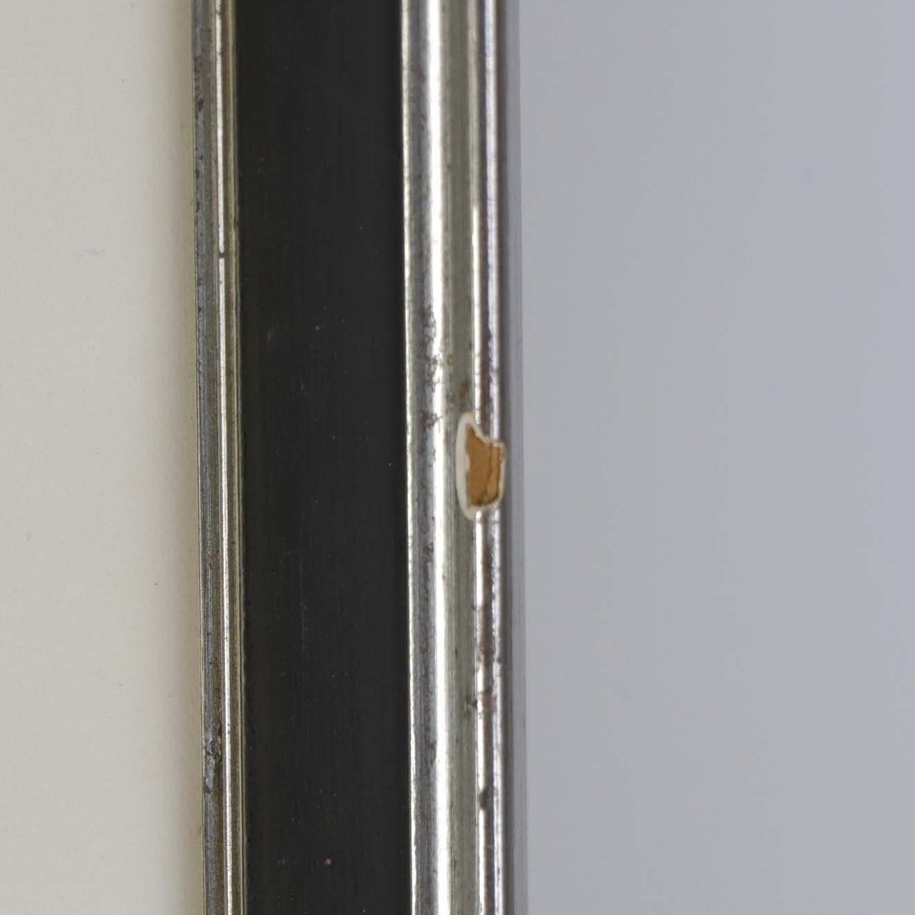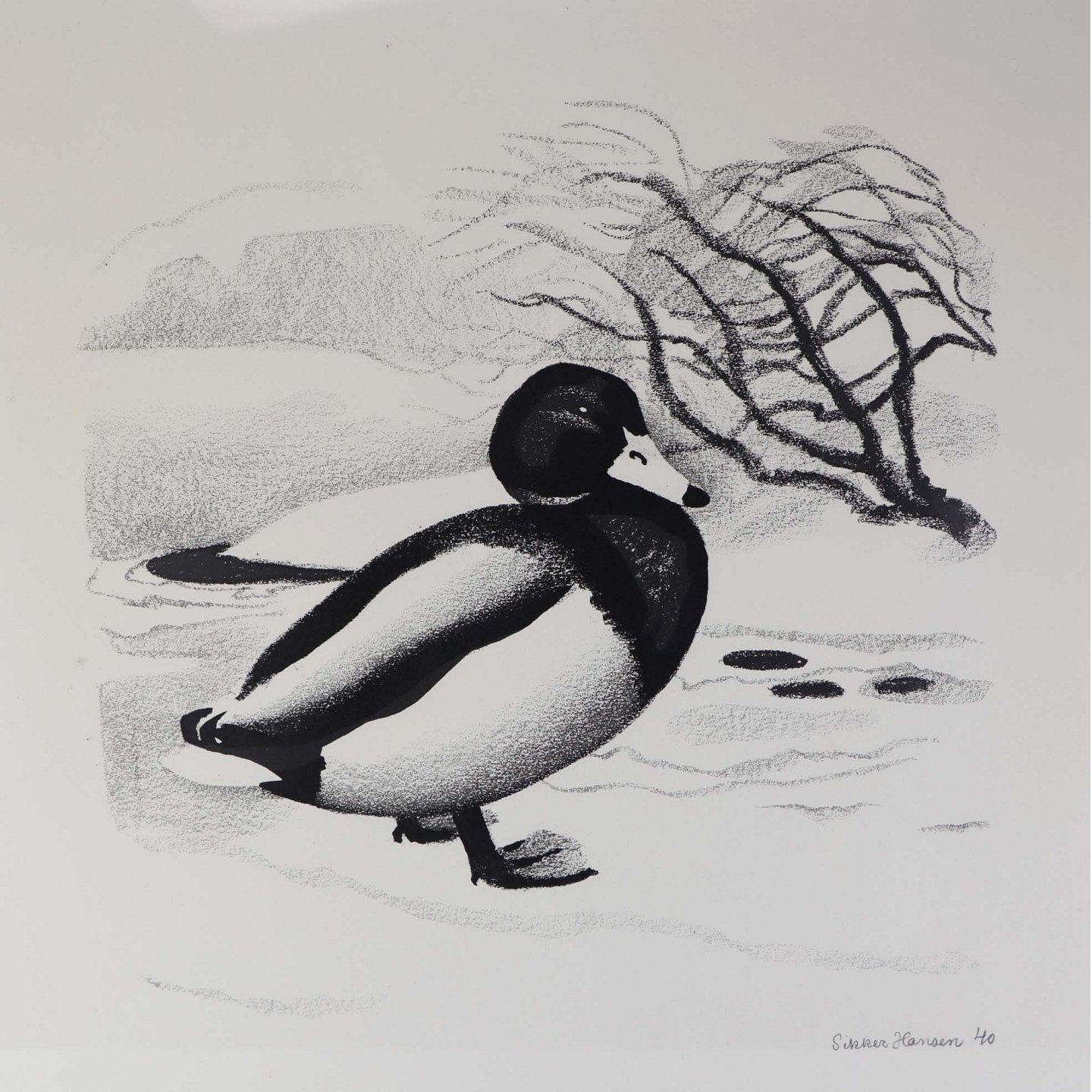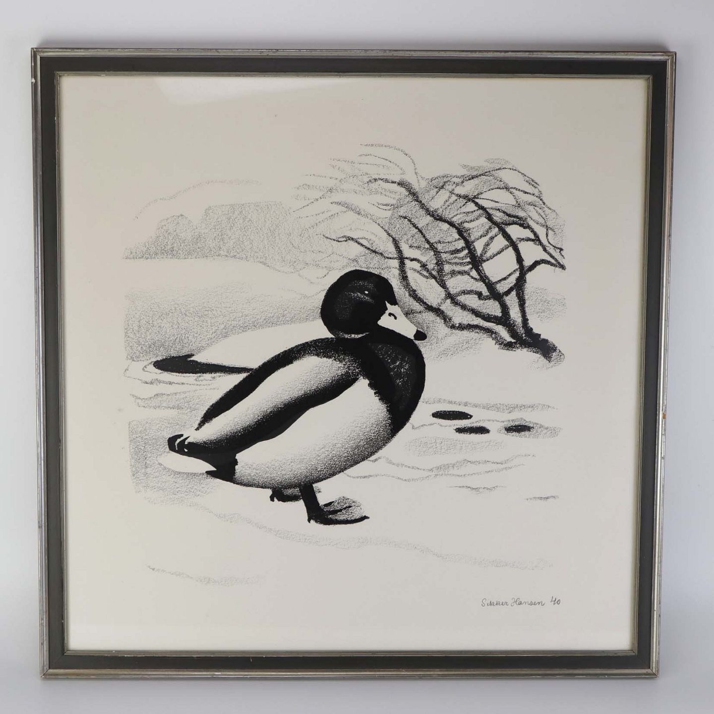Indrammet tryk i sølv- og sortmalet træramme med motiv af en andrik ved søområde.